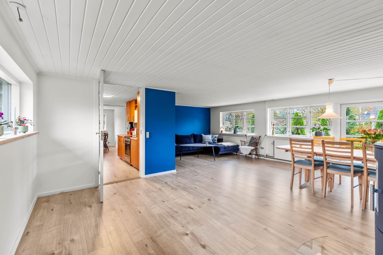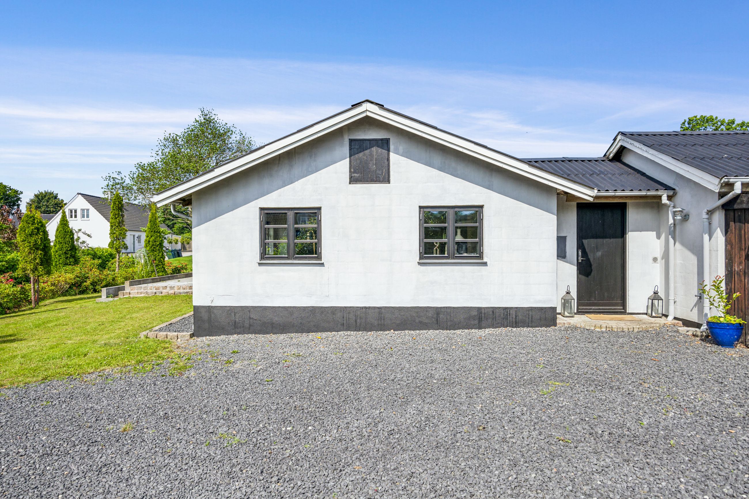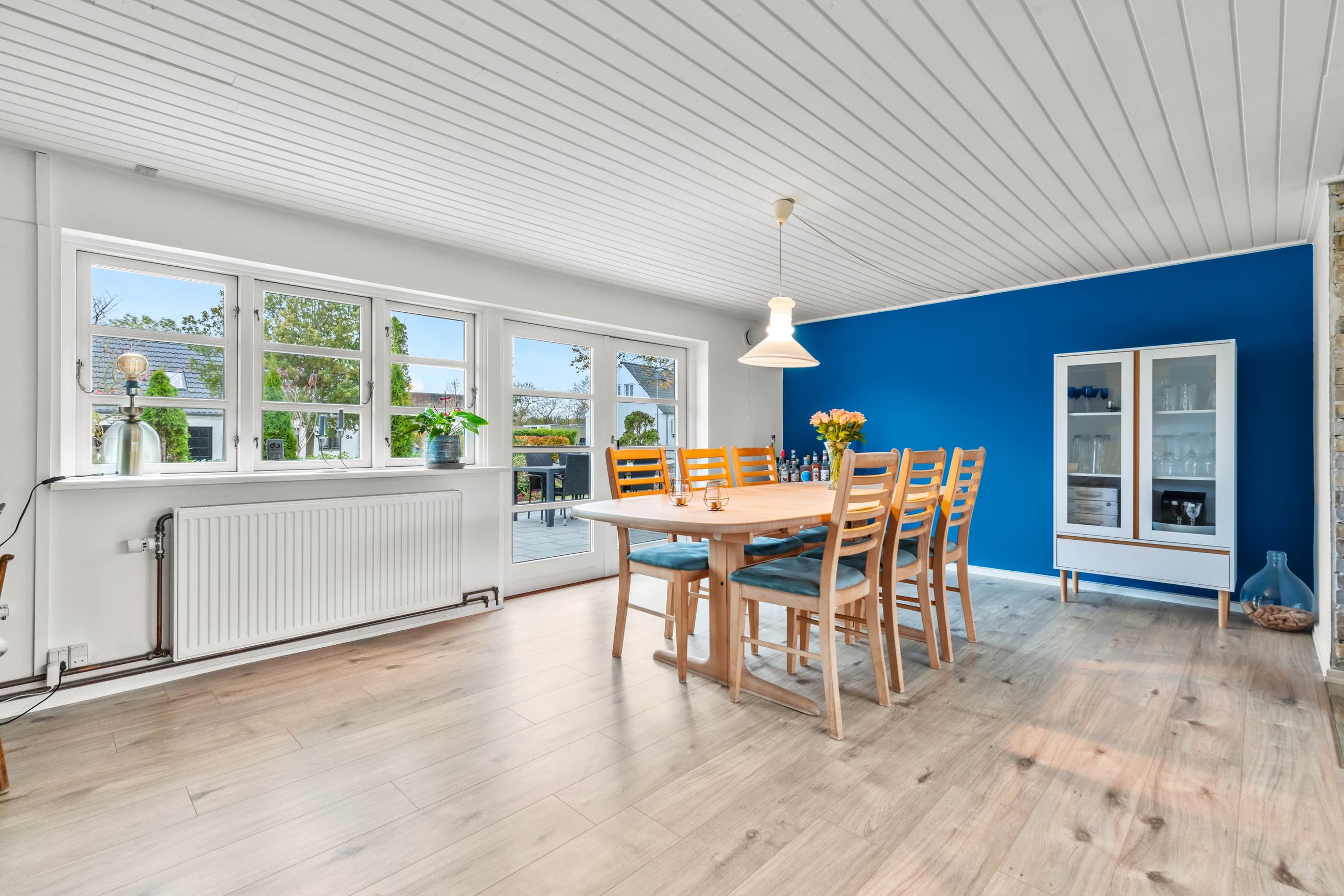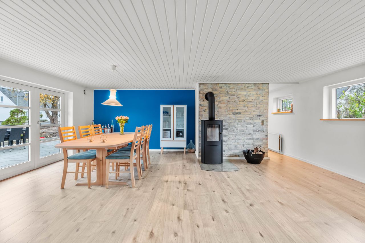 Indenfor finder du muligheden for at indrette fire rummelige værelser, hvilket gør villaen perfekt til både familier eller dem, der ønsker ekstra plads til kontor eller hobbyrum. Det hyggelige køkken har en dejlig spiseplads, hvor morgenkaffen kan nydes i ro og mag. Den store lyse stue er hjemmets hjerte med direkte adgang til en solrig terrasse – det perfekte sted at nyde lange sommeraftener.