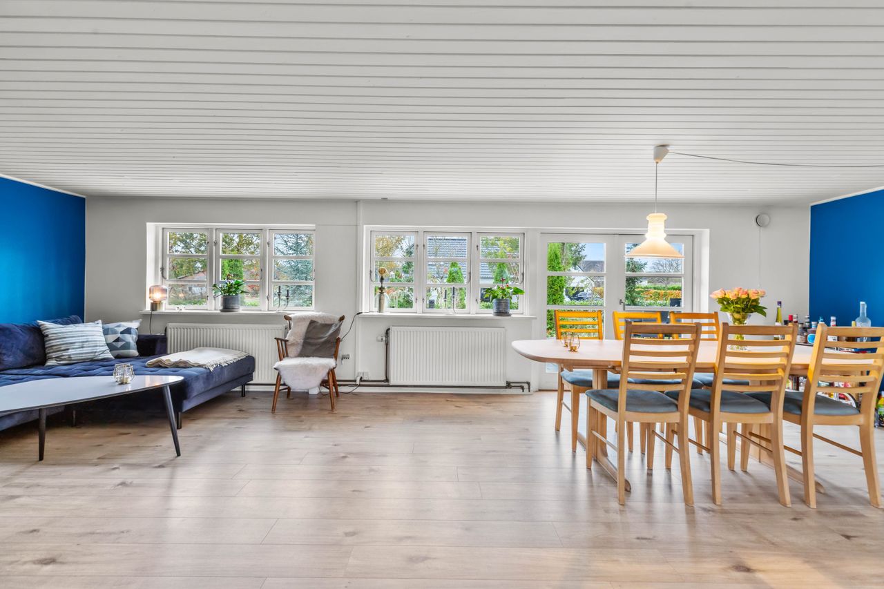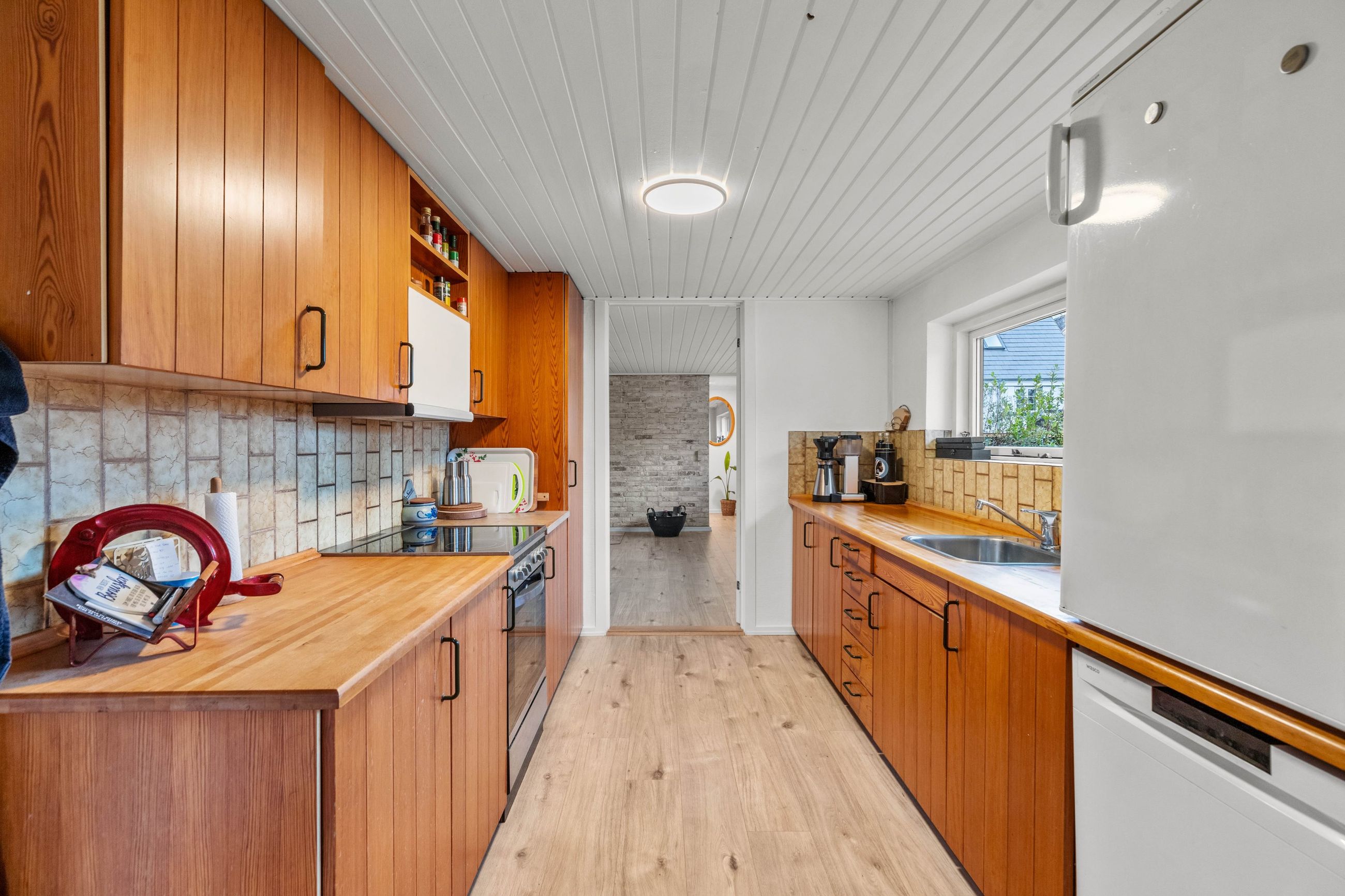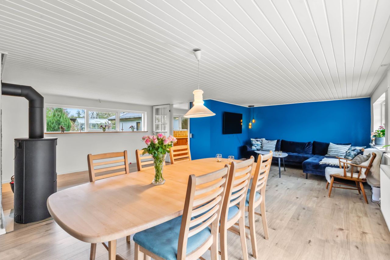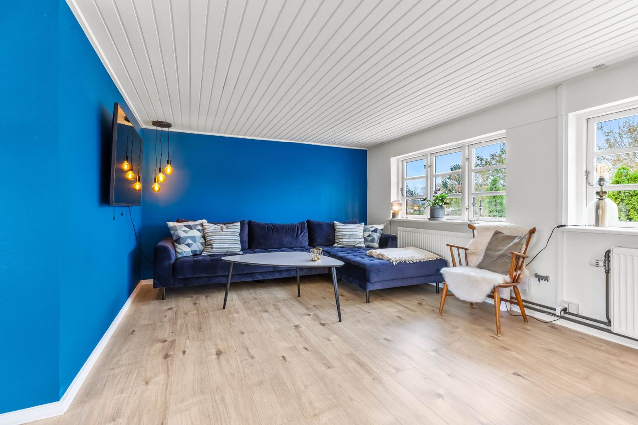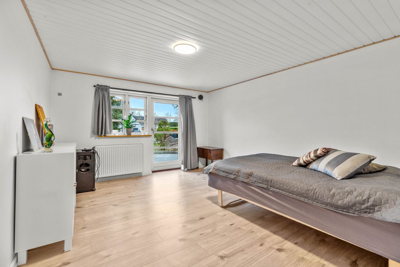 Indenfor finder du muligheden for at indrette fire rummelige værelser, hvilket gør villaen perfekt til både familier eller dem, der ønsker ekstra plads til kontor eller hobbyrum. Det hyggelige køkken har en dejlig spiseplads, hvor morgenkaffen kan nydes i ro og mag. Den store lyse stue er hjemmets hjerte med direkte adgang til en solrig terrasse – det perfekte sted at nyde lange sommeraftener.