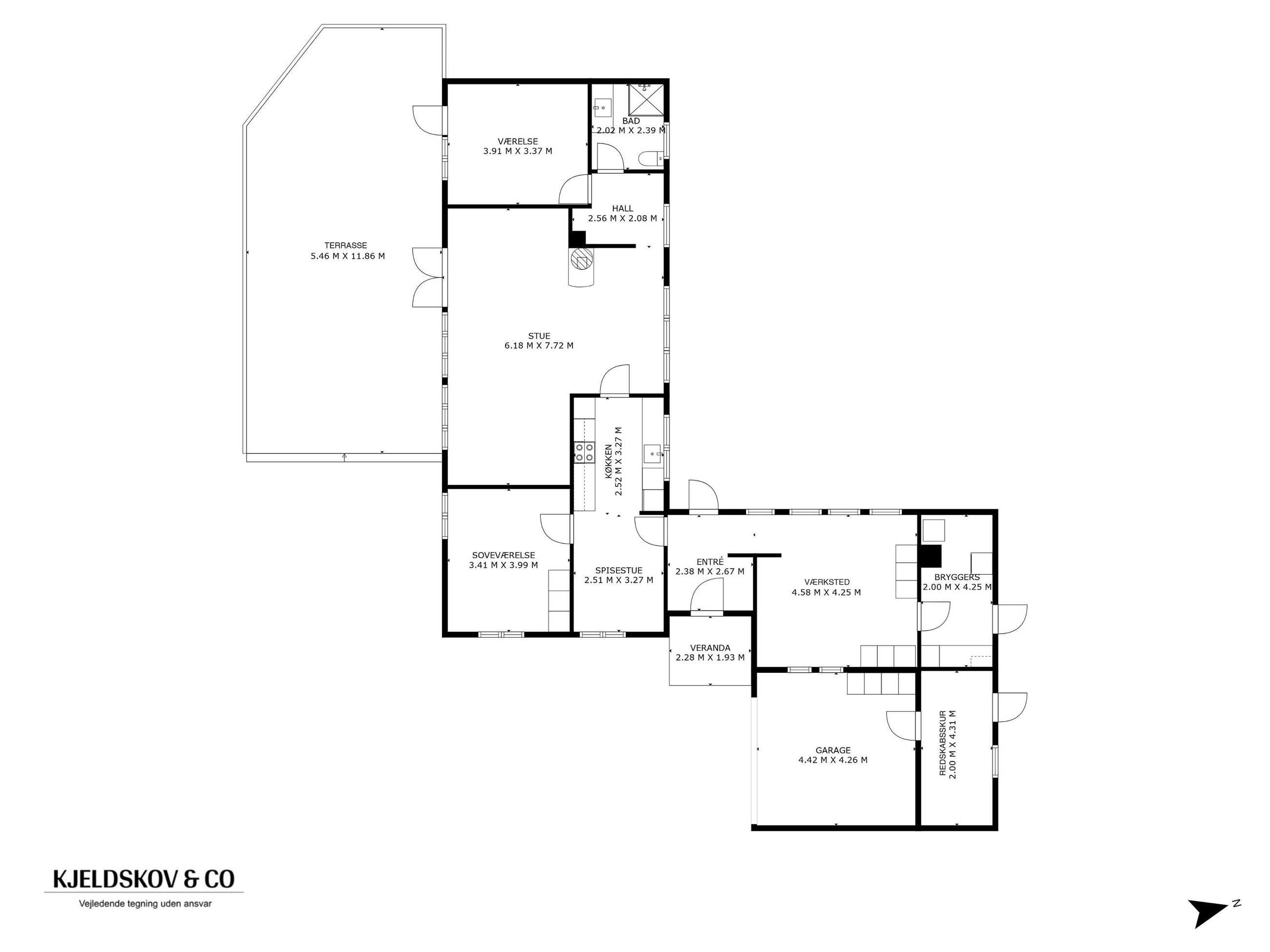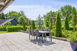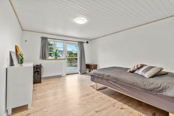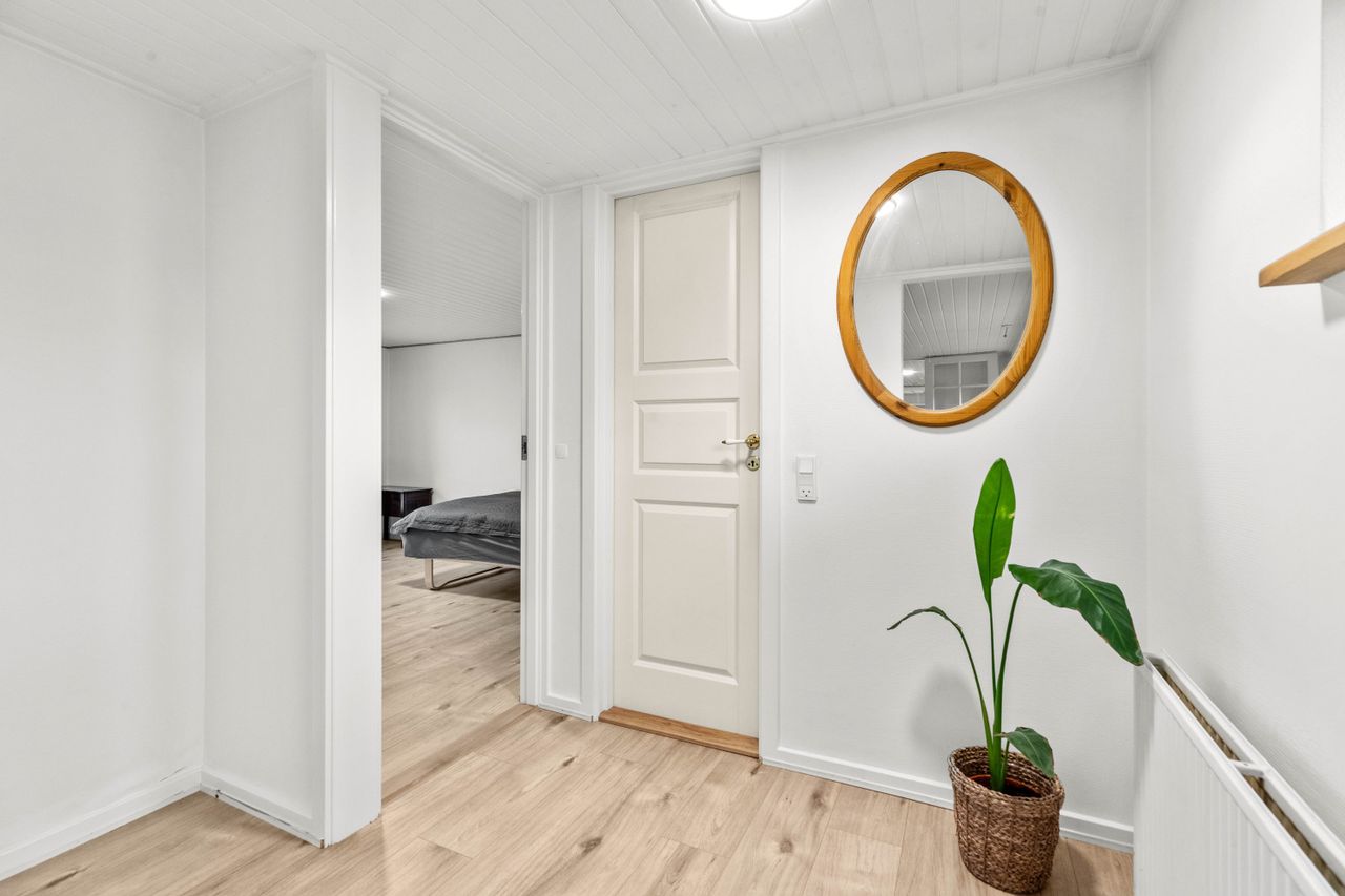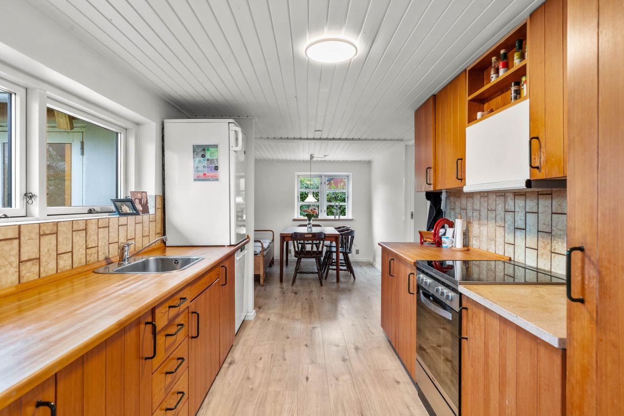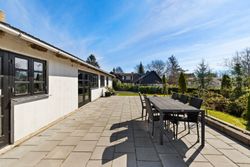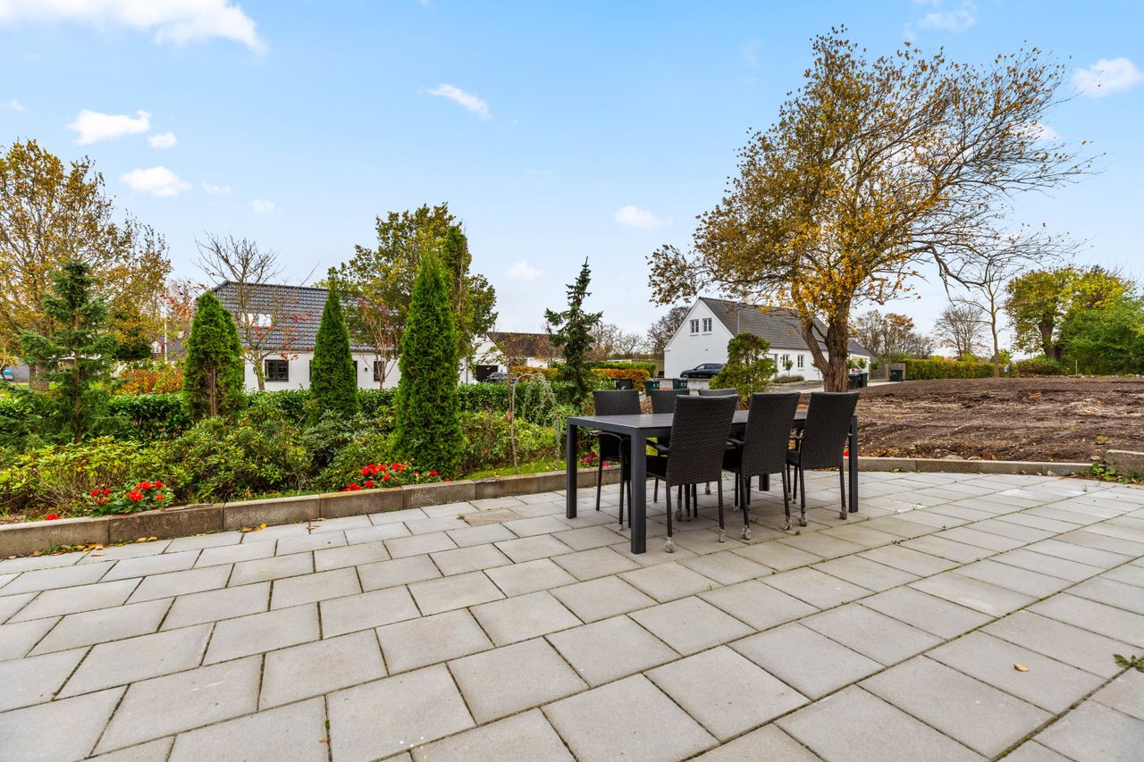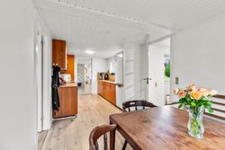 Indenfor finder du muligheden for at indrette fire rummelige værelser, hvilket gør villaen perfekt til både familier eller dem, der ønsker ekstra plads til kontor eller hobbyrum. Det hyggelige køkken har en dejlig spiseplads, hvor morgenkaffen kan nydes i ro og mag. Den store lyse stue er hjemmets hjerte med direkte adgang til en solrig terrasse – det perfekte sted at nyde lange sommeraftener.