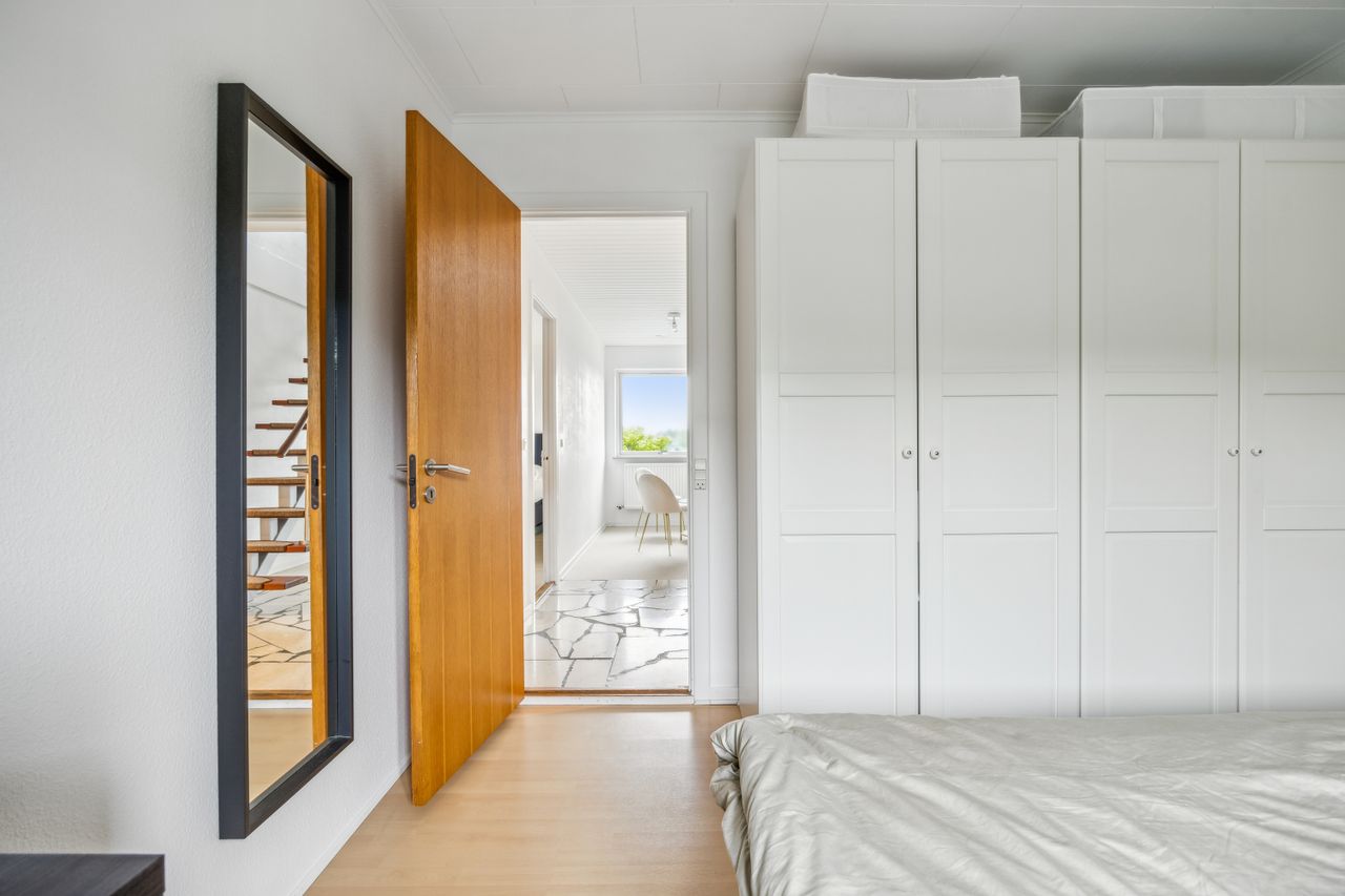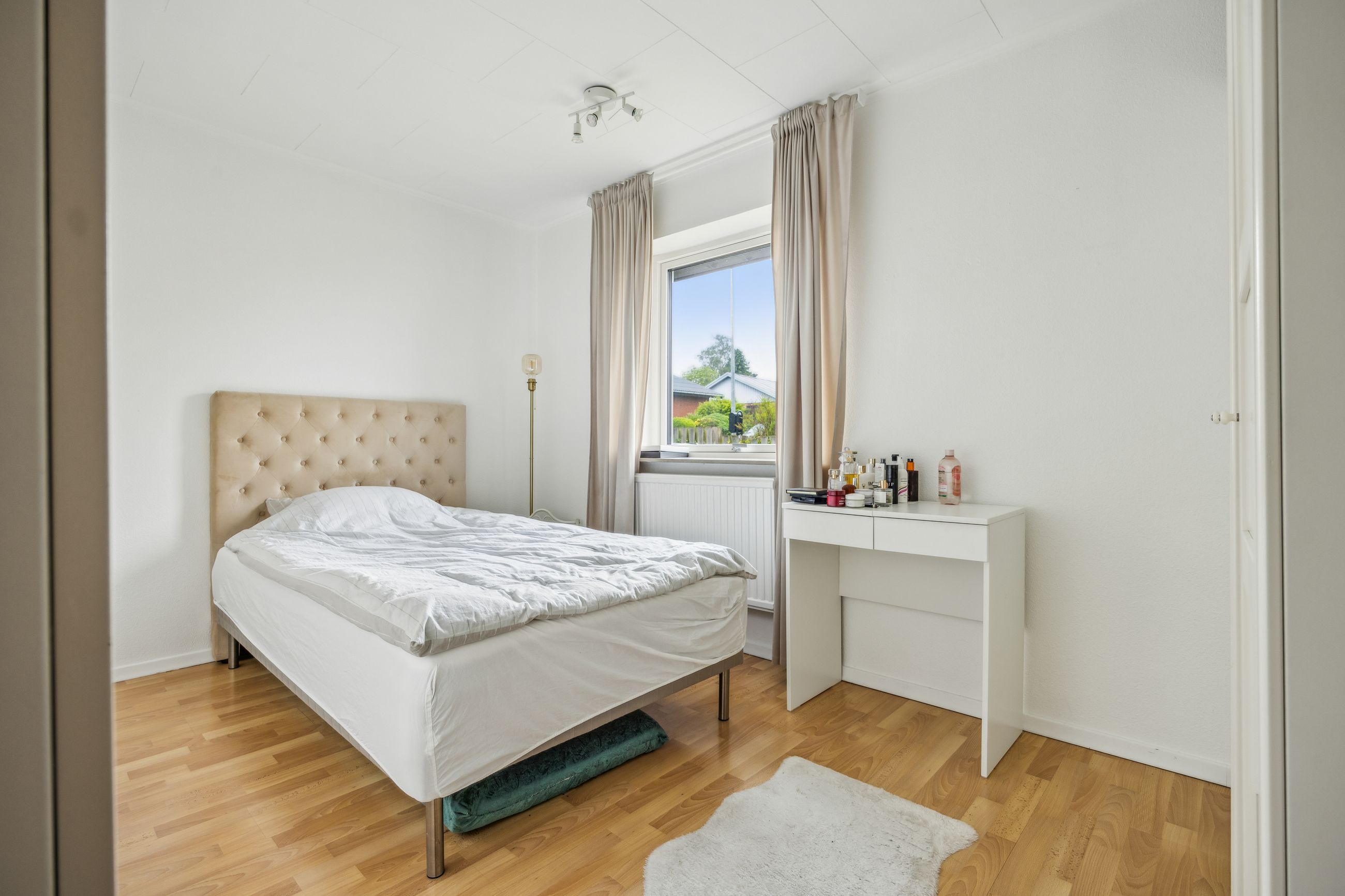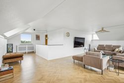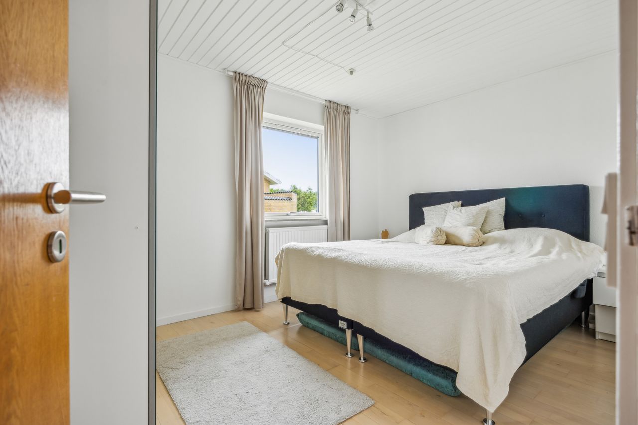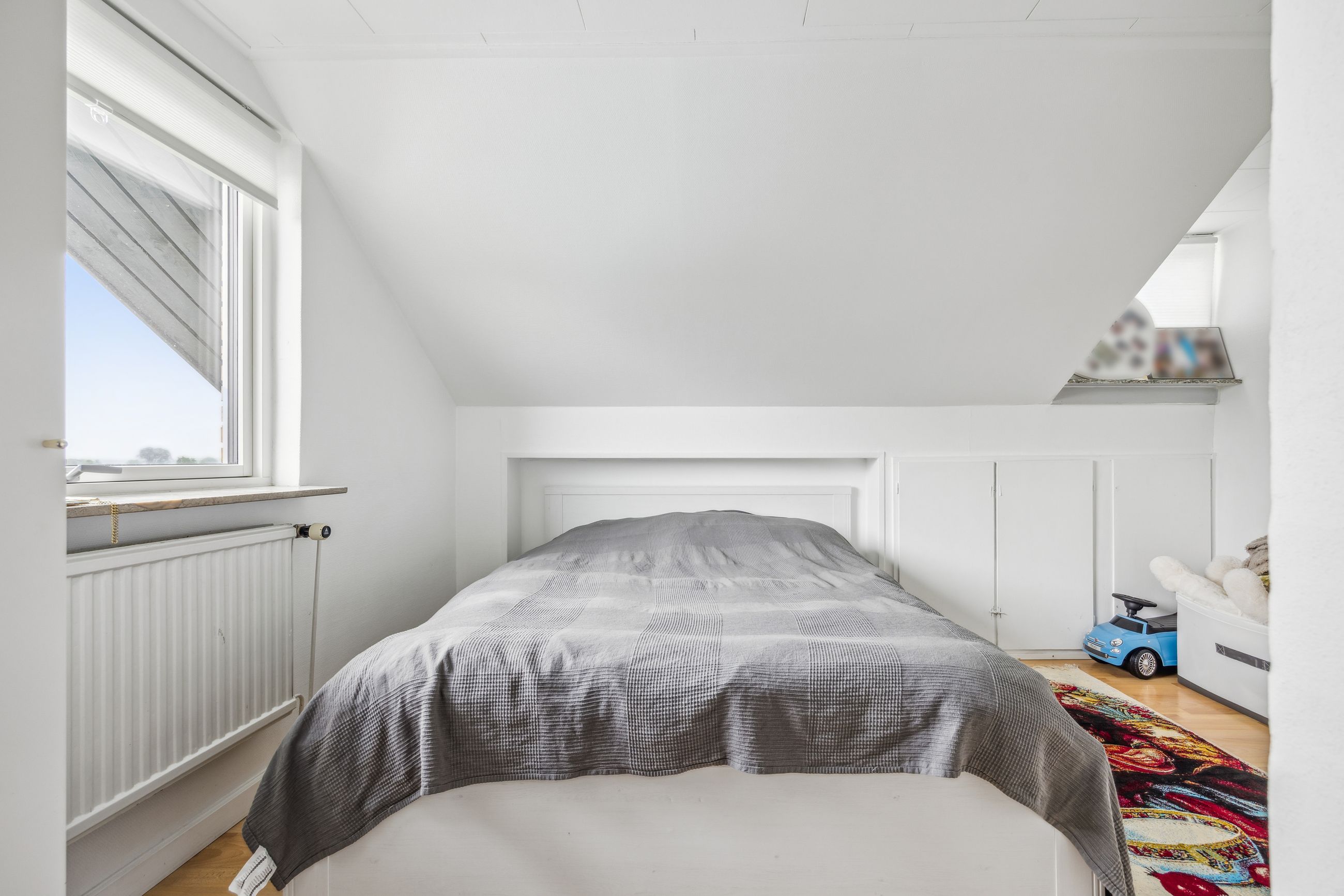 Stueplan byder desuden på tre gode værelser samt et stilfuldt badeværelse. På første sal finder du en stor stue med nyere gulve samt forældreafdelingen med eget badeværelse – perfekt som privat retreat for husets voksne beboere.