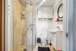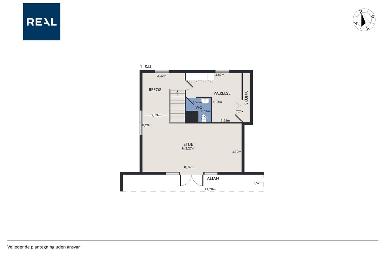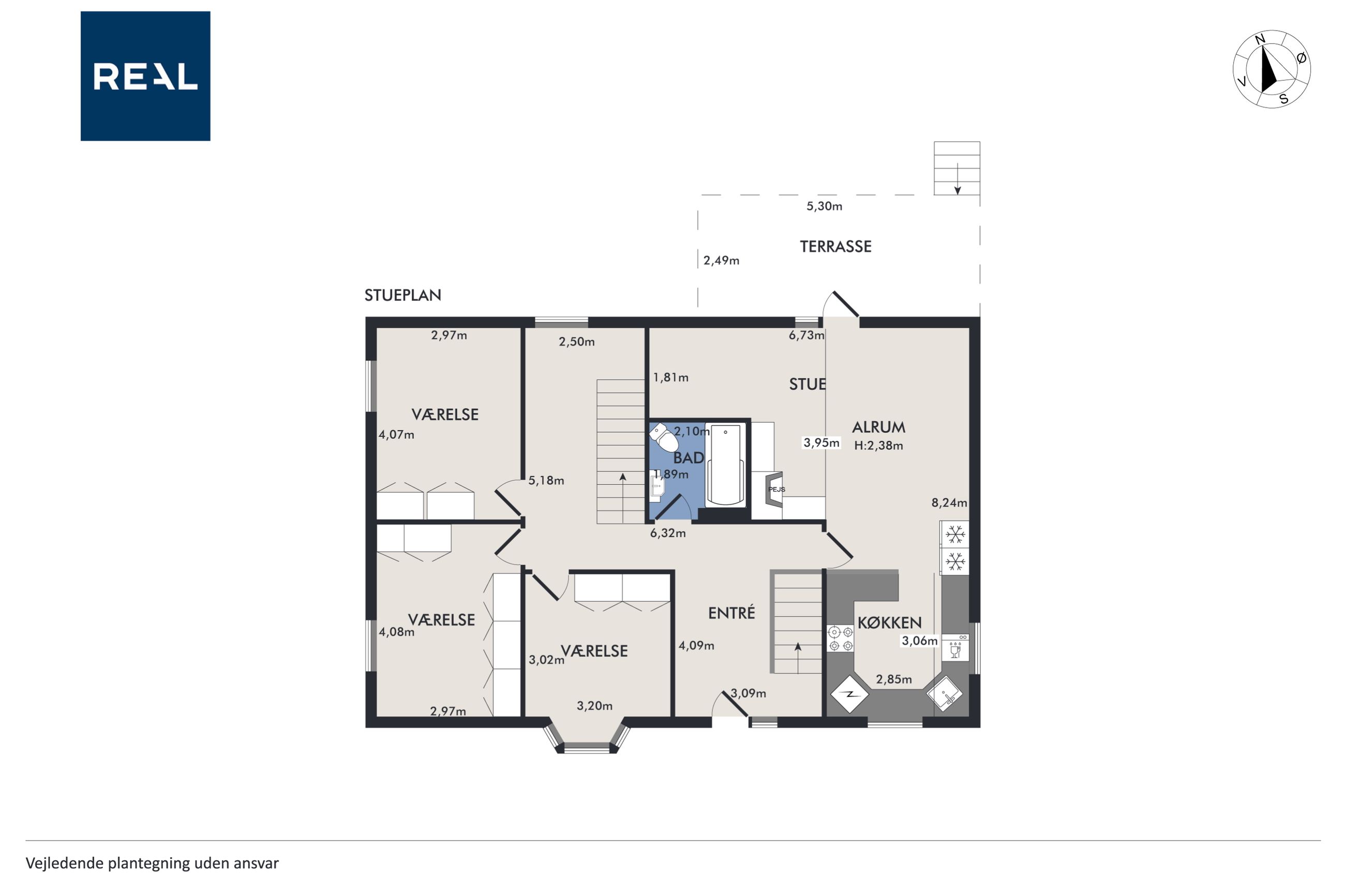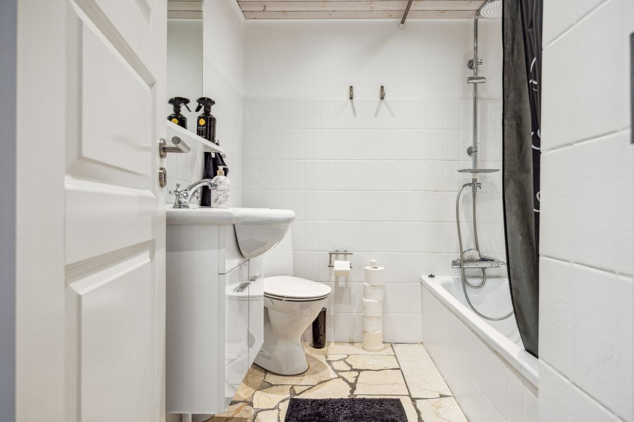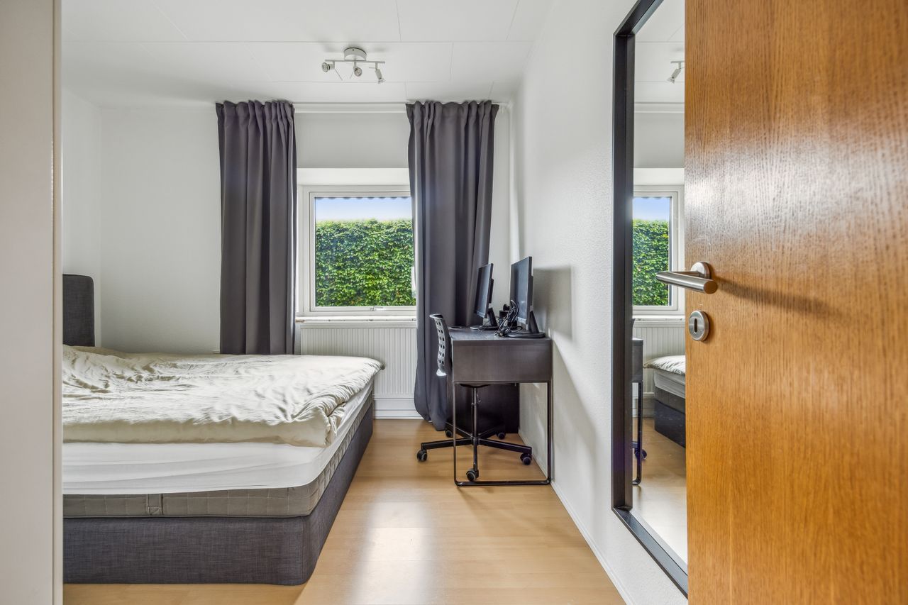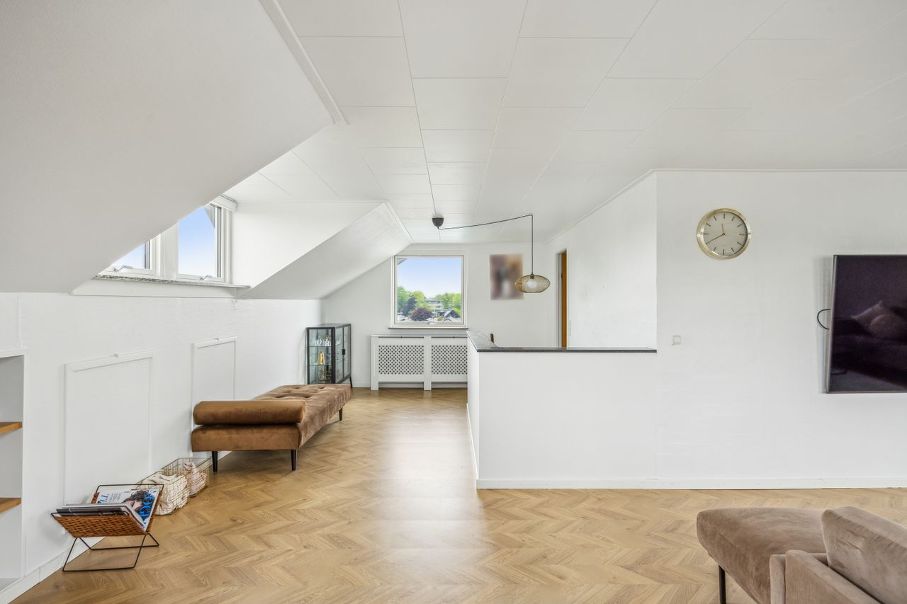 Stueplan byder desuden på tre gode værelser samt et stilfuldt badeværelse. På første sal finder du en stor stue med nyere gulve samt forældreafdelingen med eget badeværelse – perfekt som privat retreat for husets voksne beboere.