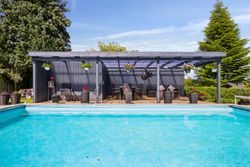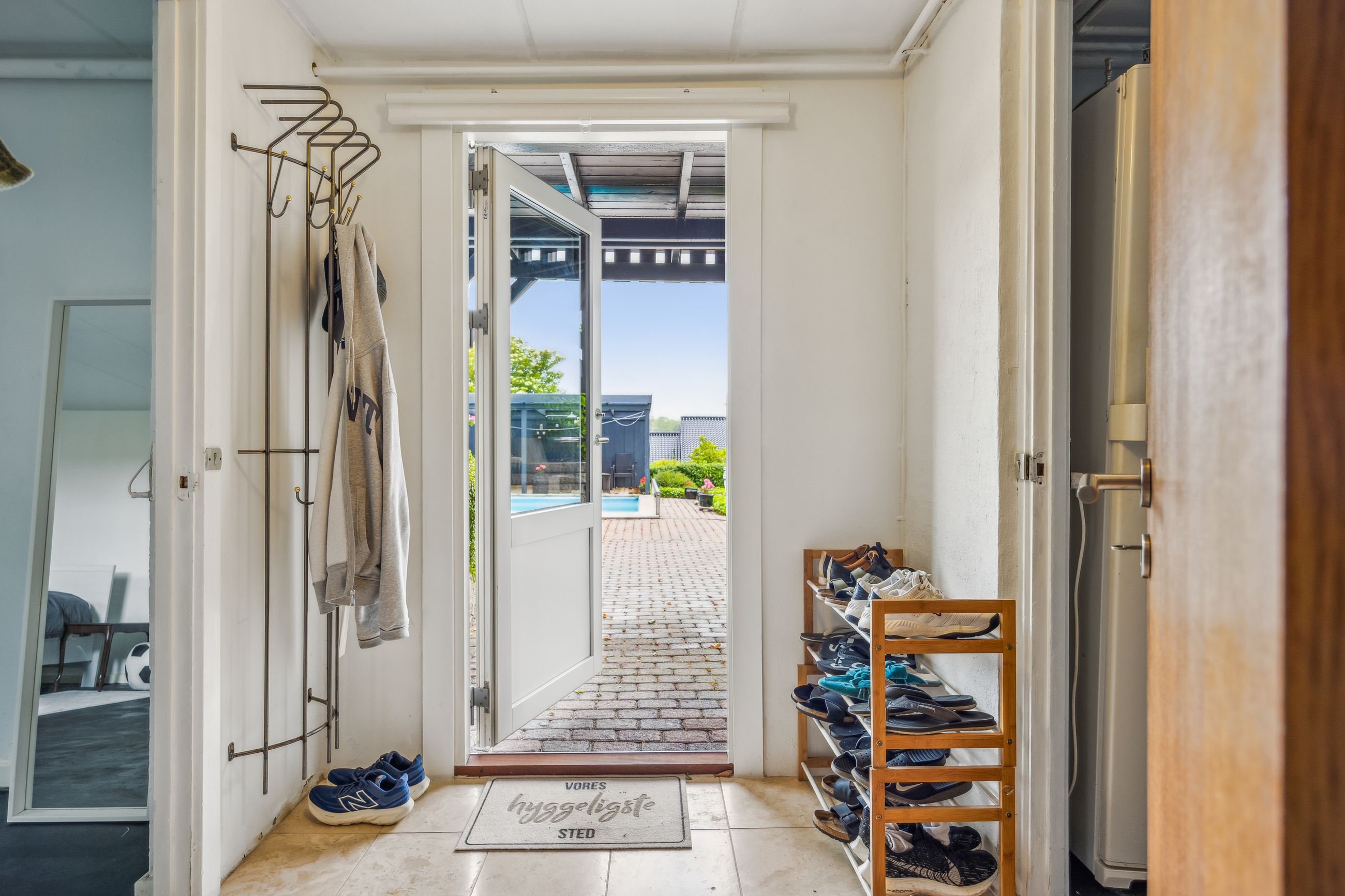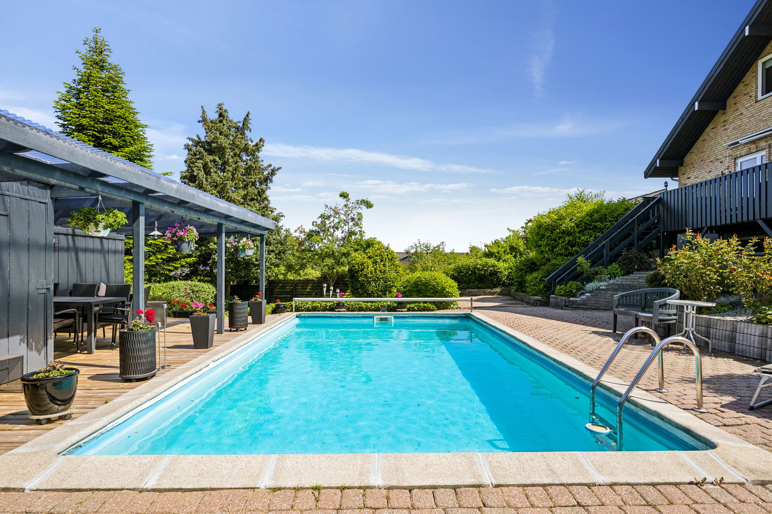 Udenfor venter haven udover det sædvanlige – en sand oase bestående af forskudte miljøer, der inviterer til afslapning og leg året rundt. Poolen tilbyder svalende dyp på varme sommerdage, mens terrassen er ideel til grillfester eller stille aftener under åben himmel.