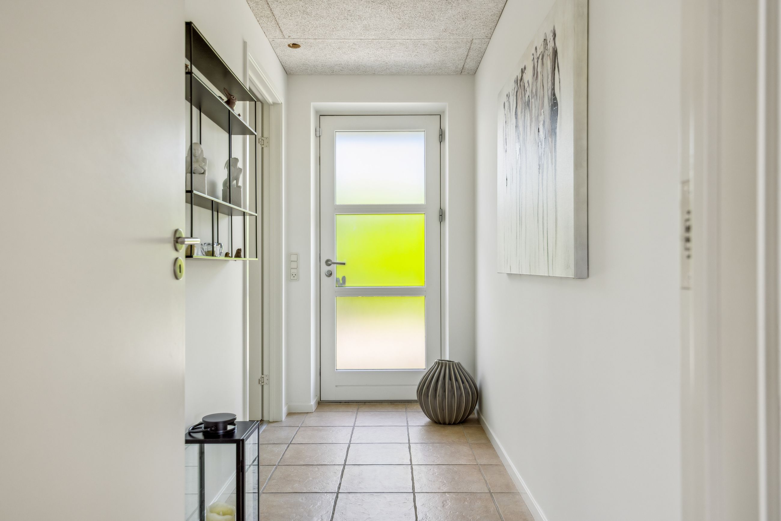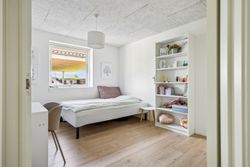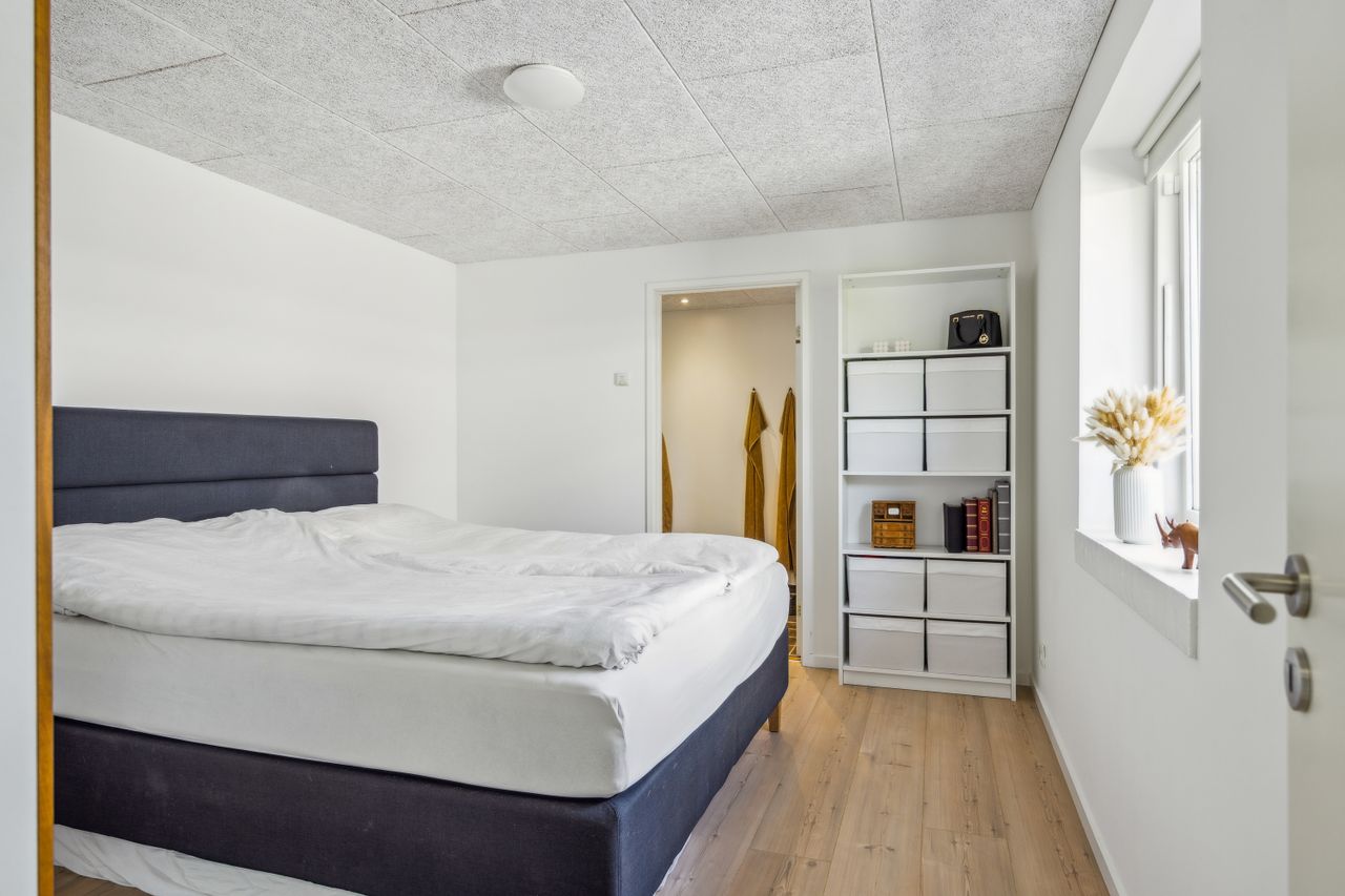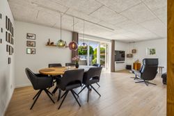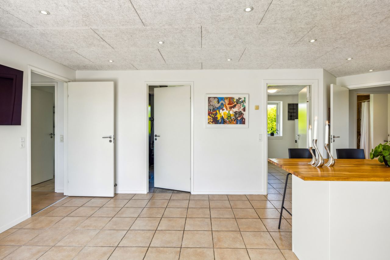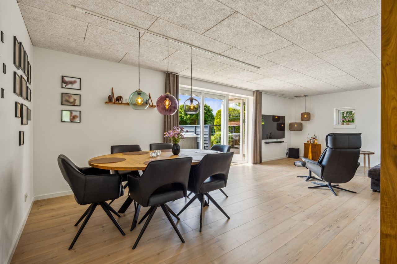 Med gulvvarme i hele huset sikres et behageligt indeklima året rundt. Loftet prydes af troldtekt-plader, der bidrager til den moderne stil samtidig med at forbedre akustikken.