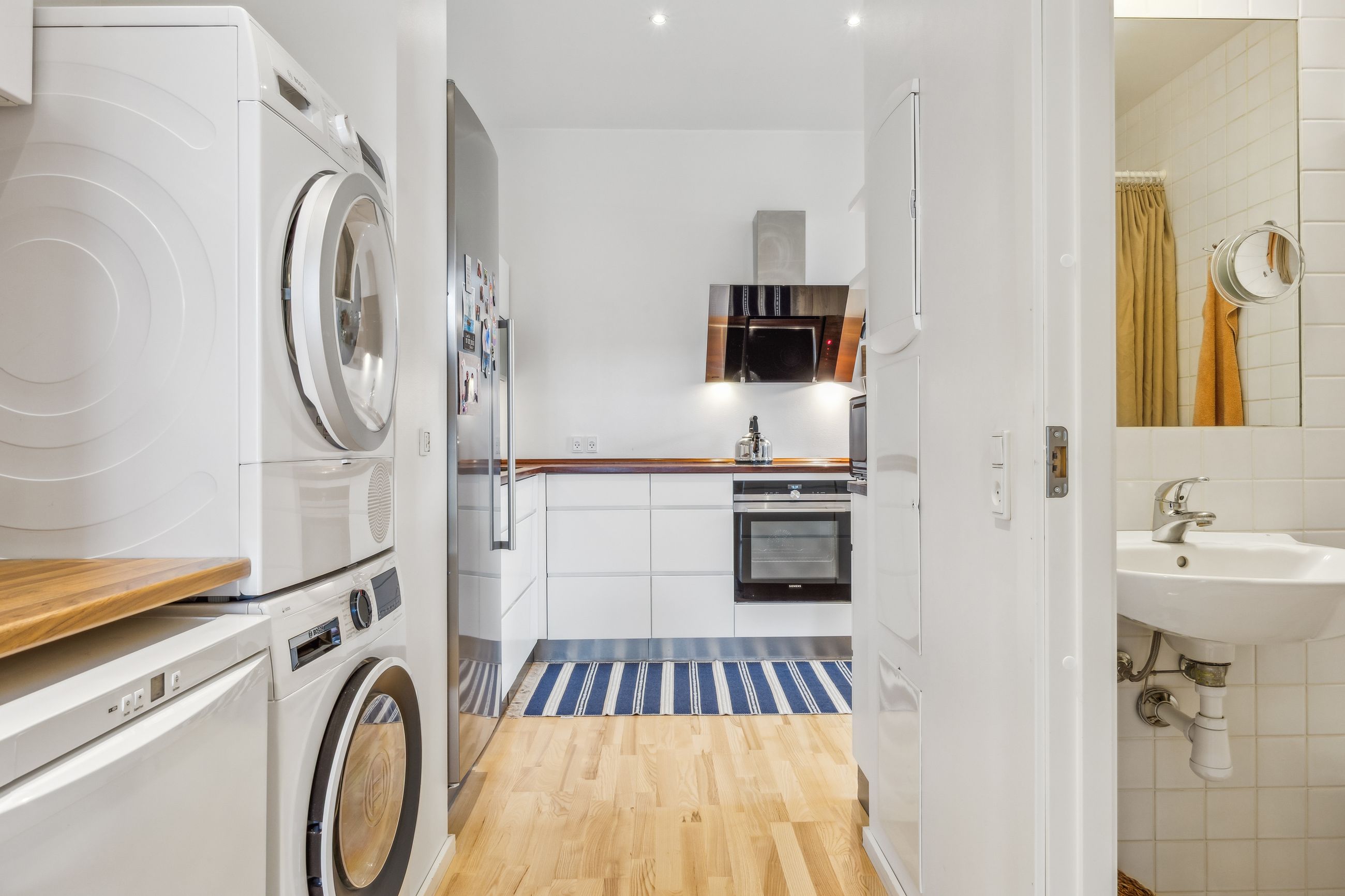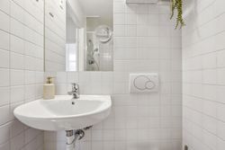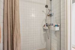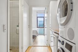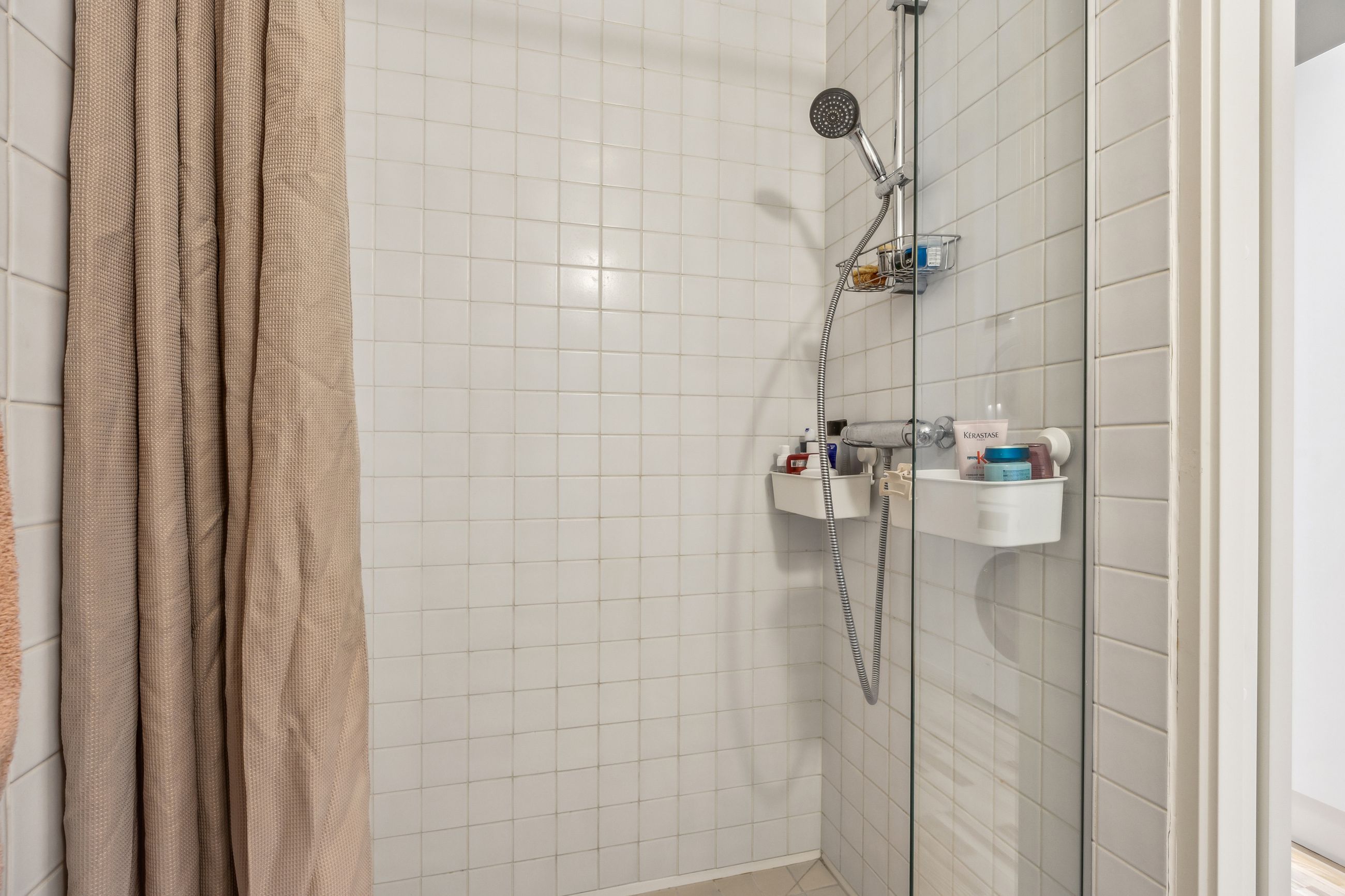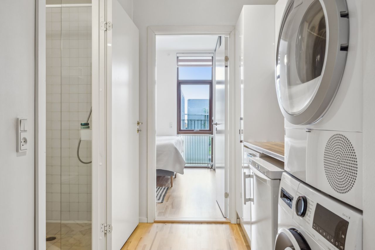 Badeværelset fremstår pænt med brus samt gulvvarme for ekstra komfort på de kolde dage. I forlængelse af køkkenet finder du et praktisk bryggers udstyret med vaskemaskine samt opbevaringsmuligheder – perfekt til den travle hverdag.