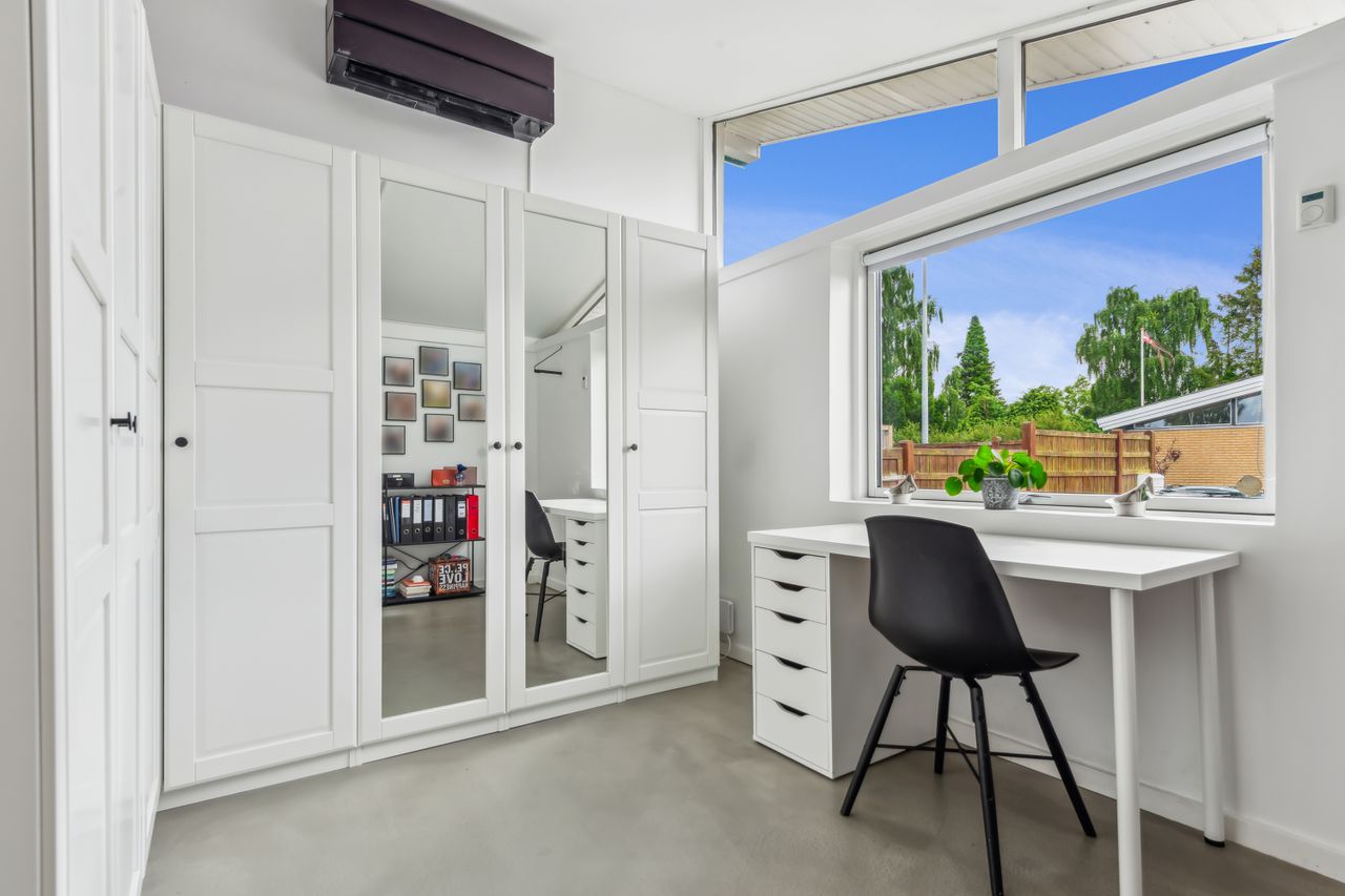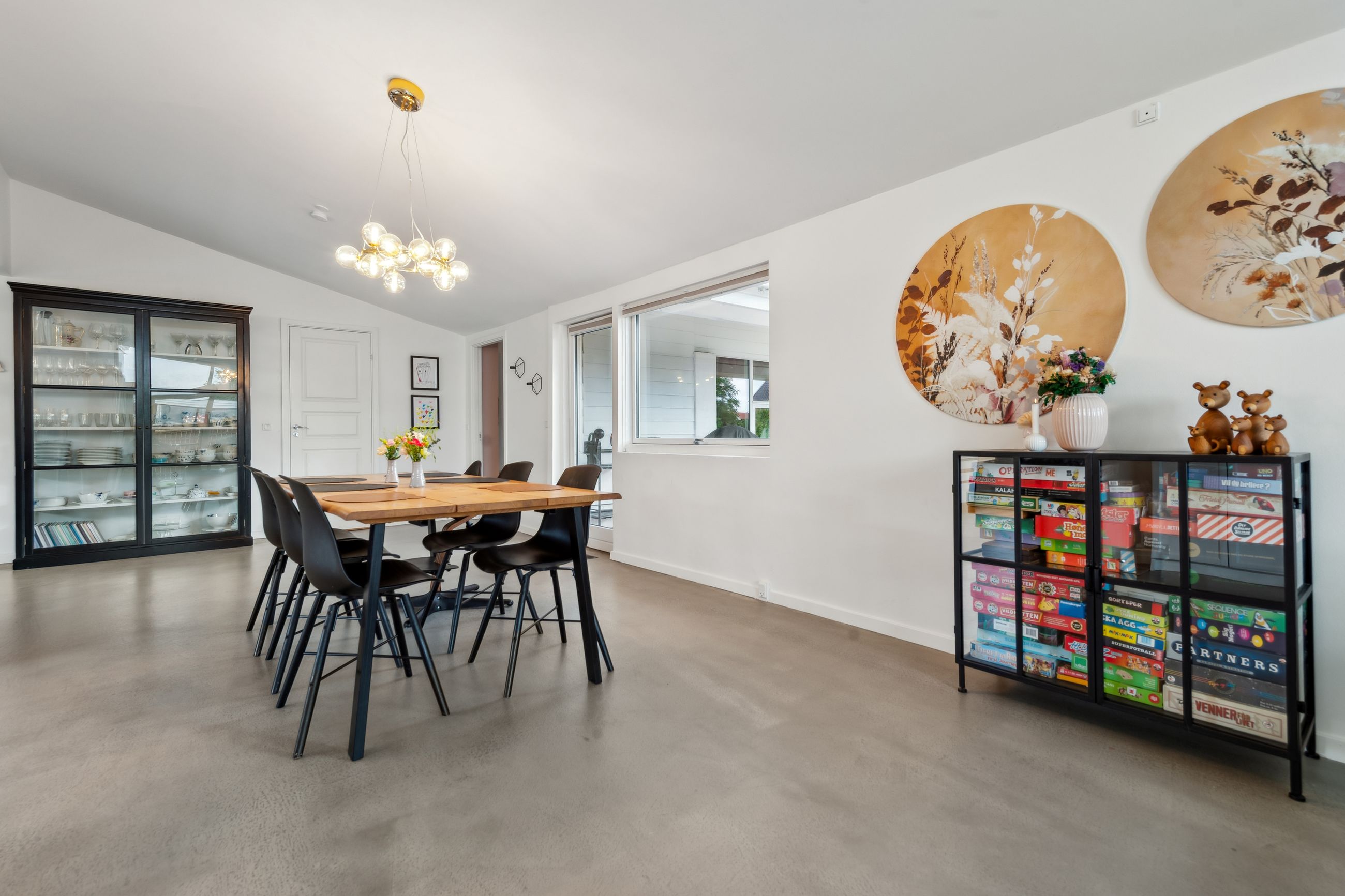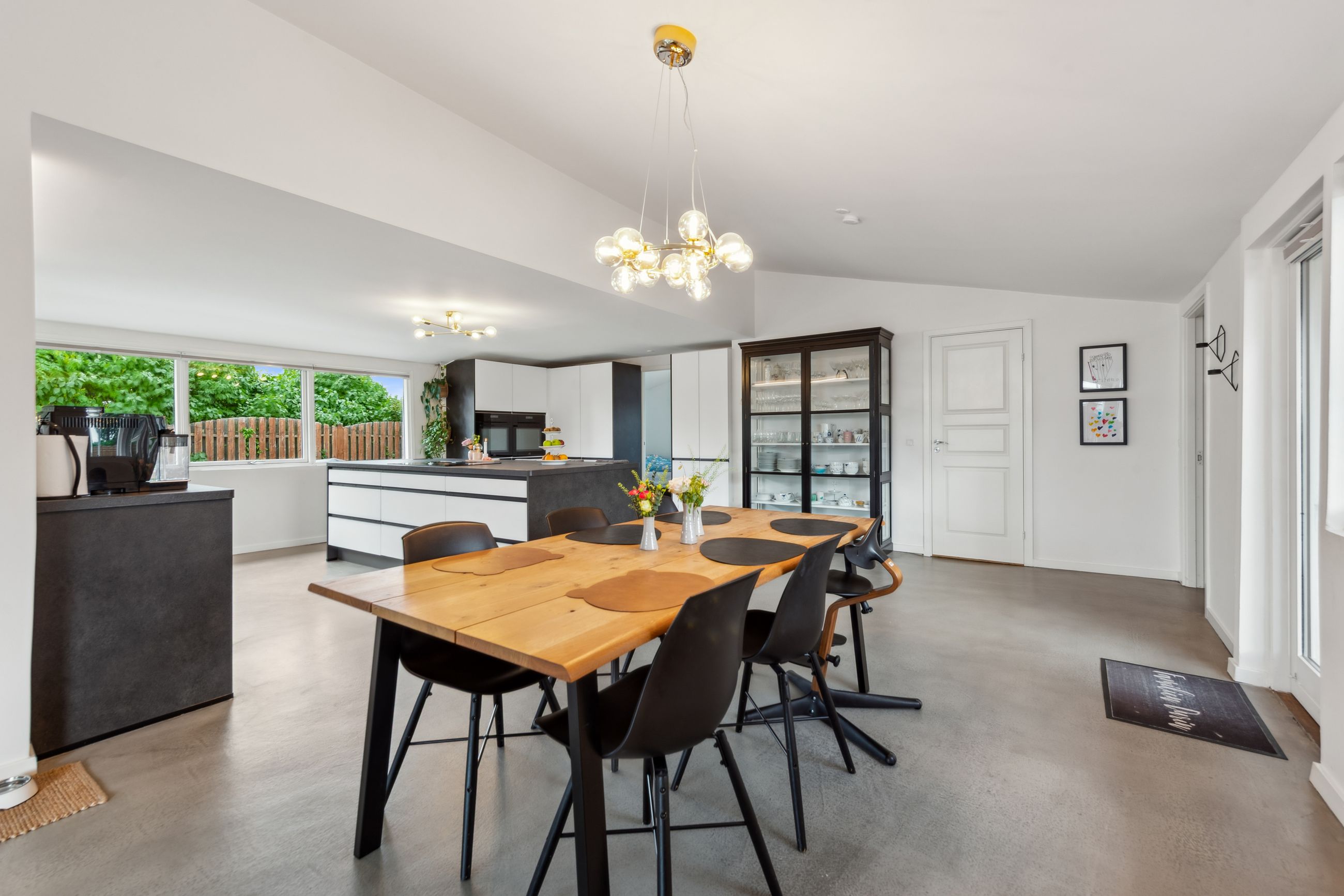 Boligen fremstår indflytningsklar og er gennemgående opdateret med blandt andet betonlignende gulv og behagelig gulvvarme i alle rum, hvilket skaber et ensartet og moderne udtryk. Det naturlige lys strømmer ind gennem de store vinduespartier, og i stueområdet får du en særlig rumfornemmelse takket være loft til kip, som giver luft og arkitektonisk karakter til boligens hjerterum.