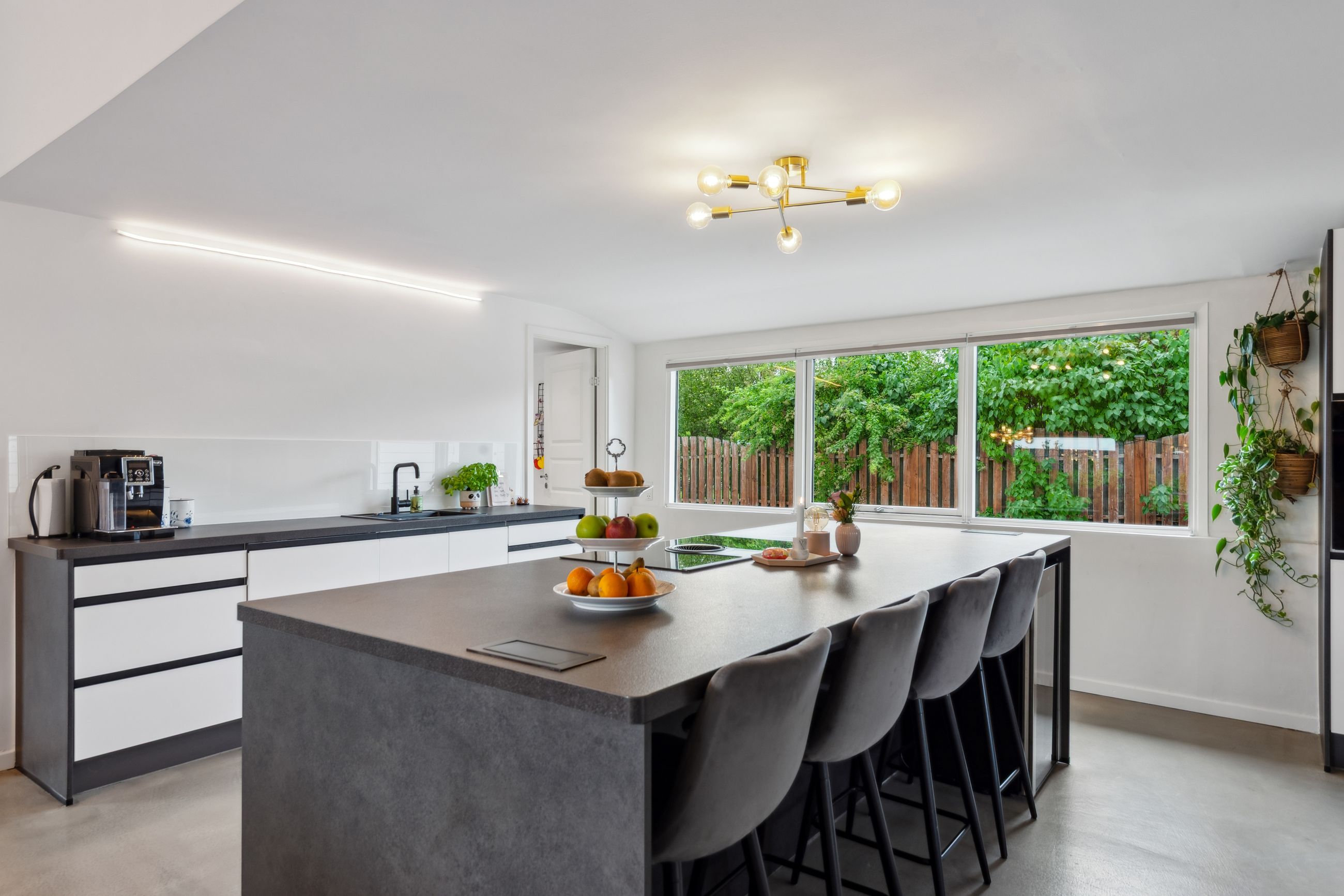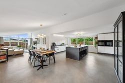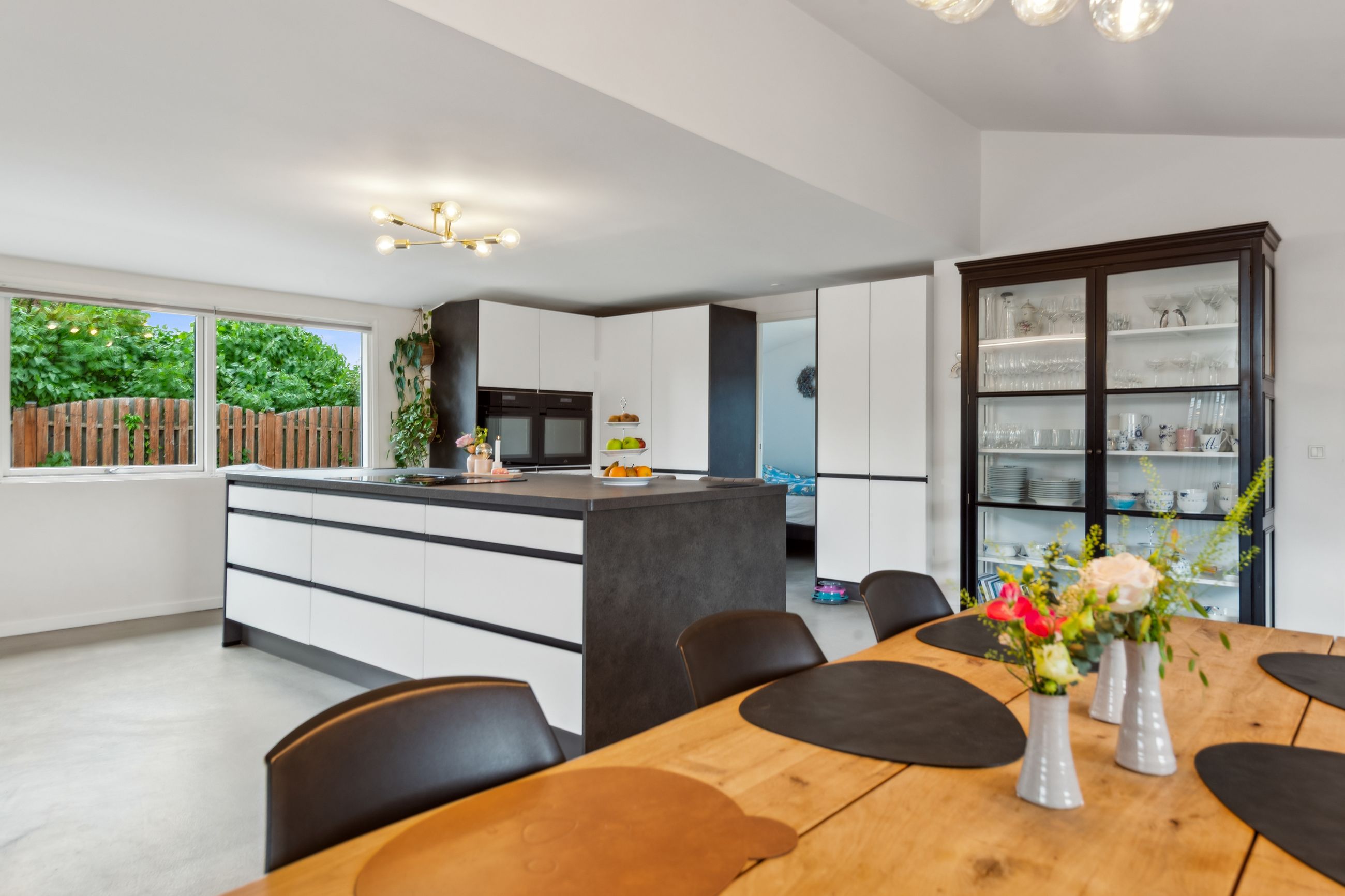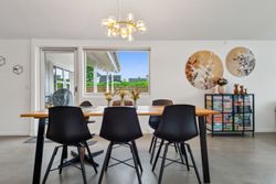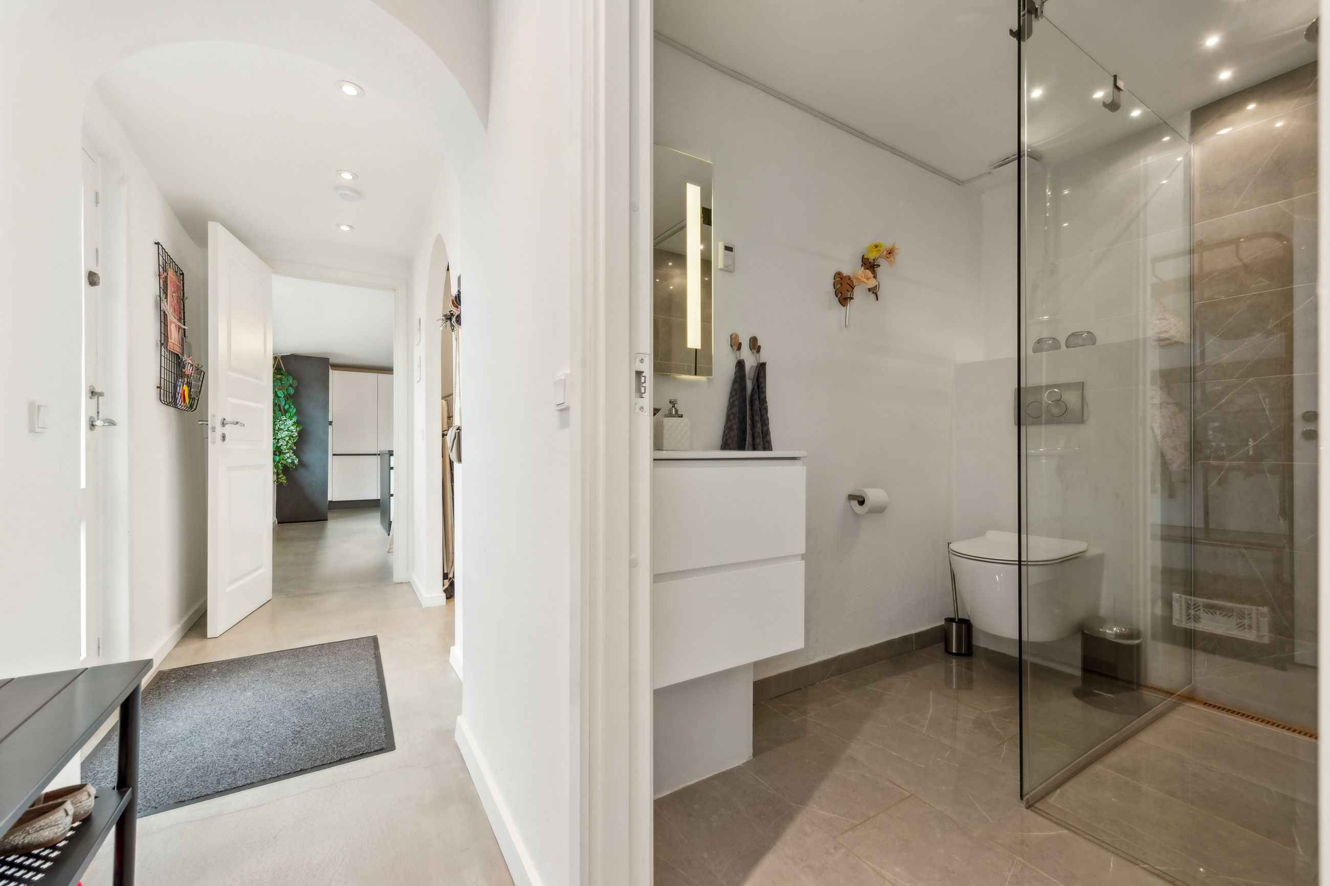 Boligen fremstår indflytningsklar og er gennemgående opdateret med blandt andet betonlignende gulv og behagelig gulvvarme i alle rum, hvilket skaber et ensartet og moderne udtryk. Det naturlige lys strømmer ind gennem de store vinduespartier, og i stueområdet får du en særlig rumfornemmelse takket være loft til kip, som giver luft og arkitektonisk karakter til boligens hjerterum.