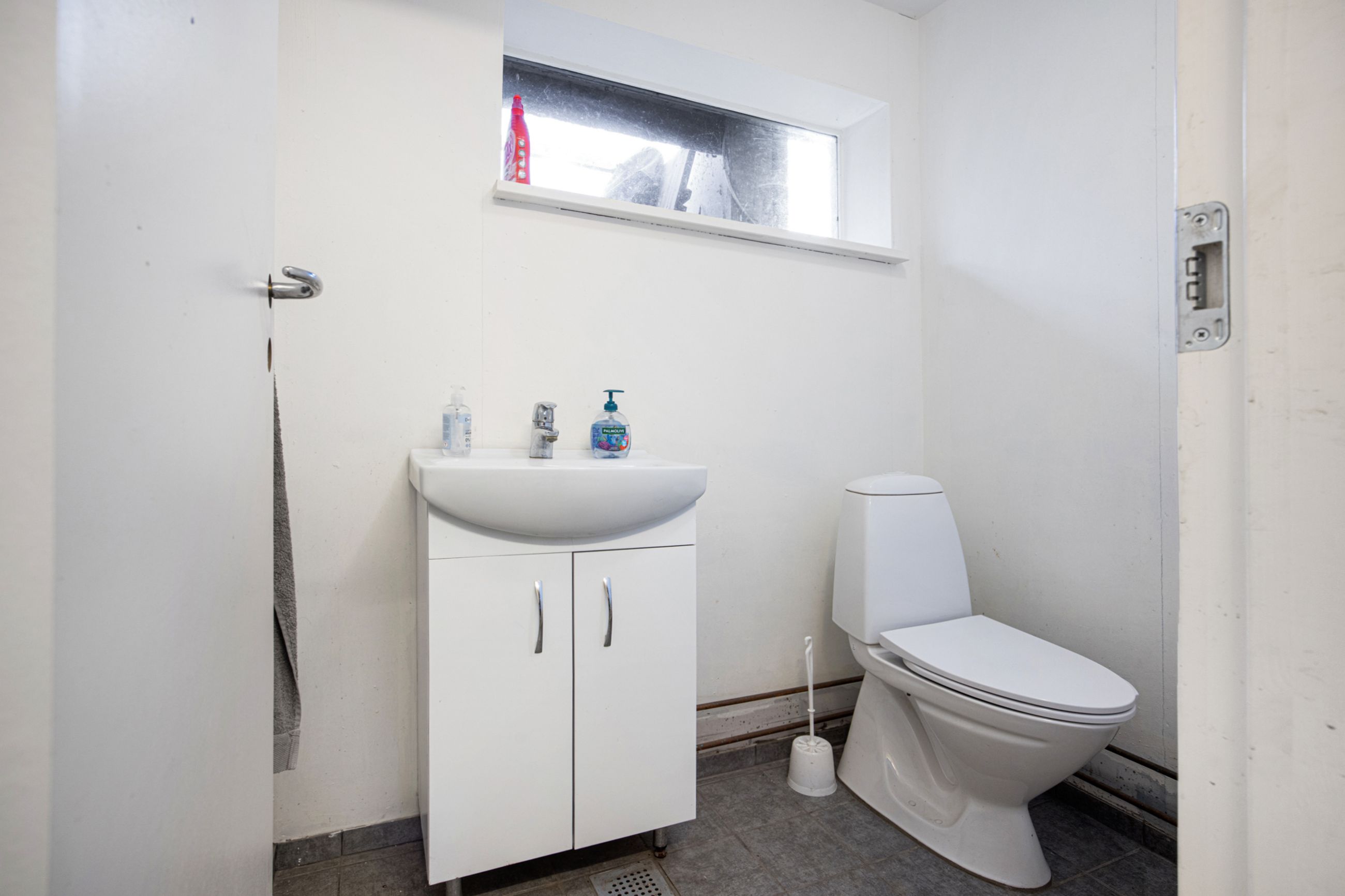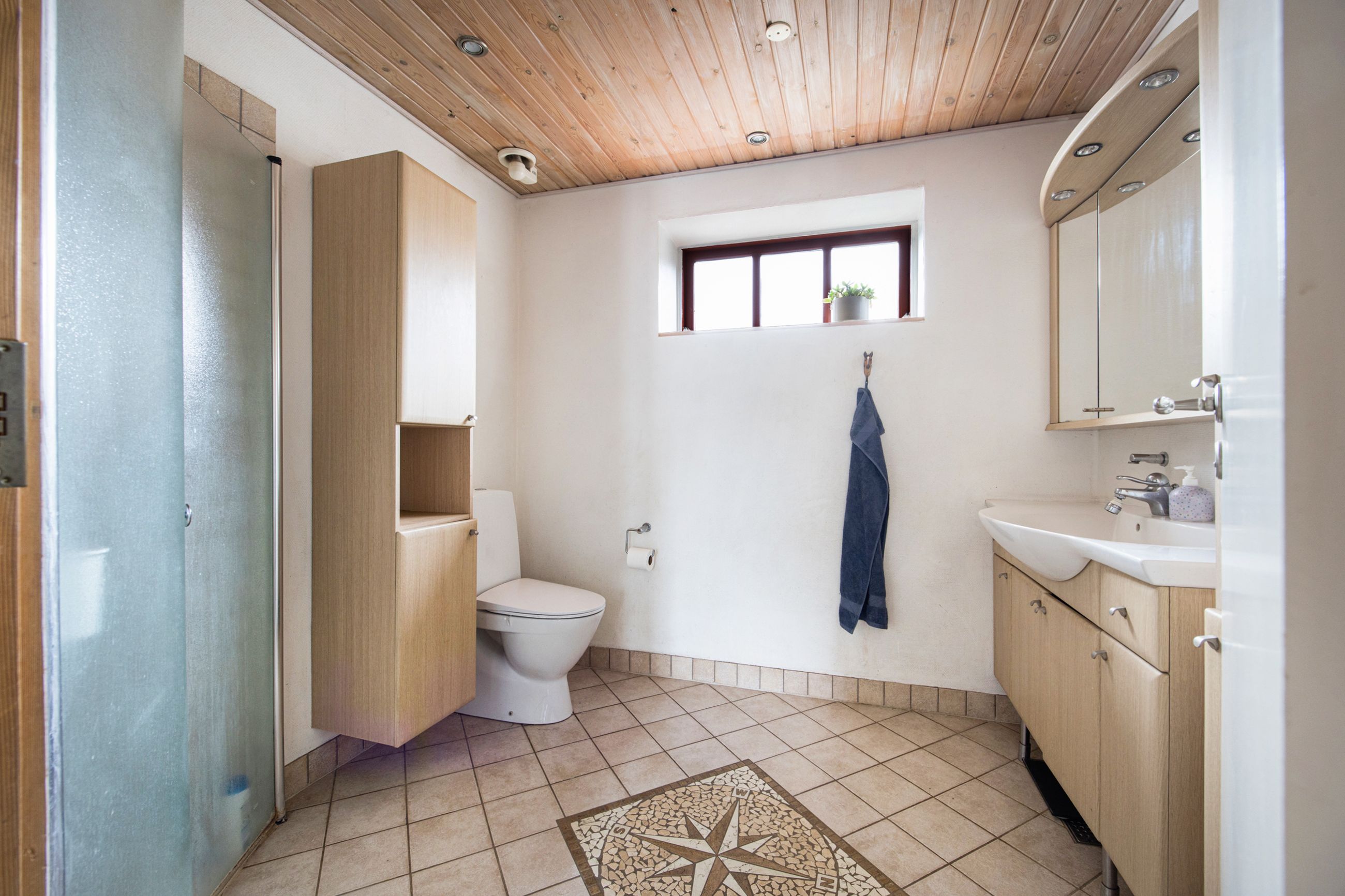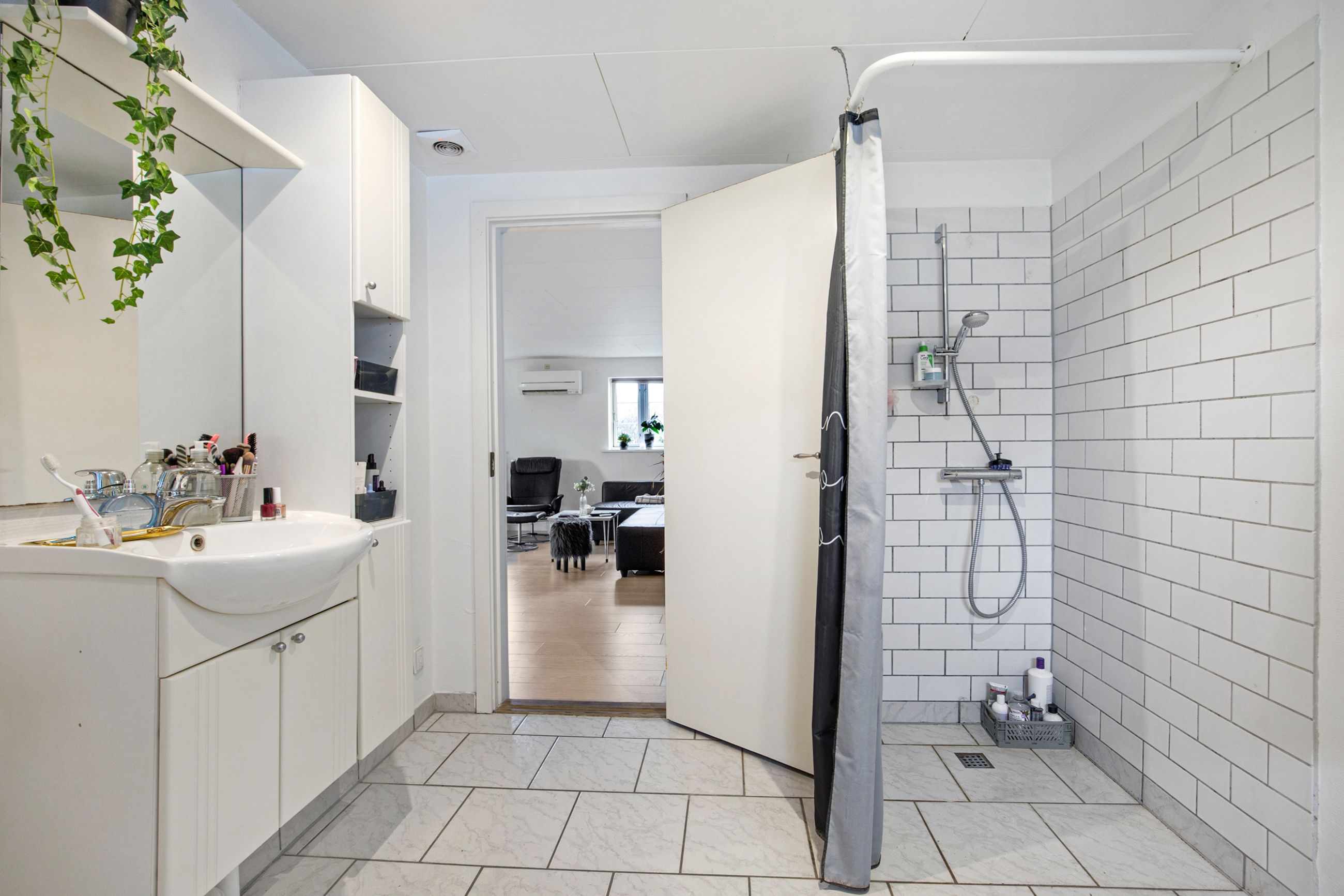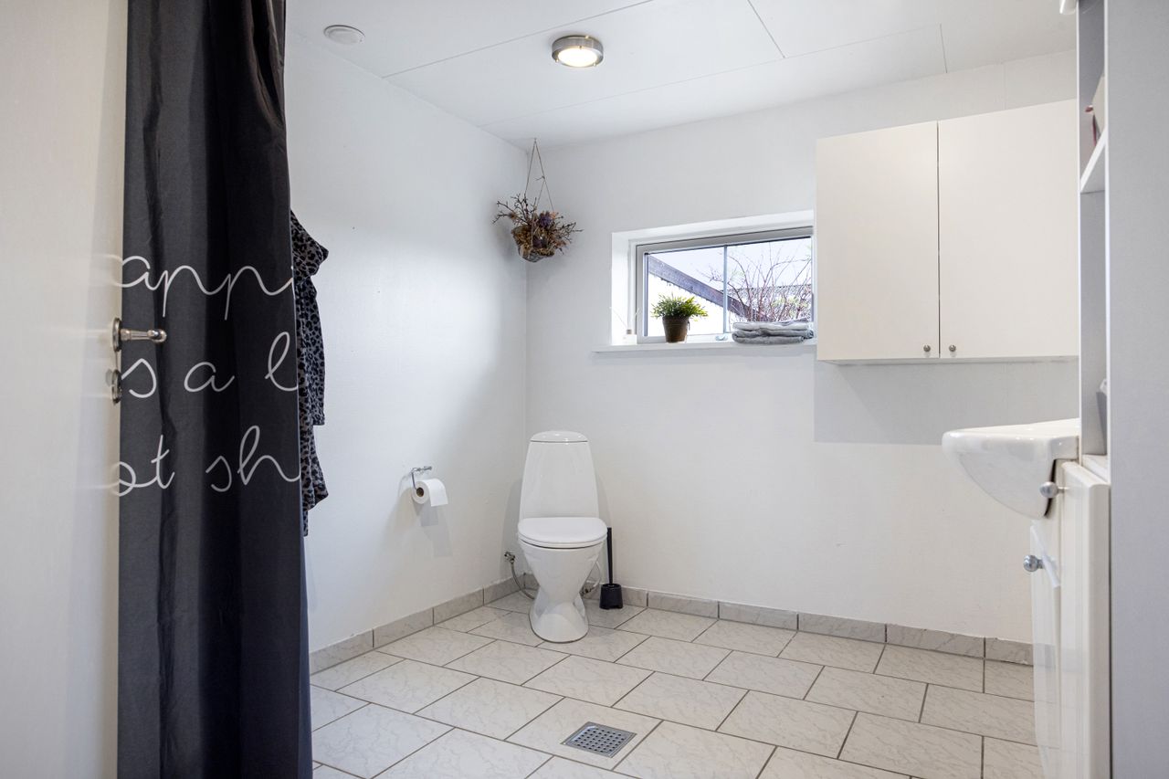 der både toilet og badeværelse, et køkken og soveværelse samt et stort opholdsmiljø.