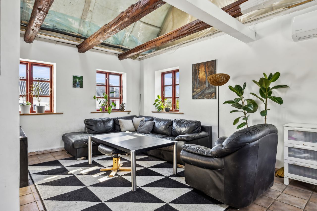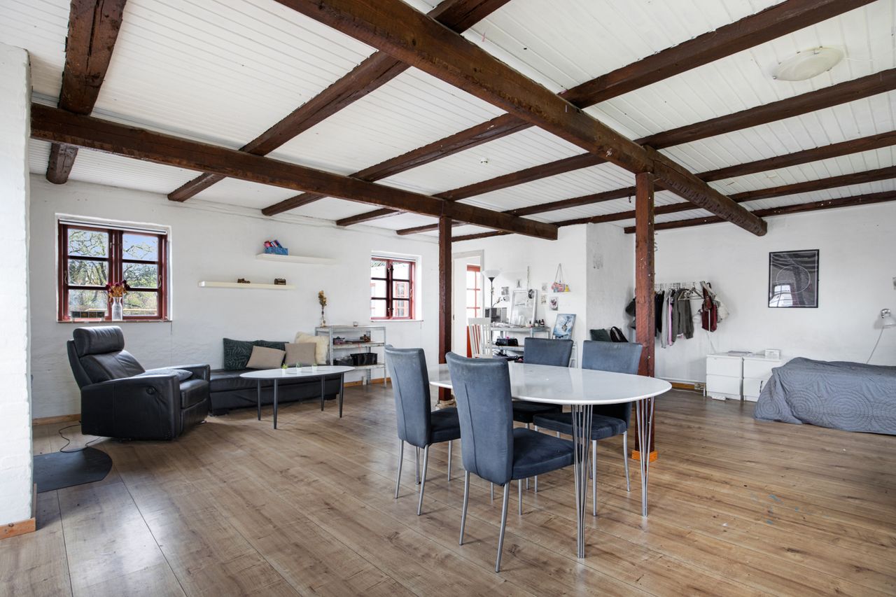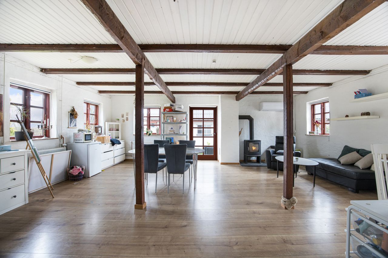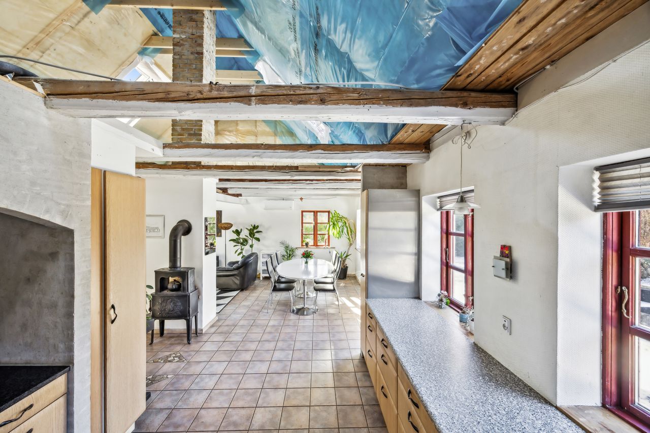 bjælker og åbent til kip (skal færdiggøres), som skaber en hyggelig, landlig stemning