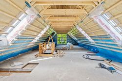 Veluxvinduer. Der er åbnet op til kip i køkken alrummet og her mangler der den sidste