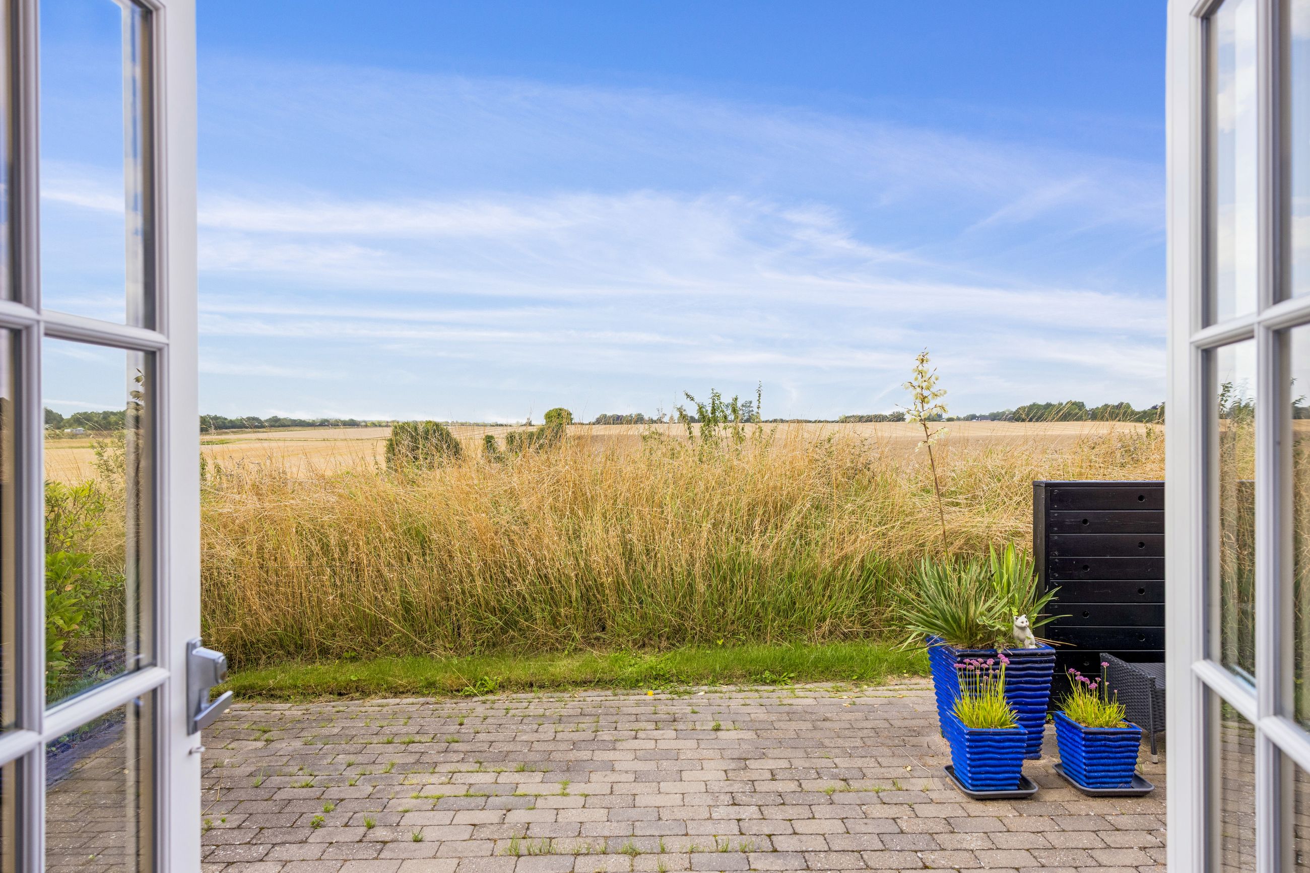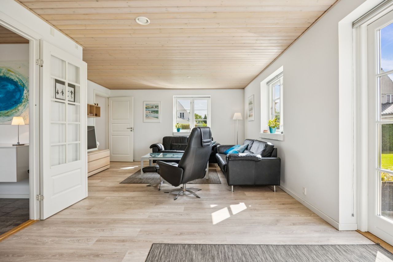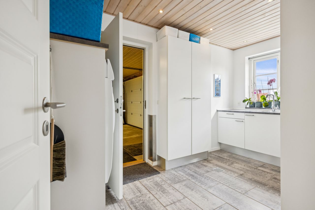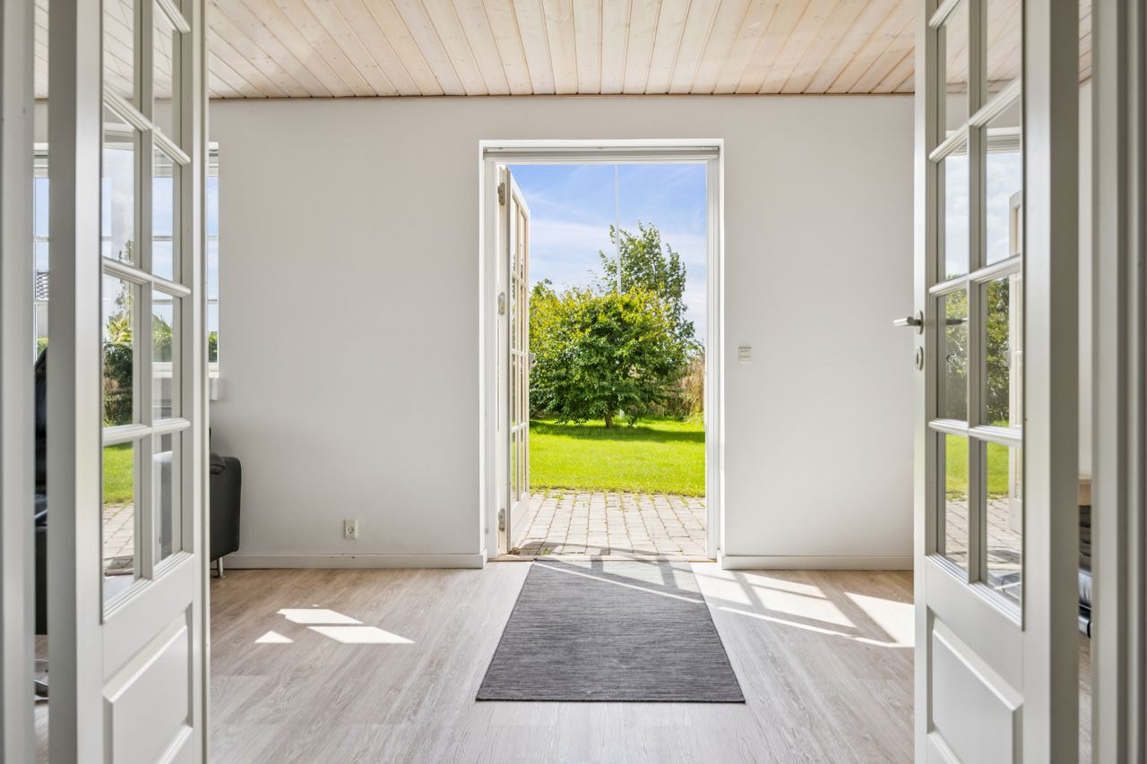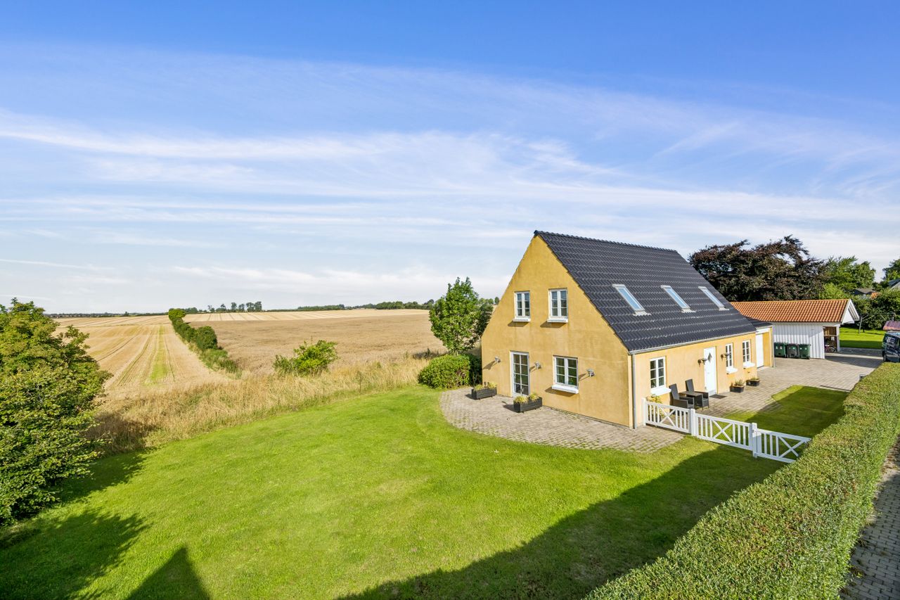 Indenfor finder du en gennemtænkt planløsning med tre rummelige værelser og to stilfulde badeværelser. Det lyse køkken/alrum er husets hjerte, med udsigt til markerne og hvor franske døre fører dig videre ind i den hyggelige vinkelstue – perfekt til både hverdagens afslapning og festlige sammenkomster. Fra bryggerset er der direkte adgang til garagen, hvilket gør det nemt at komme fra bilen ind i huset uden at skulle bekymre sig om vejret.