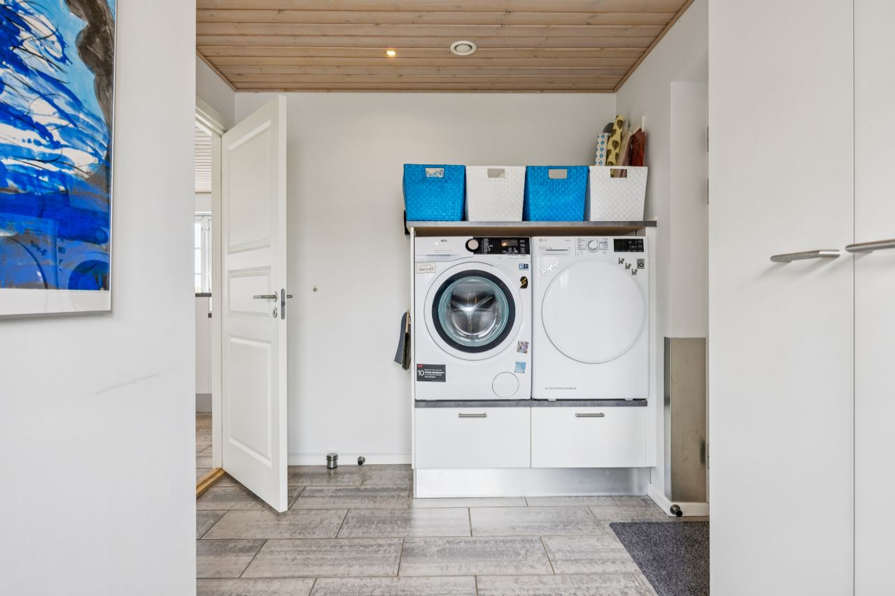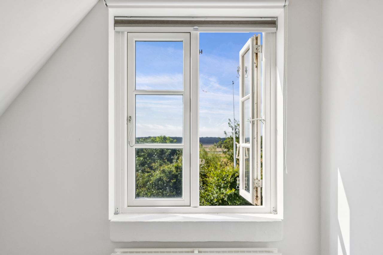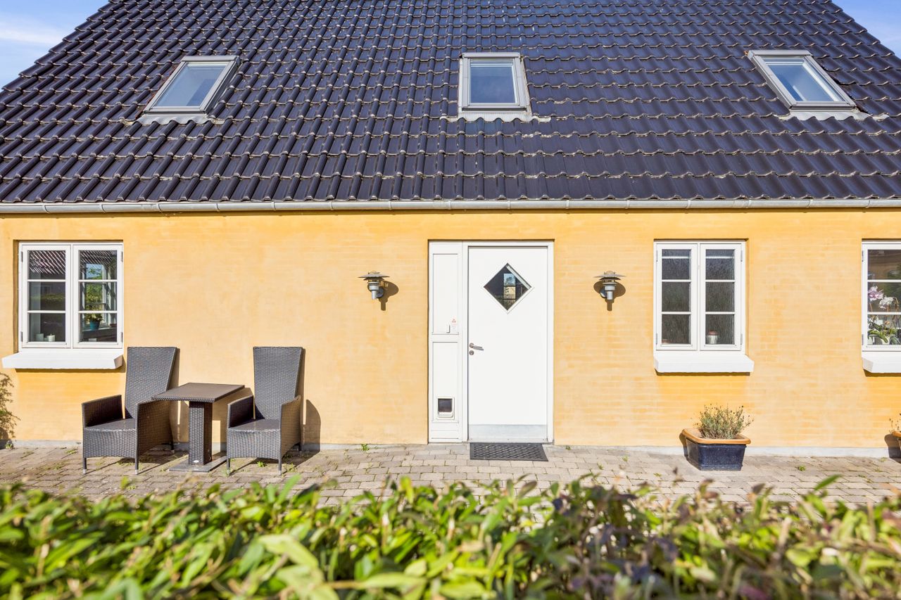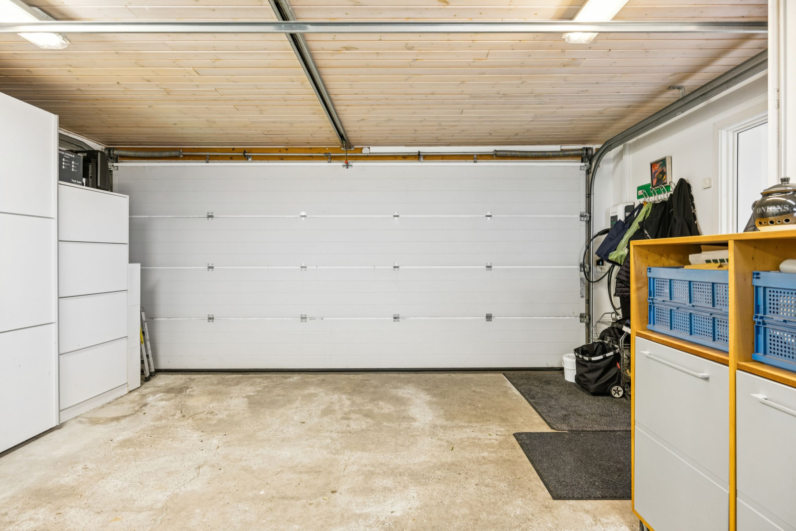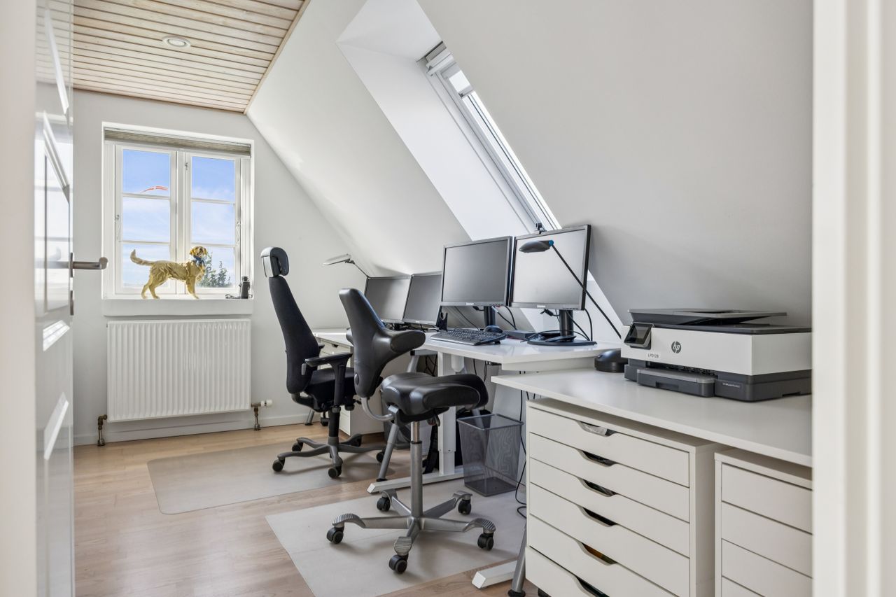 Indenfor finder du en gennemtænkt planløsning med tre rummelige værelser og to stilfulde badeværelser. Det lyse køkken/alrum er husets hjerte, med udsigt til markerne og hvor franske døre fører dig videre ind i den hyggelige vinkelstue – perfekt til både hverdagens afslapning og festlige sammenkomster. Fra bryggerset er der direkte adgang til garagen, hvilket gør det nemt at komme fra bilen ind i huset uden at skulle bekymre sig om vejret.