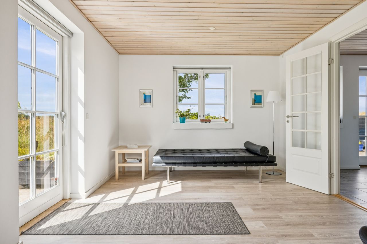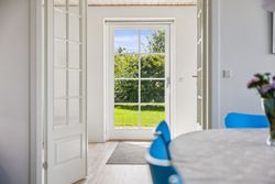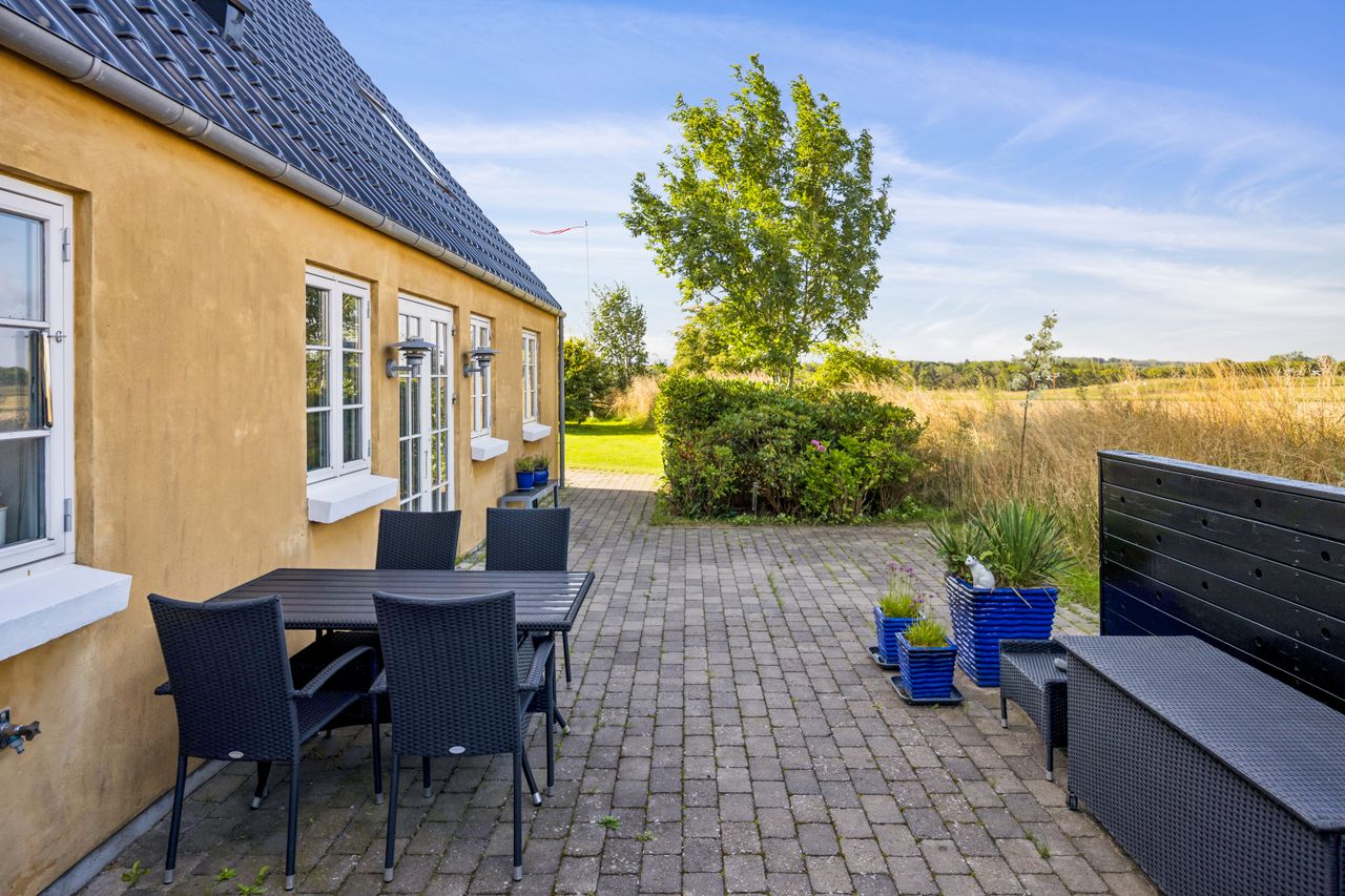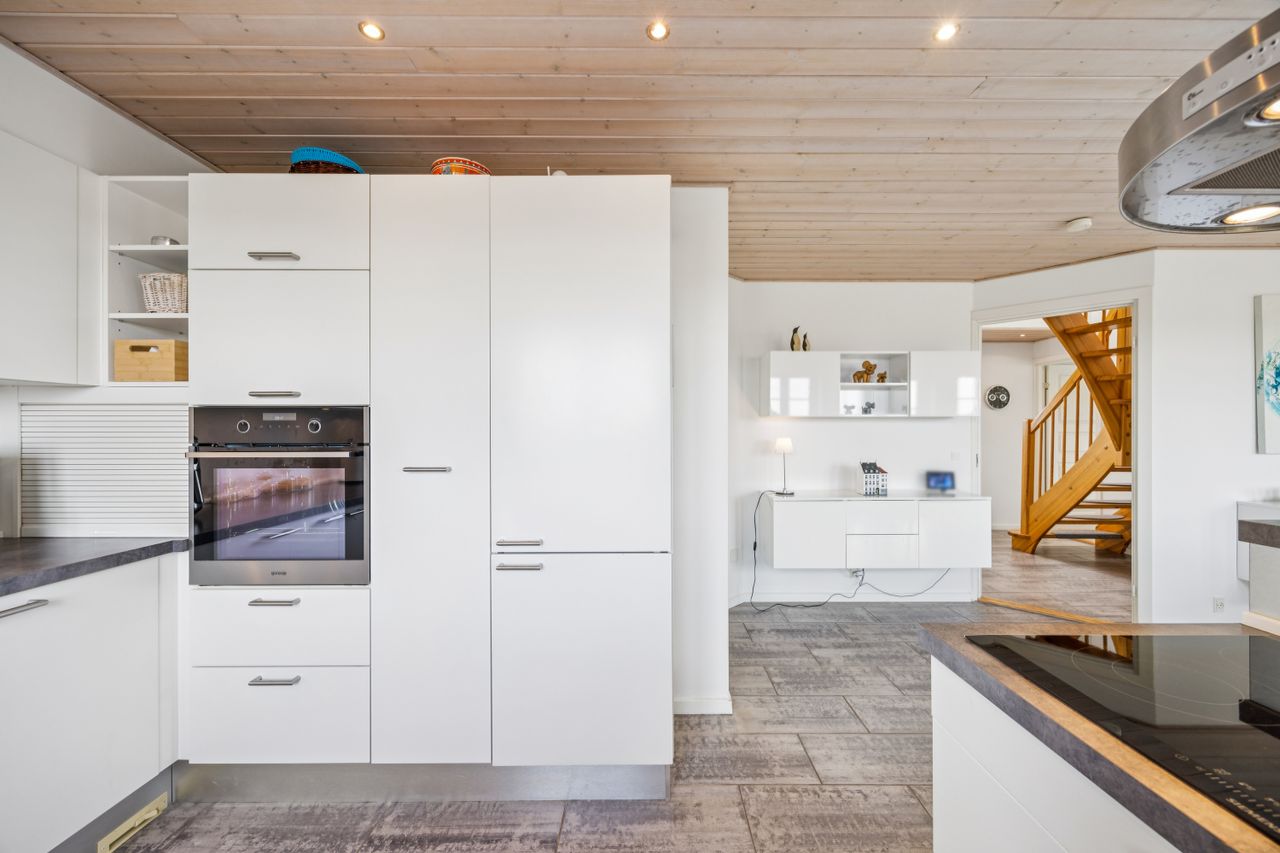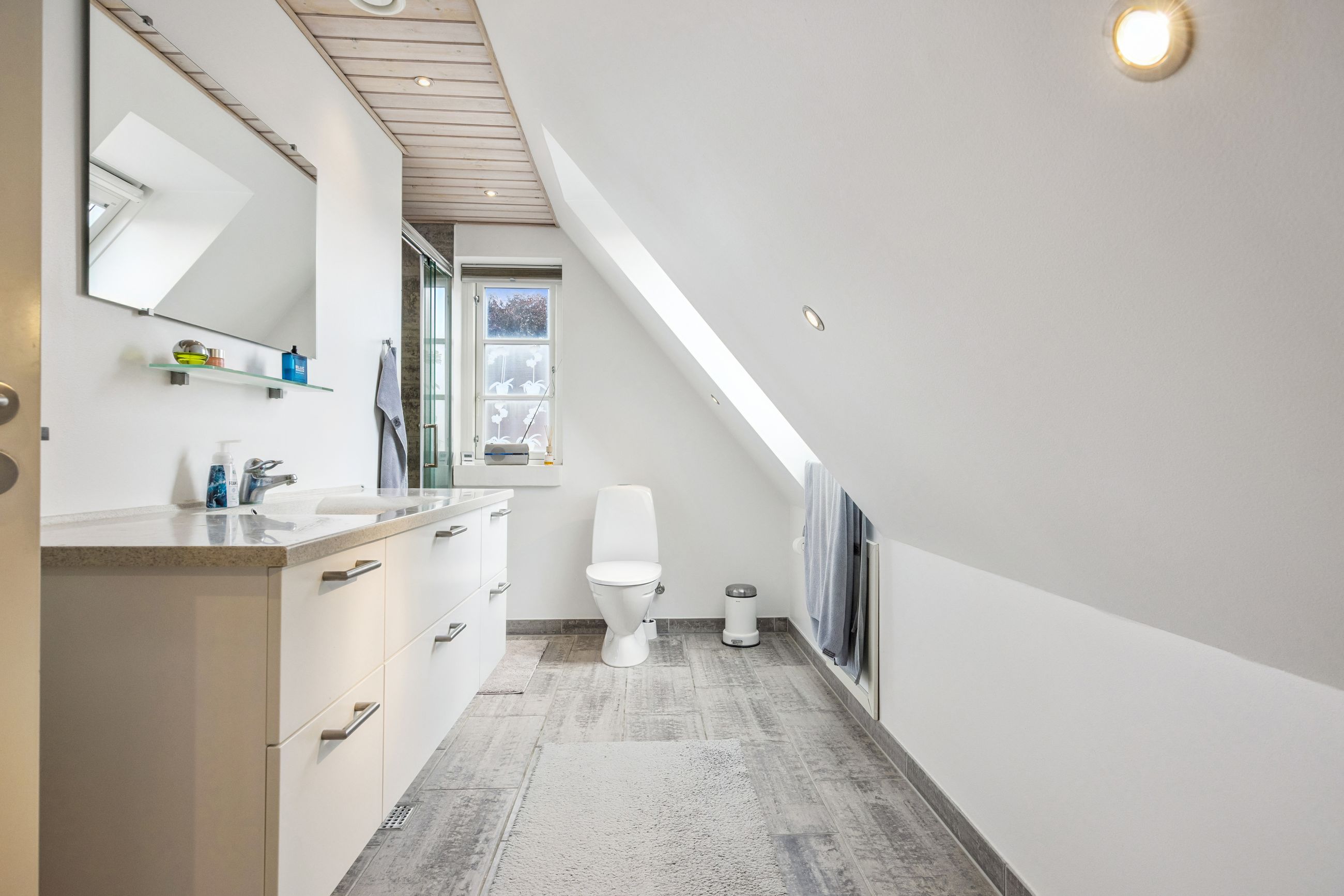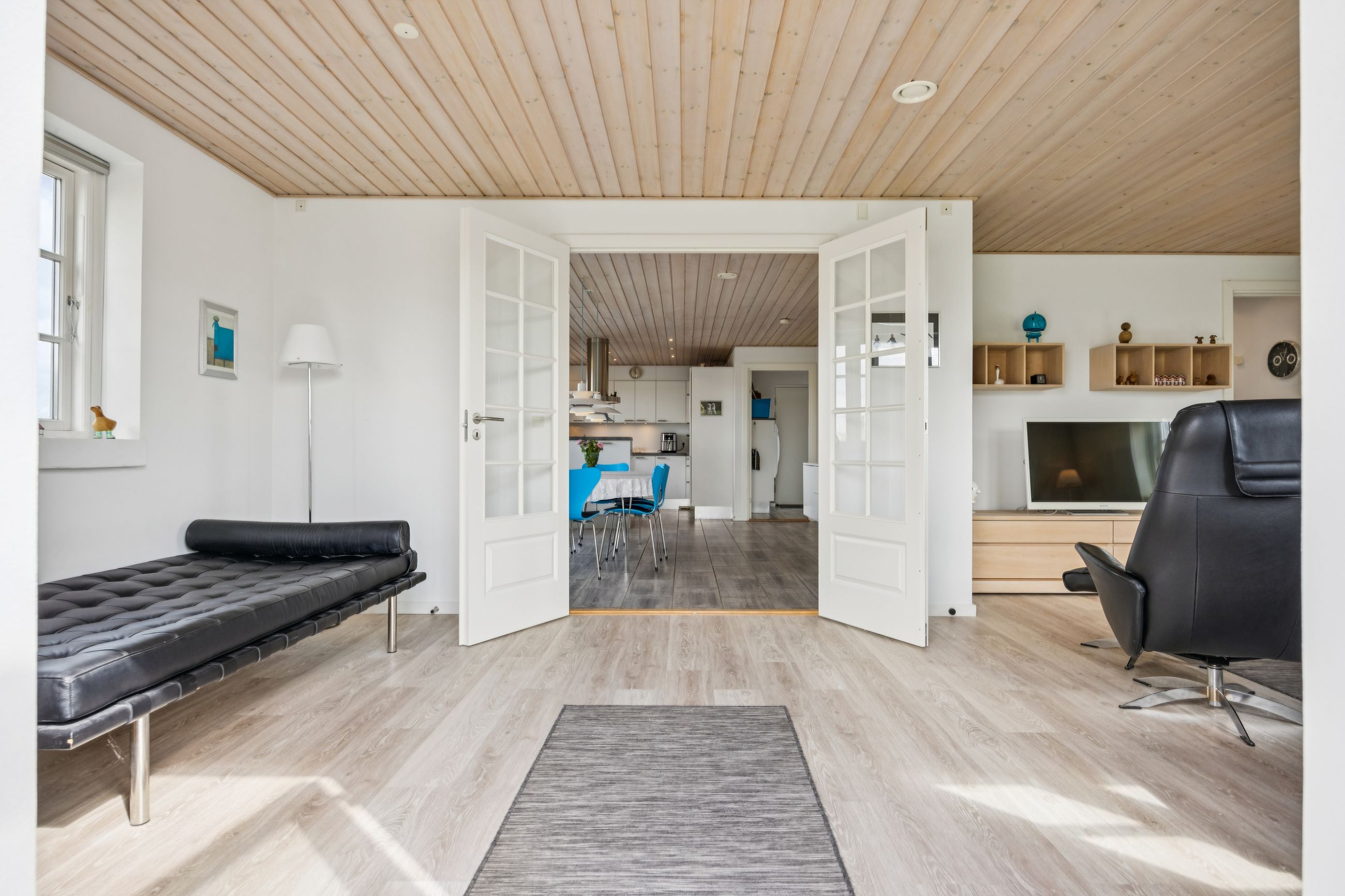 Indenfor finder du en gennemtænkt planløsning med tre rummelige værelser og to stilfulde badeværelser. Det lyse køkken/alrum er husets hjerte, med udsigt til markerne og hvor franske døre fører dig videre ind i den hyggelige vinkelstue – perfekt til både hverdagens afslapning og festlige sammenkomster. Fra bryggerset er der direkte adgang til garagen, hvilket gør det nemt at komme fra bilen ind i huset uden at skulle bekymre sig om vejret.