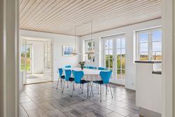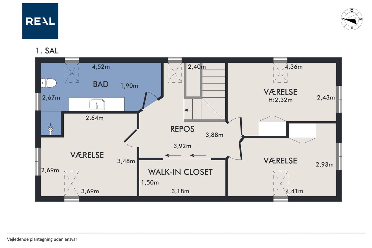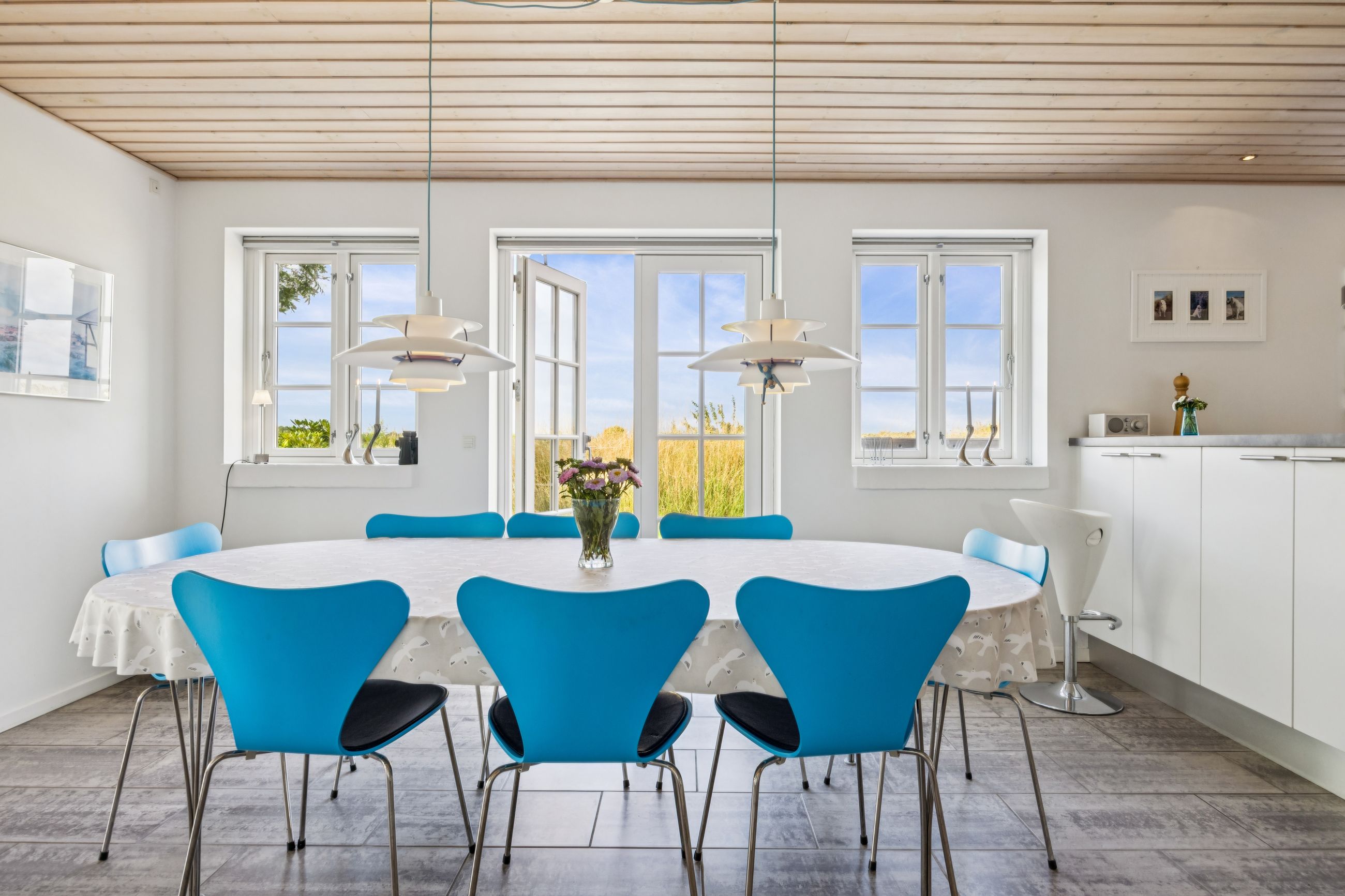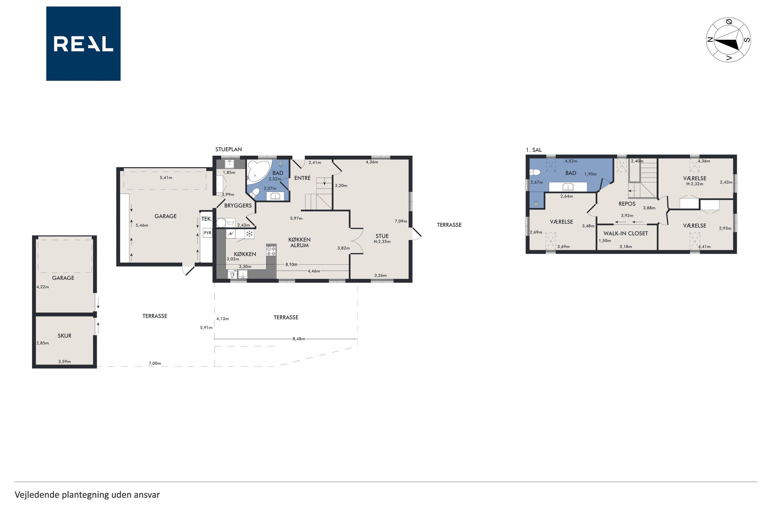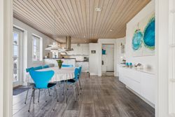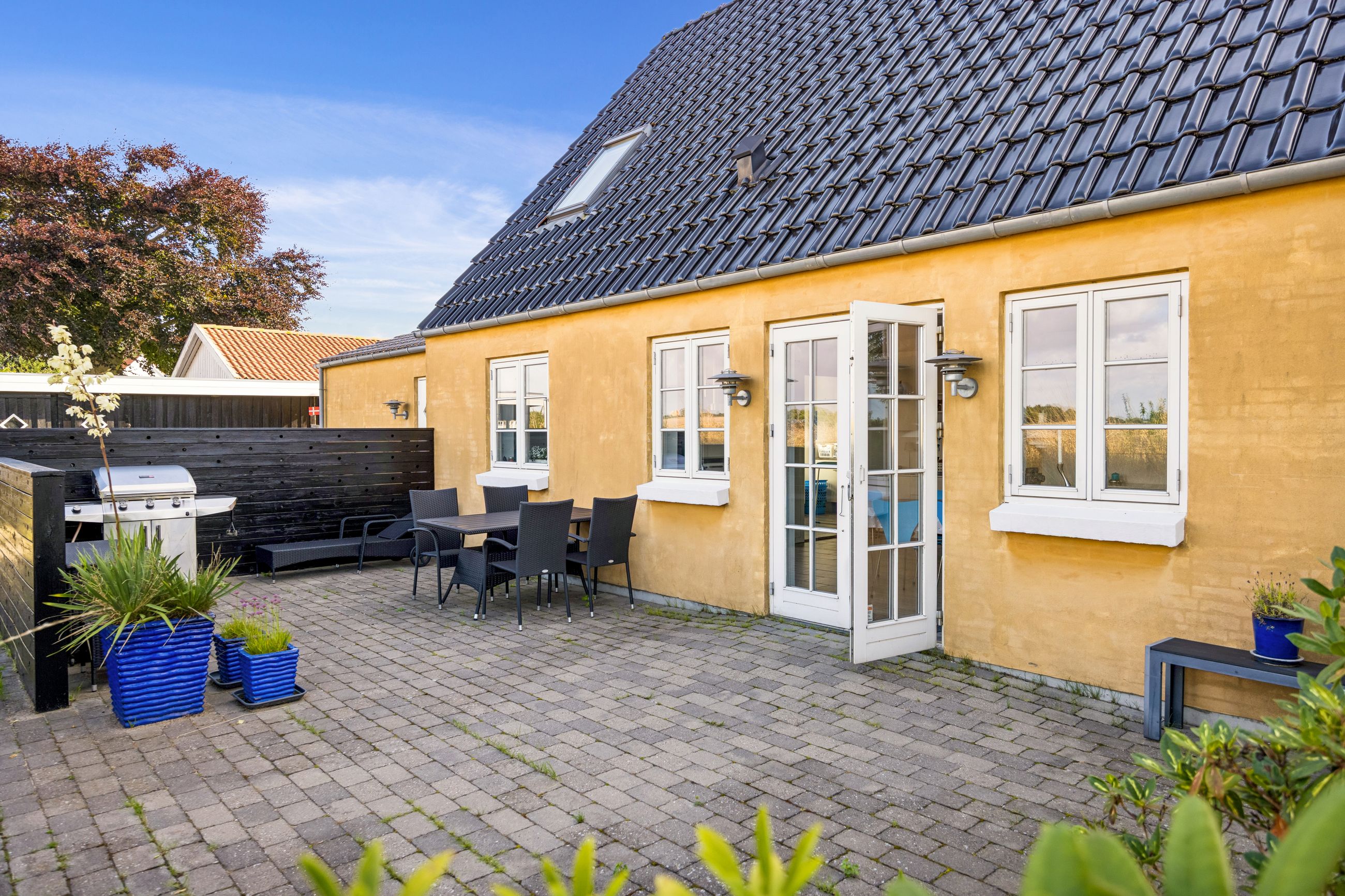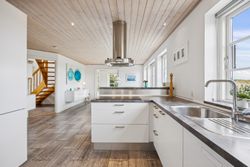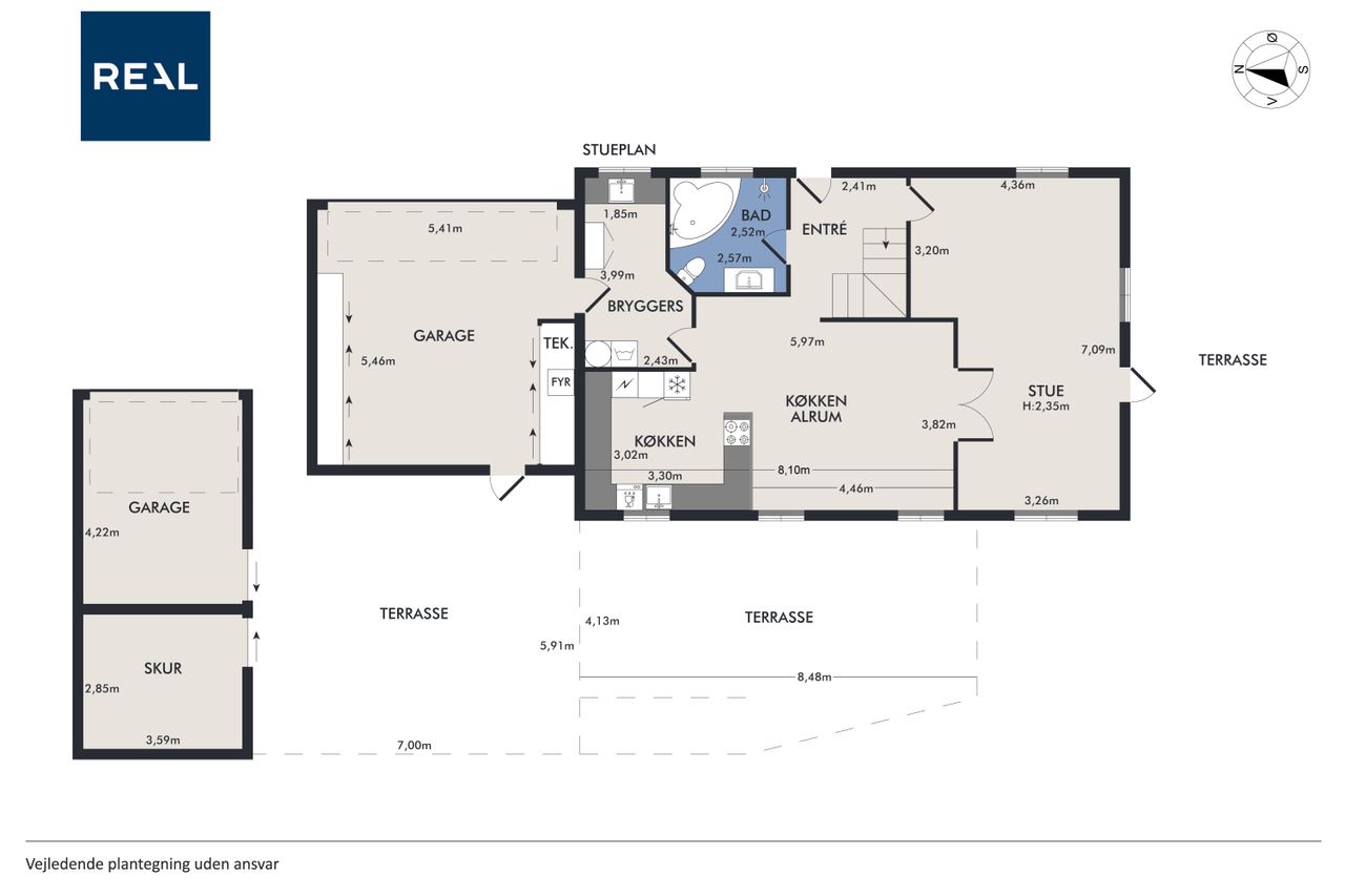 Indenfor finder du en gennemtænkt planløsning med tre rummelige værelser og to stilfulde badeværelser. Det lyse køkken/alrum er husets hjerte, med udsigt til markerne og hvor franske døre fører dig videre ind i den hyggelige vinkelstue – perfekt til både hverdagens afslapning og festlige sammenkomster. Fra bryggerset er der direkte adgang til garagen, hvilket gør det nemt at komme fra bilen ind i huset uden at skulle bekymre sig om vejret.