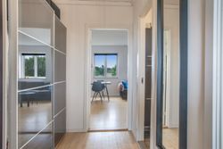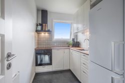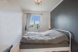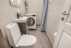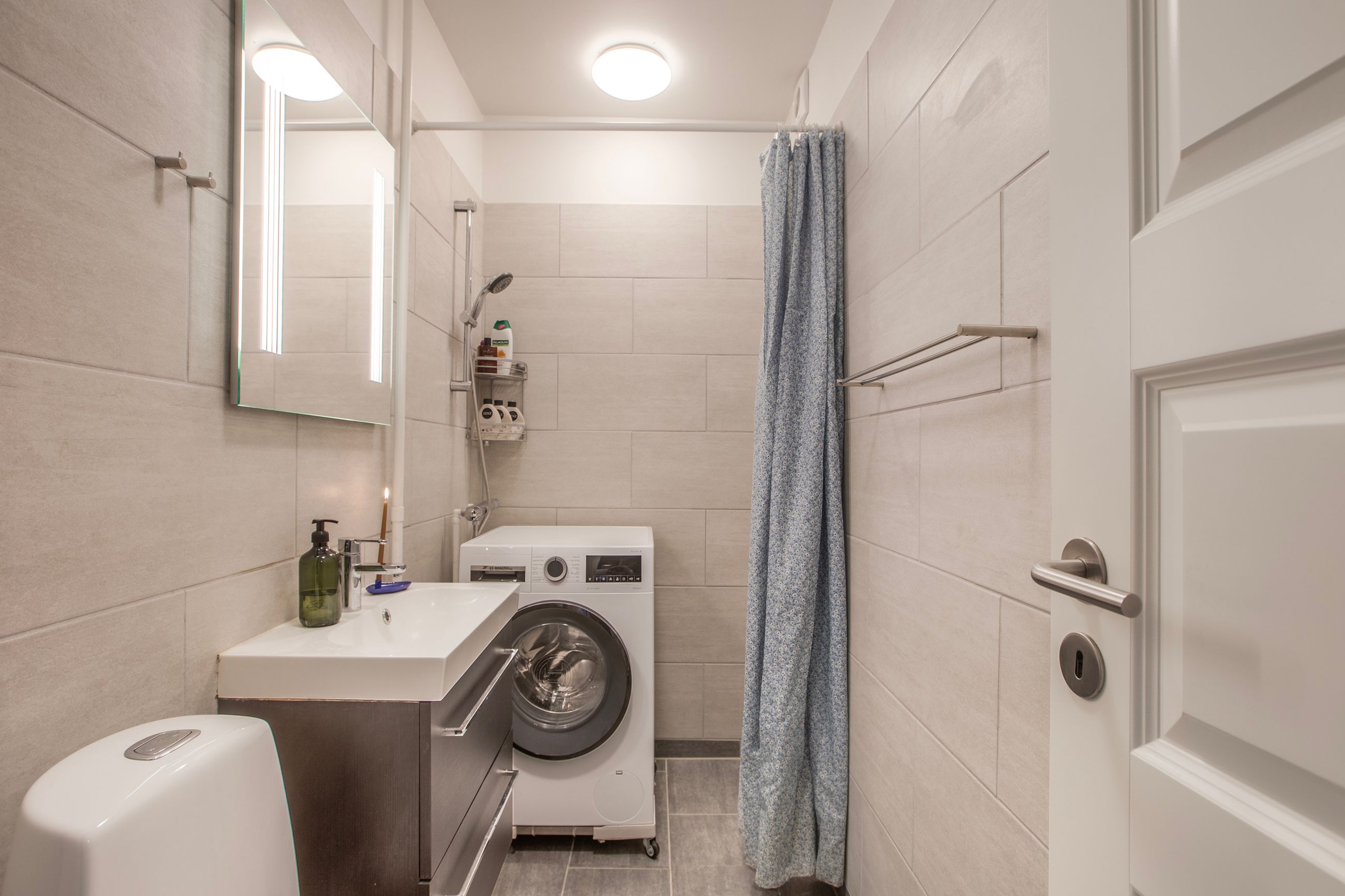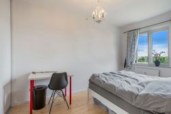 Badeværelset er ligeledes blevet moderniseret med lyse klinker, der harmonerer smukt med resten af lejligheden. Her kan du nyde godt af rummeligheden og de stilrene detaljer. Soveværelset byder på rigeligt plads til en stor seng samt et praktisk indbygget skab, der gør det let at holde orden.