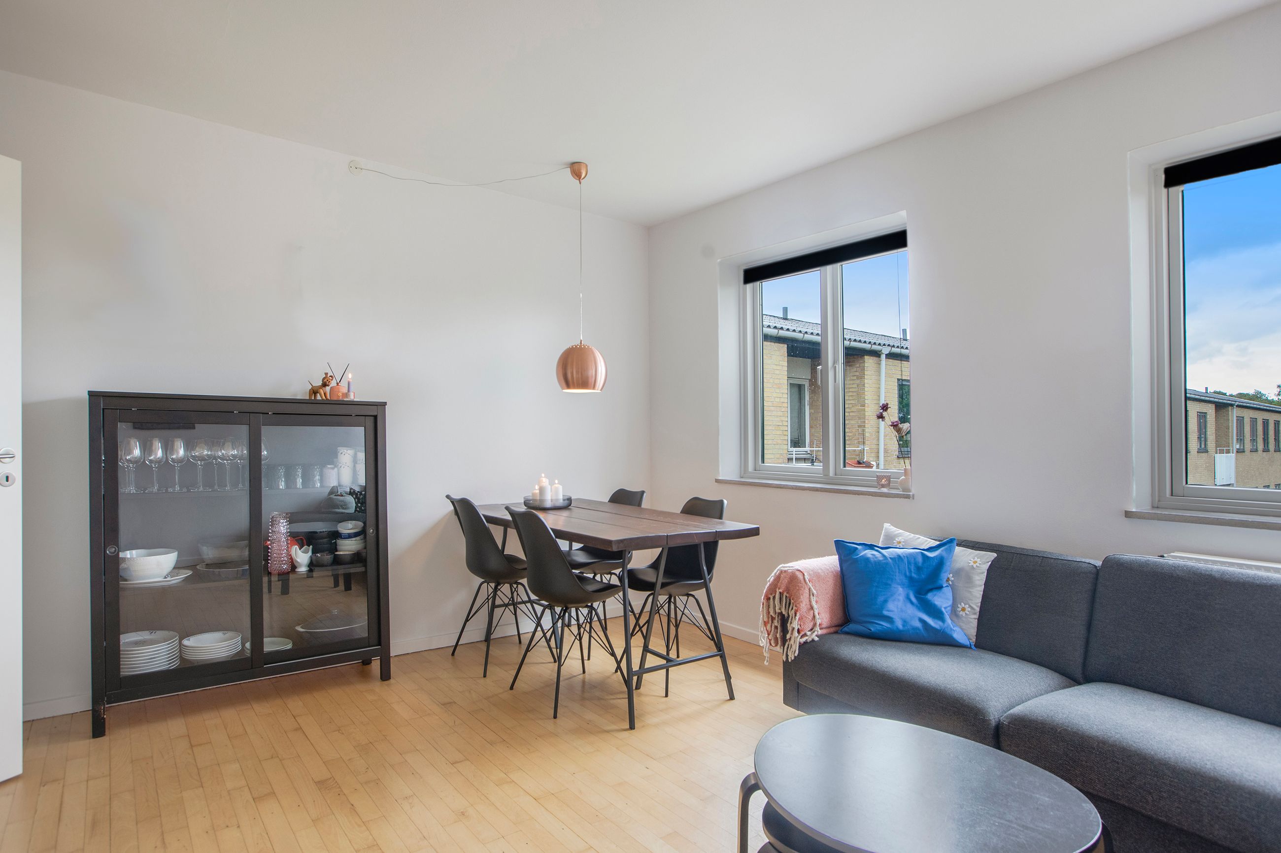 Stuen er nem at indrette efter dine behov, hvad enten du ønsker et hyggeligt sofahjørne eller en spiseafdeling til gæster. De originale trægulve strækker sig gennem hele lejligheden og tilfører både varme og charme til boligen. Det istandsatte køkken er udstyret med alle nødvendige hårde hvidevarer, så madlavningen bliver en leg.
