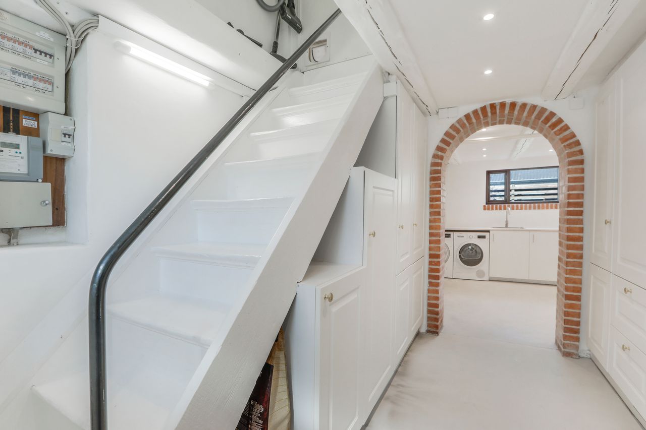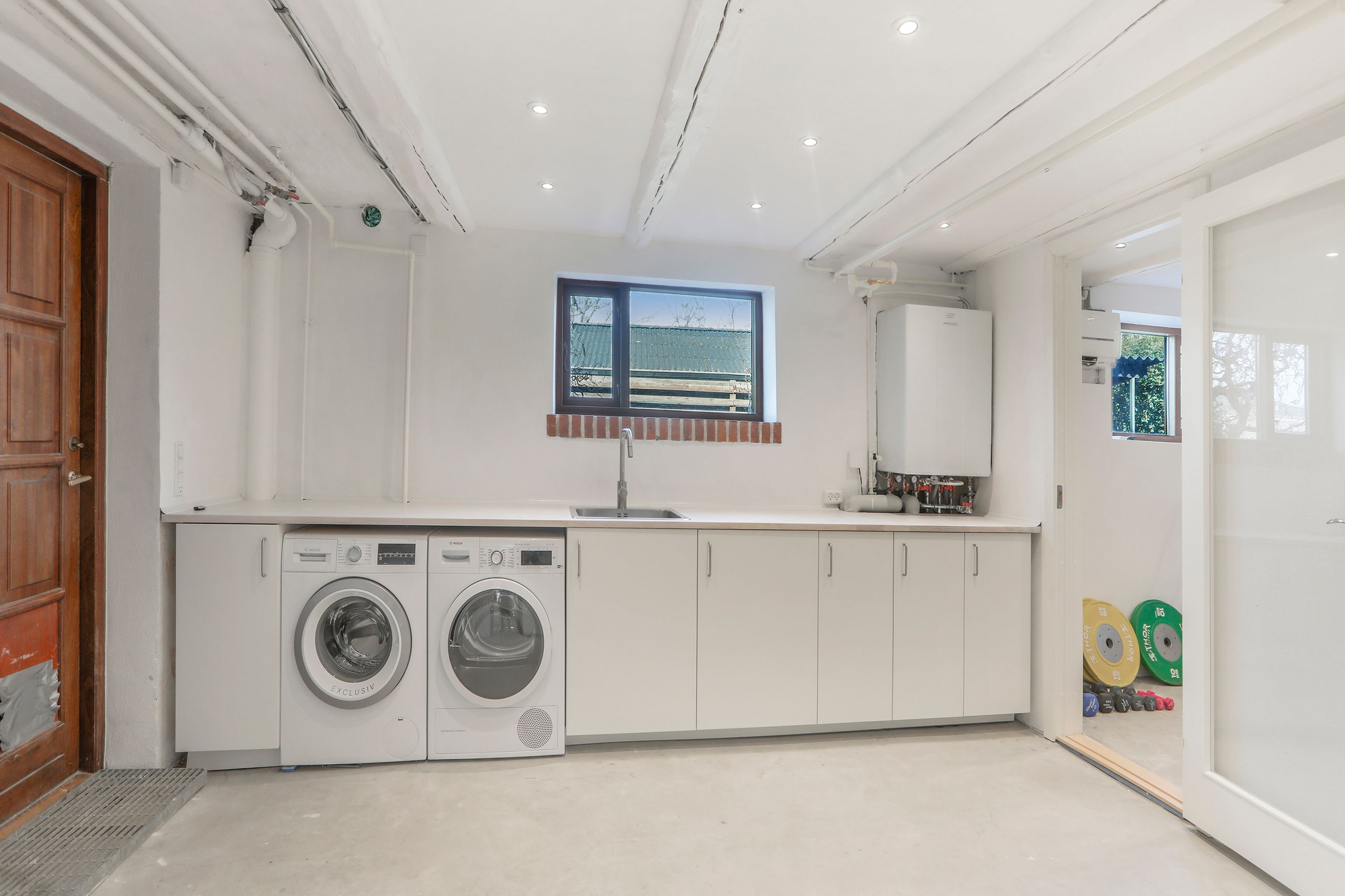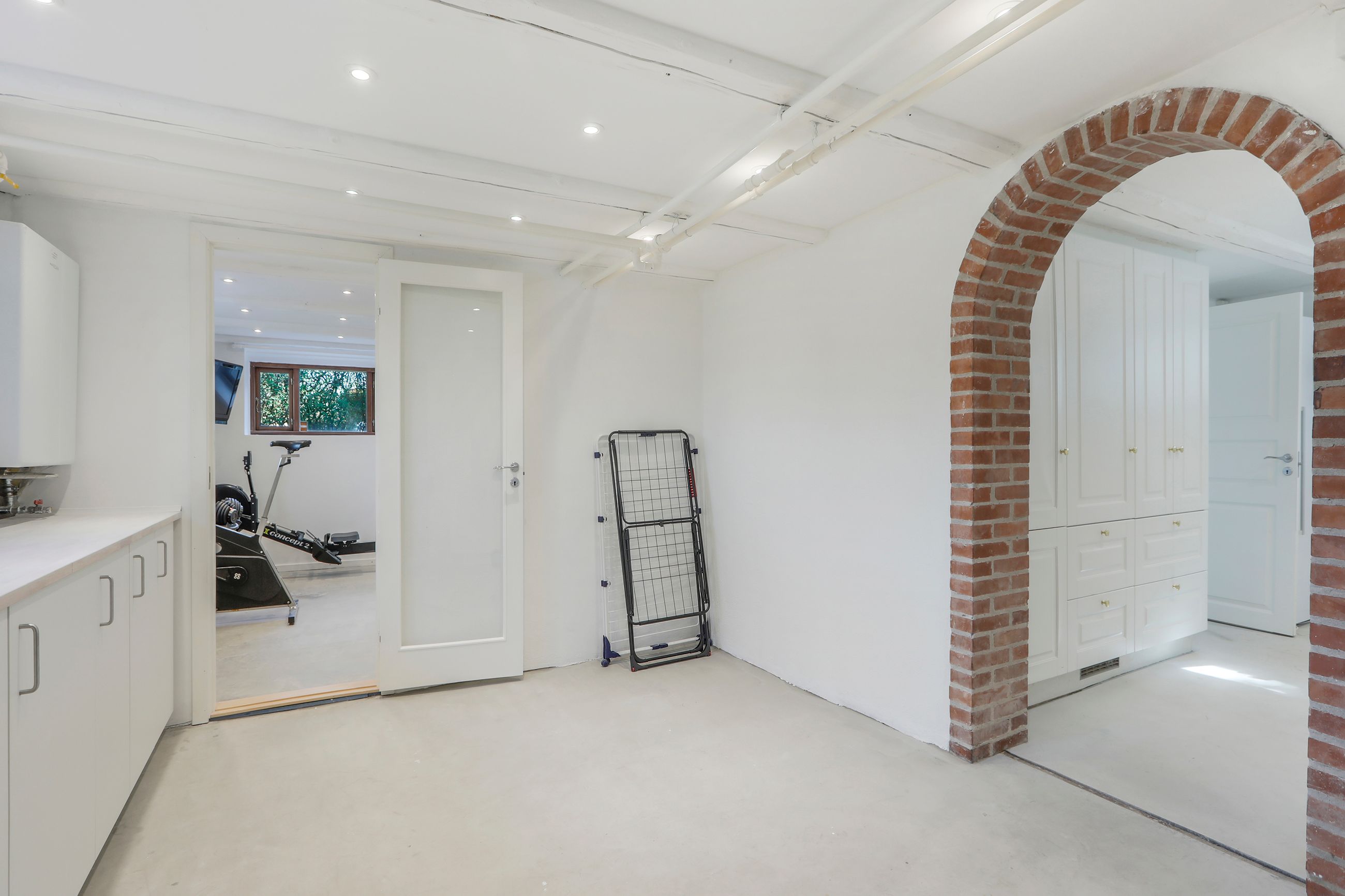 Kælderen er blevet flot renoveret og tilbyder yderligere 89 kvadratmeter boligkvalitet – heriblandt en praktisk garage på 18 kvadratmeter. Dette bringer det samlede boligareal op på imponerende 231 kvadratmeter.