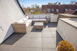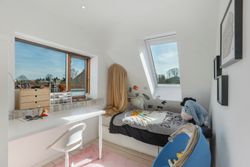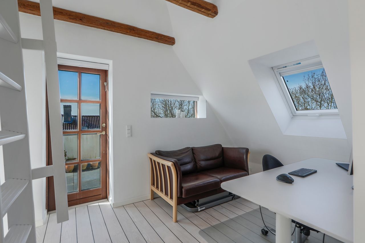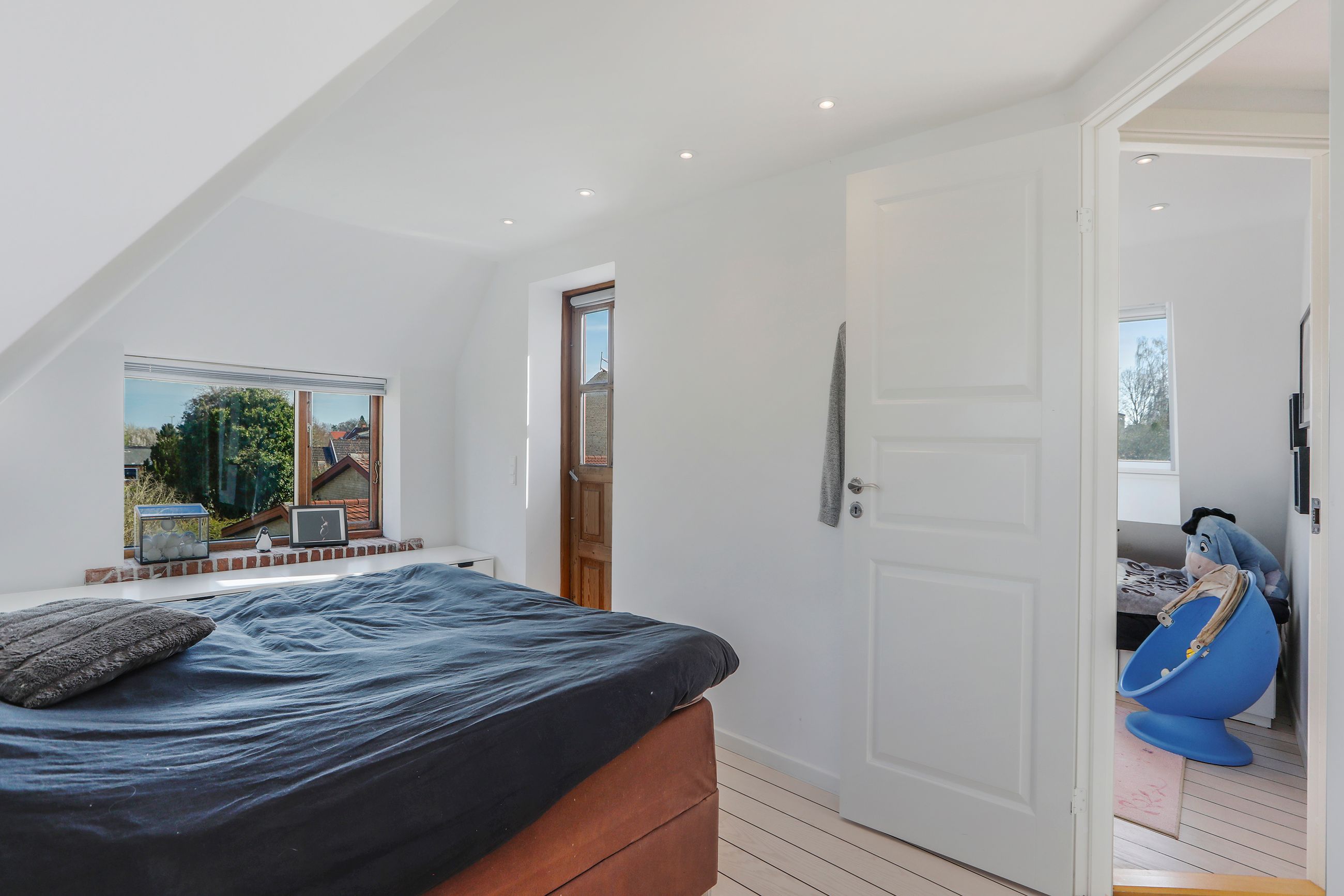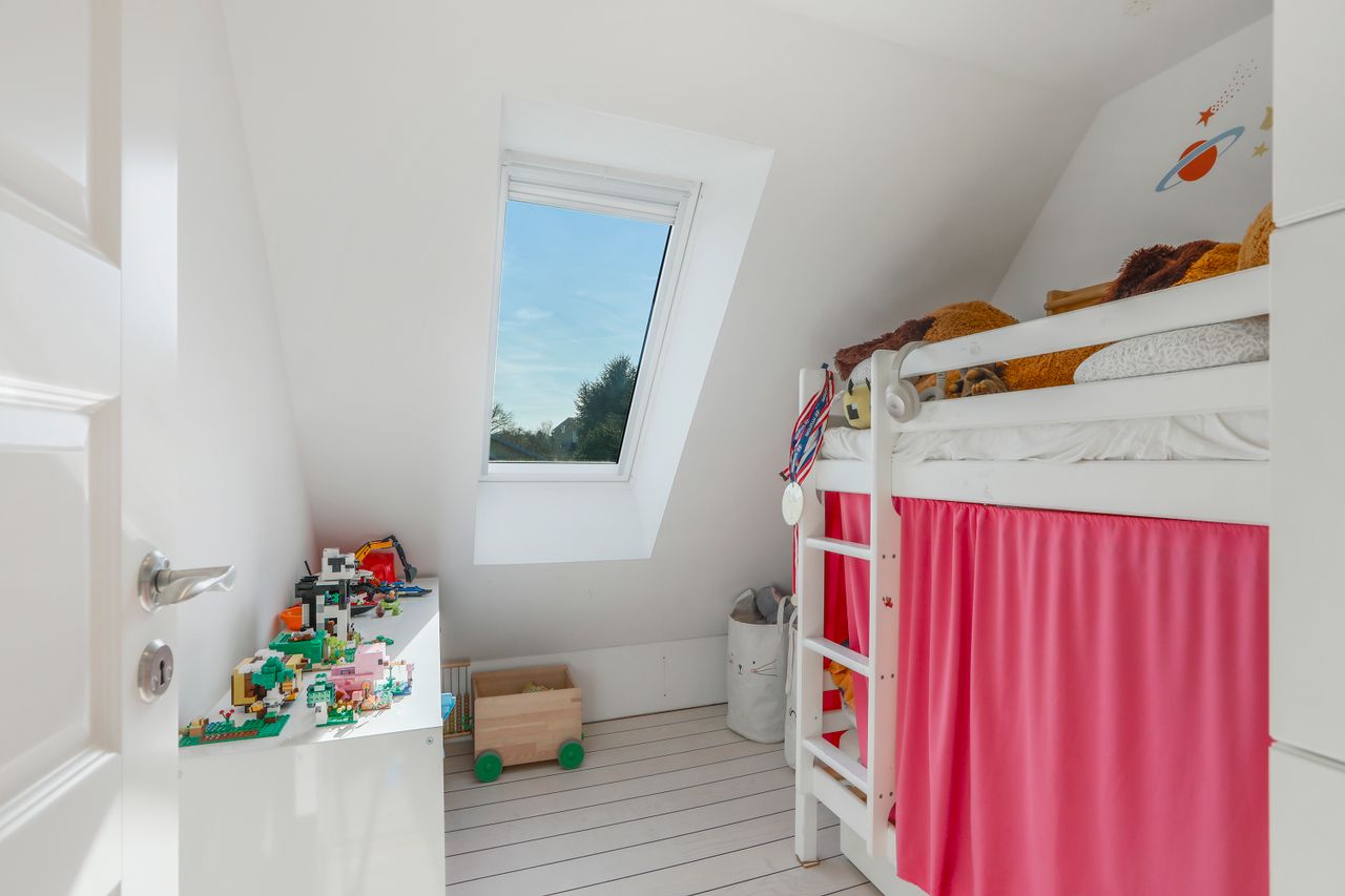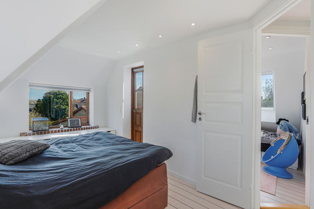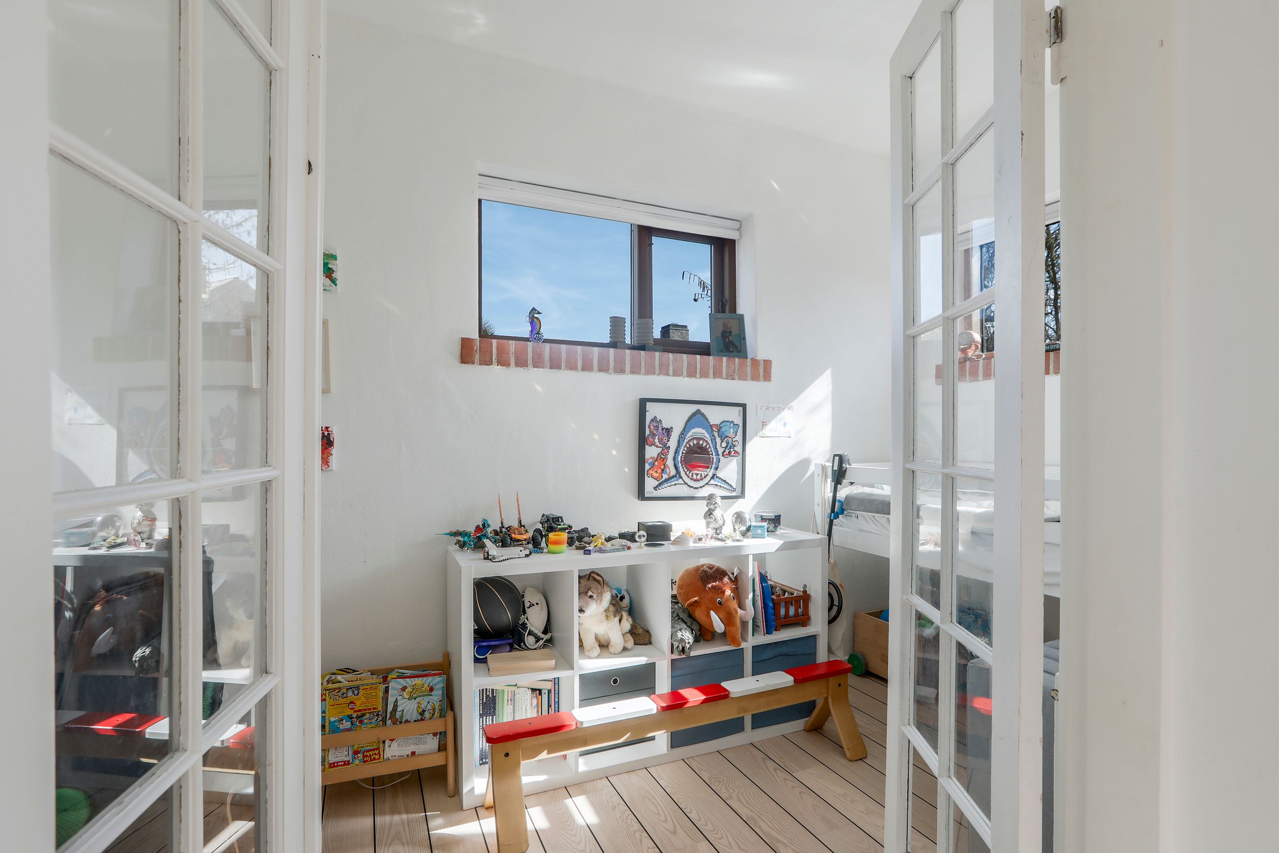 På førstesalen mødes du af tre rummelige værelser samt et åbent kontorområde, foruden en skøn hems med gulvvarme. Hele denne etage er udstyret med gulvvarme for optimal komfort året rundt. Fra første sal har du adgang til to store solrige terrasser, hvorfra du kan nyde udsigten over kvarterets grønne omgivelser.