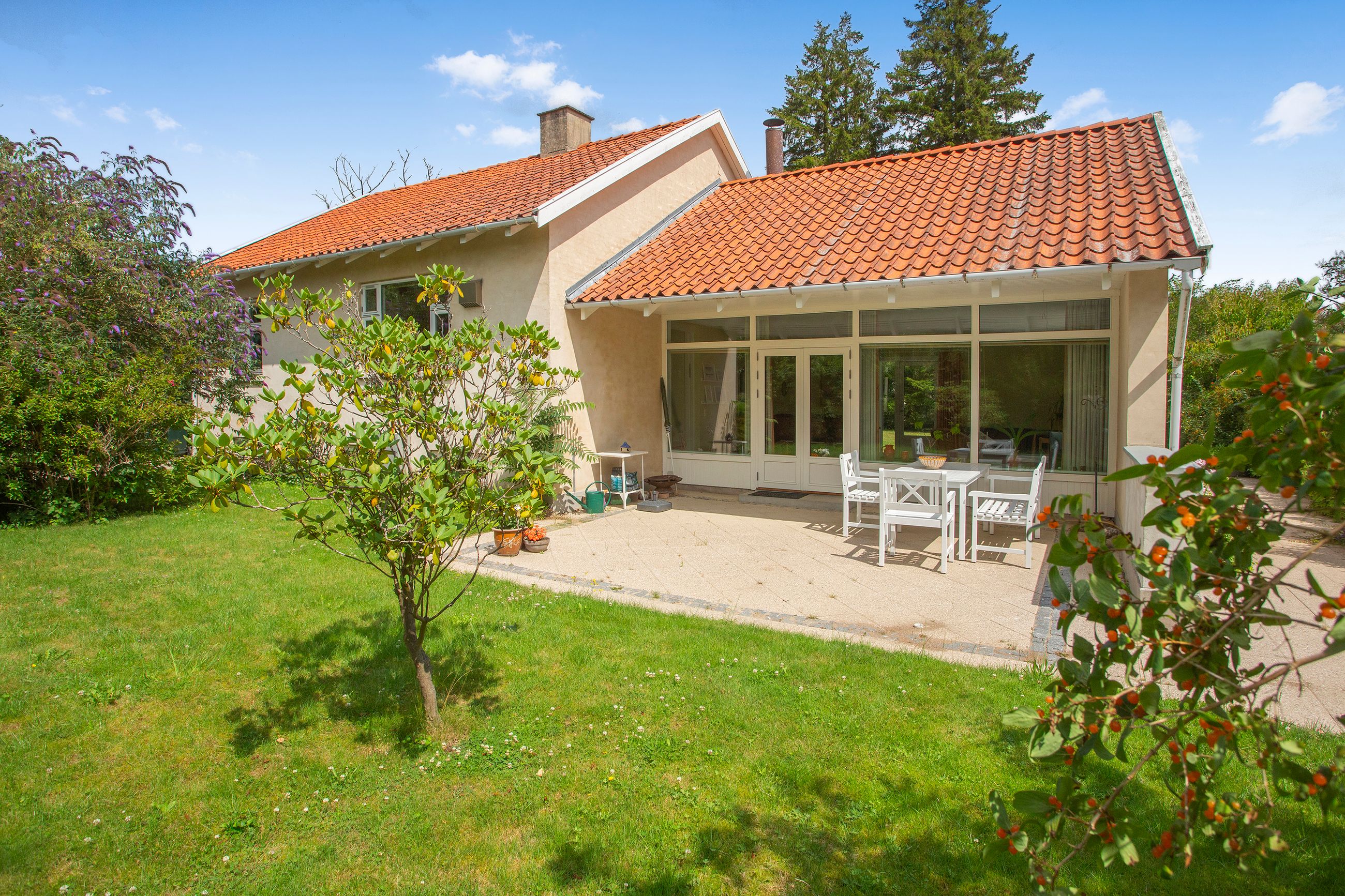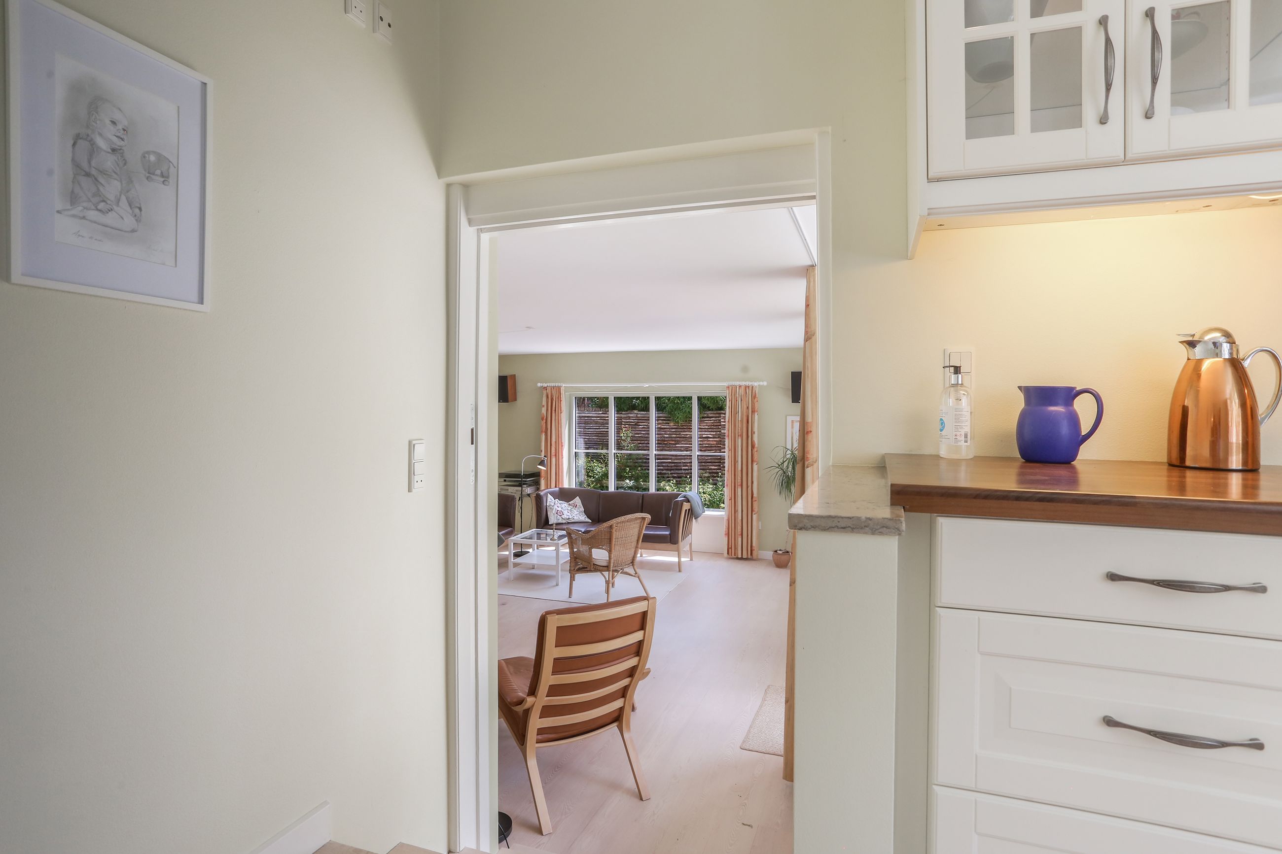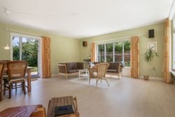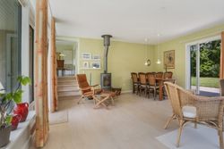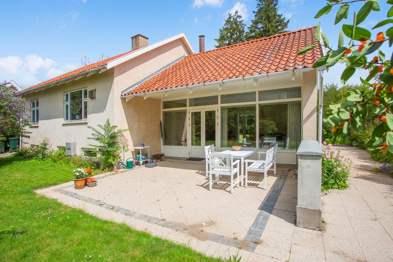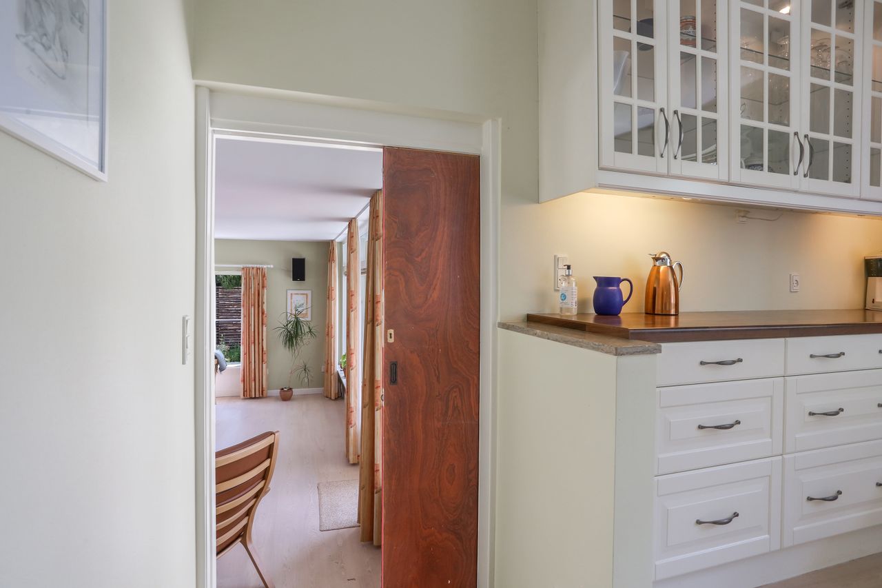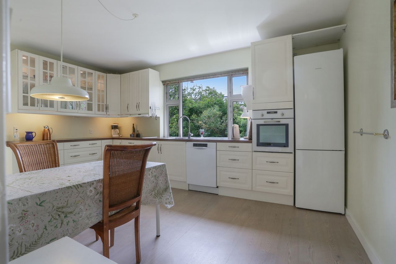 Det rummelige spisekøkken er hjemmets hjerte, hvor familien kan samles om måltiderne. Herfra fører tre-fire trin ned til den store tilbygning, som huser en lys og indbydende opholdsstue. Stuen har direkte udgang til en solrig terrasse, hvor du kan nyde morgenkaffen eller grille med vennerne på de lange sommeraftener.