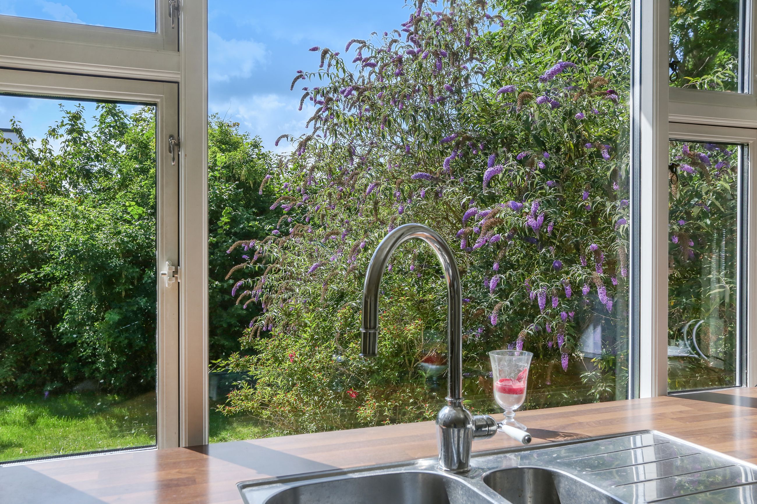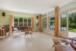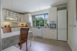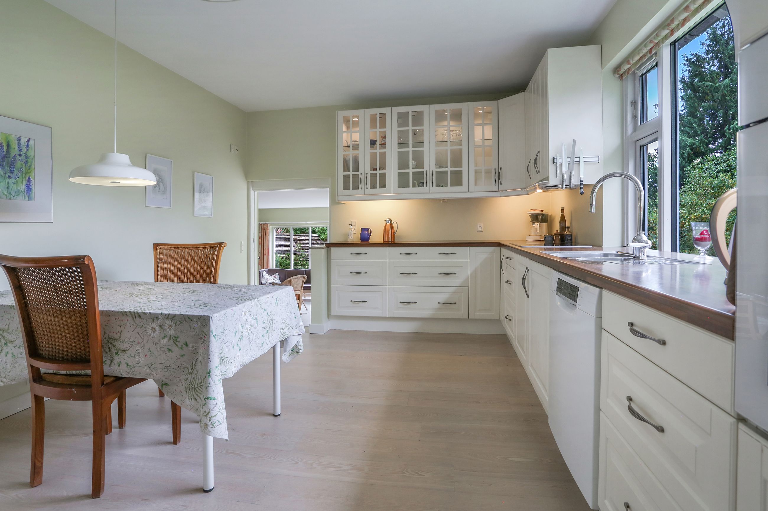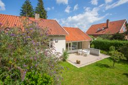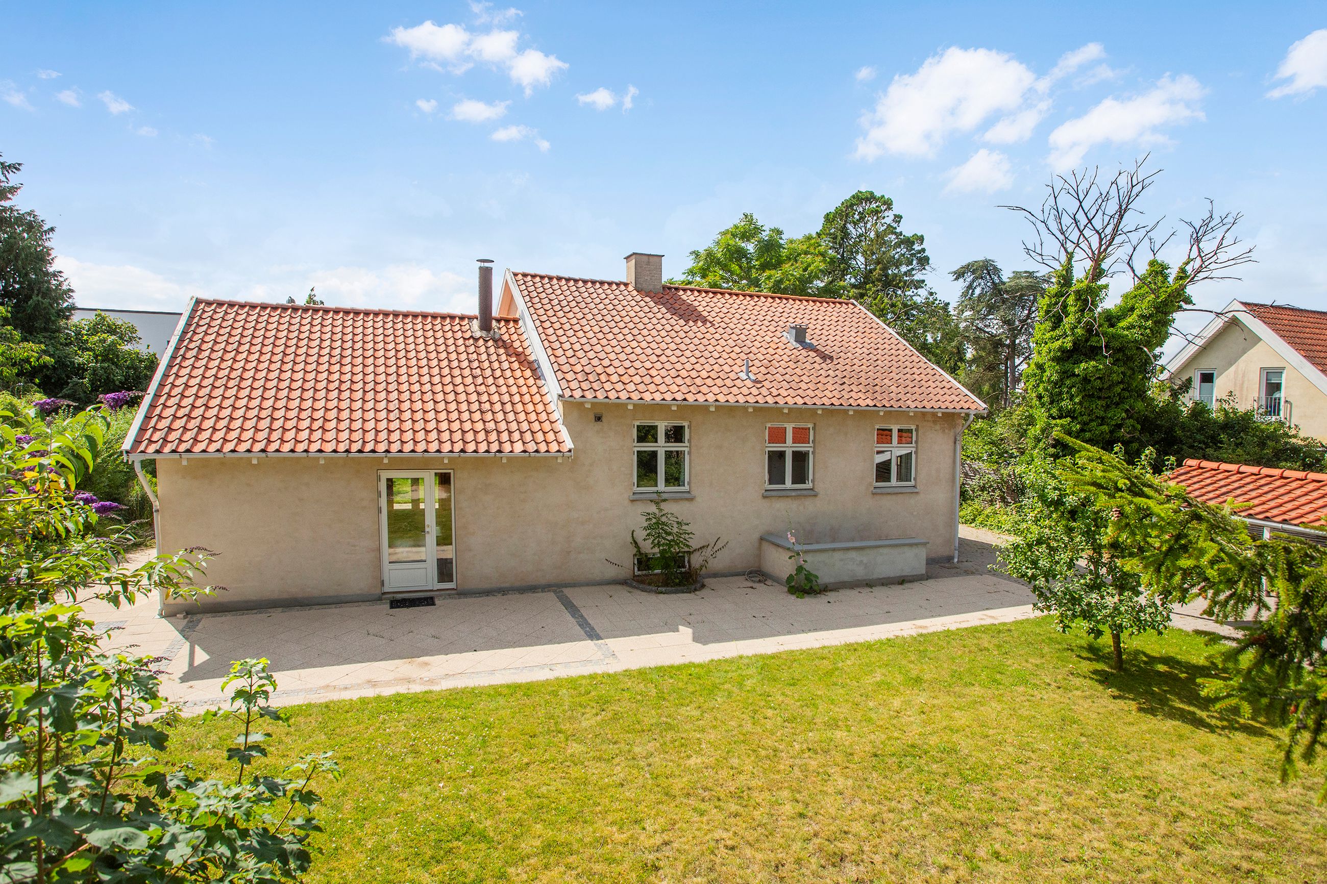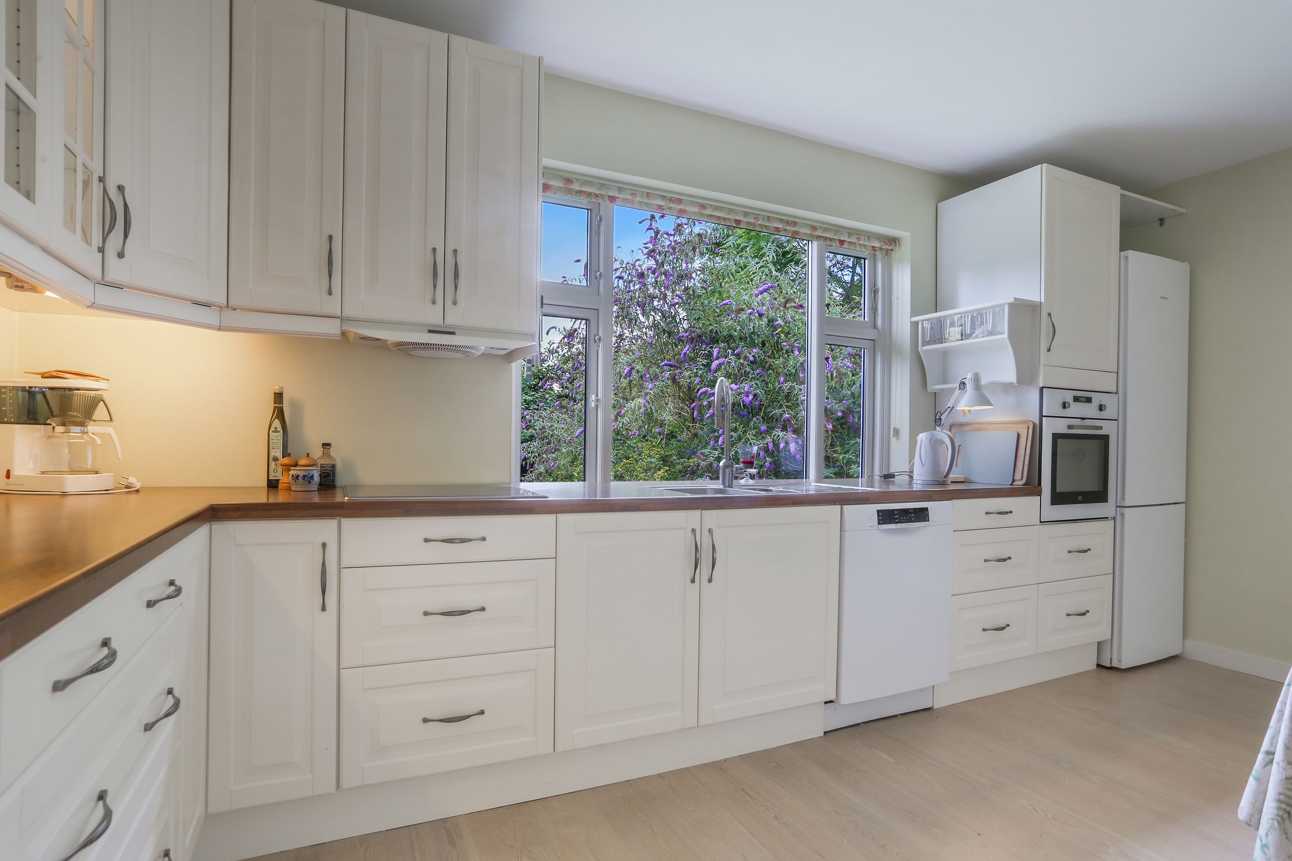 Det rummelige spisekøkken er hjemmets hjerte, hvor familien kan samles om måltiderne. Herfra fører tre-fire trin ned til den store tilbygning, som huser en lys og indbydende opholdsstue. Stuen har direkte udgang til en solrig terrasse, hvor du kan nyde morgenkaffen eller grille med vennerne på de lange sommeraftener.