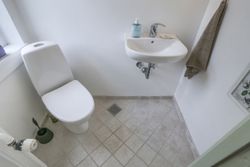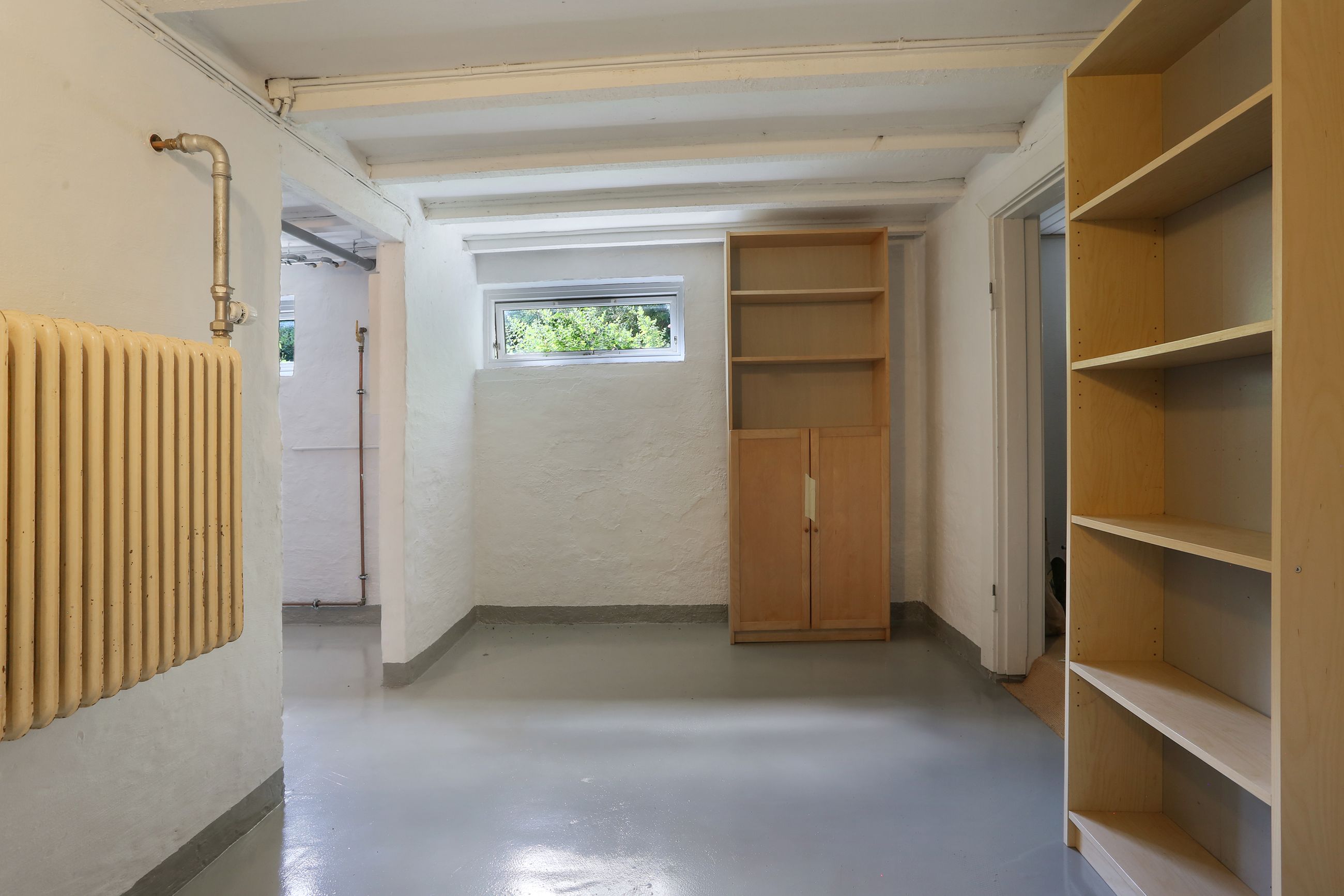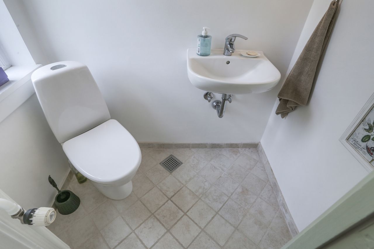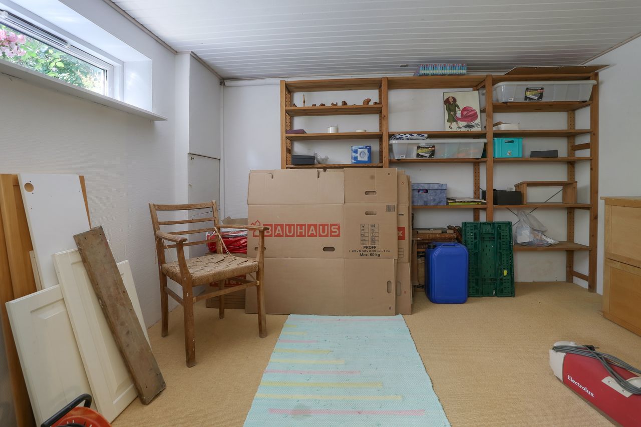 Ejendommen byder desuden på både et gæstetoilet og et badeværelse, hvilket gør det nemt at håndtere hverdagens travlhed uden kø ved badeværelset om morgenen. Kælderen er yderst funktionel med flere disponible rum samt et praktisk bryggers – ideelt til opbevaring eller hobbyprojekter.