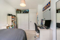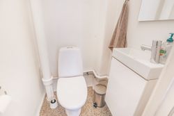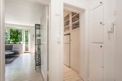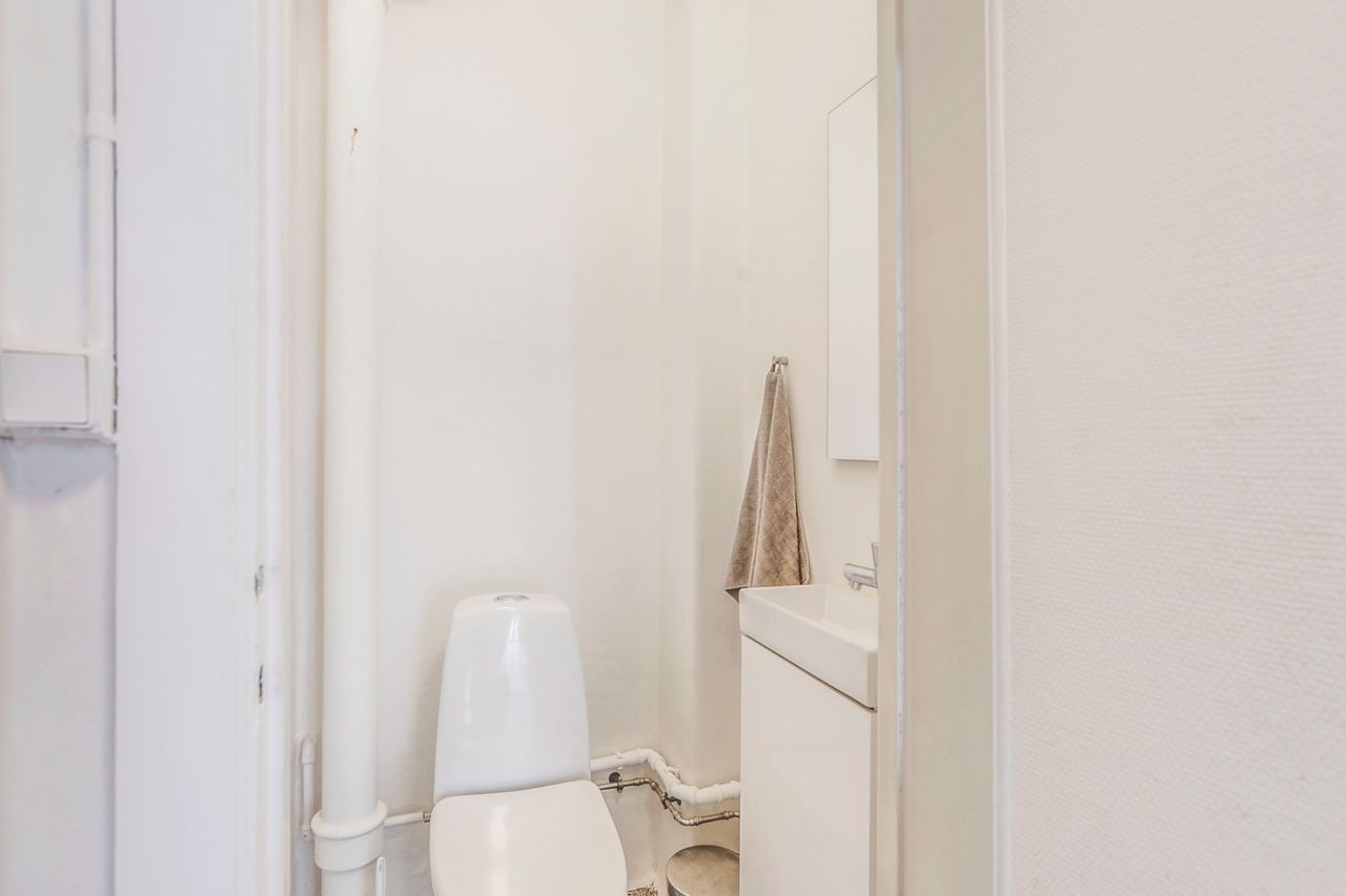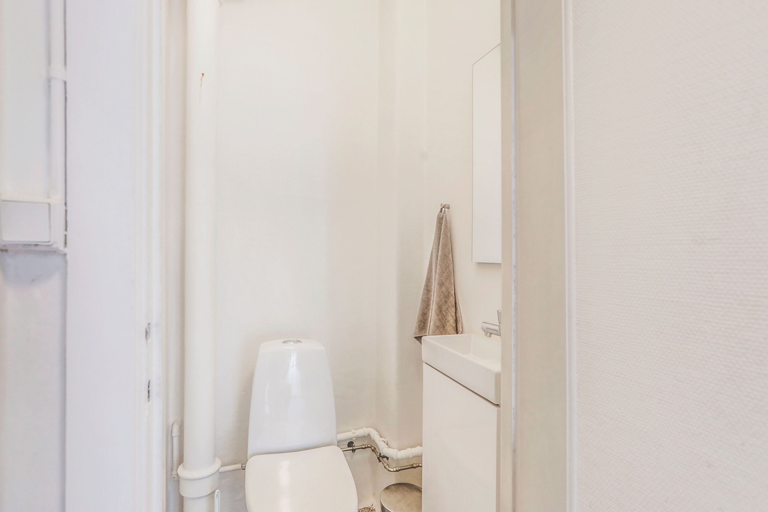 Det store soveværelse tilbyder rigelig plads samt direkte adgang til badeværelset, hvilket gør det nemt at indrette efter behov. Fra entréen finder du også et praktisk toilet. De flotte lyse fyrretræsplankegulve gennem hele lejligheden bidrager yderligere til den hyggelige atmosfære.