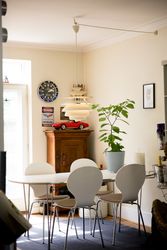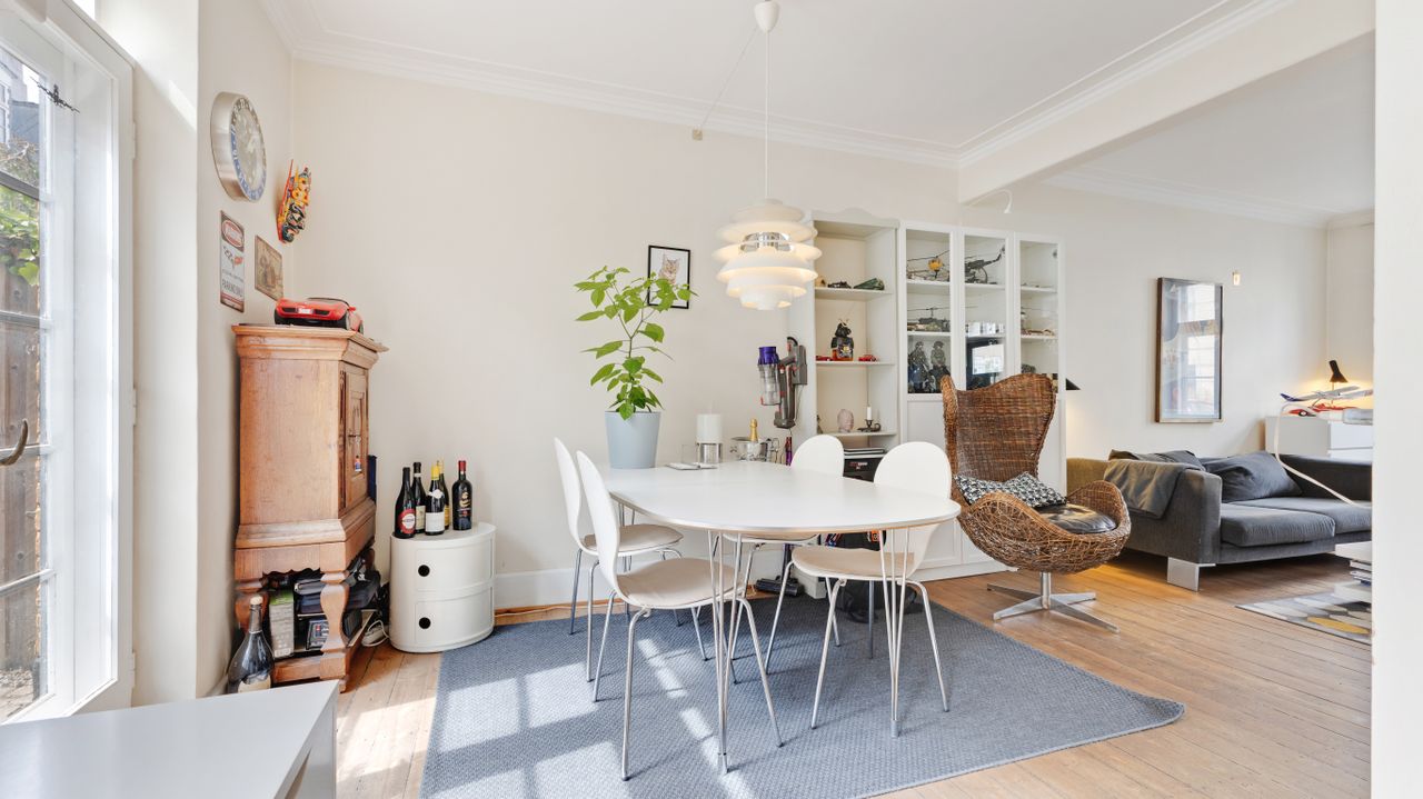 Planløsningen byder på fire etager, herunder stueplan med en indbydende, rummelig hall med god plads til opbevaring. Herfra åbner hjemmet sig op med en lys opholdsstue, som ligger i naturlig forlængelse af spisestuen og køkkenet, der har kig til den hyggelige baghave. Spisestuen har direkte udgang til haven, og med store vinduespartier mod både for- og bagside strømmer lyset ind hele dagen. Planløsningen giver en åben, behagelig fornemmelse – ideel til både hverdagsliv og gæster. Et gæstetoilet er praktisk placeret i stueplan.