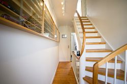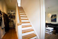 Trappeopgangen skaber en smuk, klassisk gennemgang mellem etagerne og binder hjemmet sammen med en fornemmelse af lys og luft. Et hus med sjæl, funktionalitet og masser af plads til familieliv i unikke omgivelser.