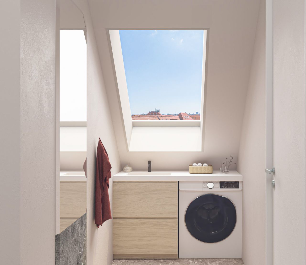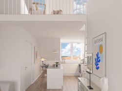 Det er ikke en ombygning. Det er ikke et kompromis. Det er 100 % nybyggeri, designet fra bunden med øje for lys, luft, komfort og æstetik. Hver lejlighed har sin egen unikke karakter, men fælles for dem alle er en generøs loftshøjde med hems, som giver en fantastisk rumfornemmelse og masser af naturligt lys fra både vinduer og ovenlys. Det lyse interiør skaber en behagelig stemning, som får dig til at føle dig hjemme med det samme. Køkkenerne er moderne og gennemtænkt, både æstetisk og funktionelt. De rummelige soveværelser indbyder til ro og velvære, og badeværelserne er udført i nøje udvalgte kvalitetsmaterialer.