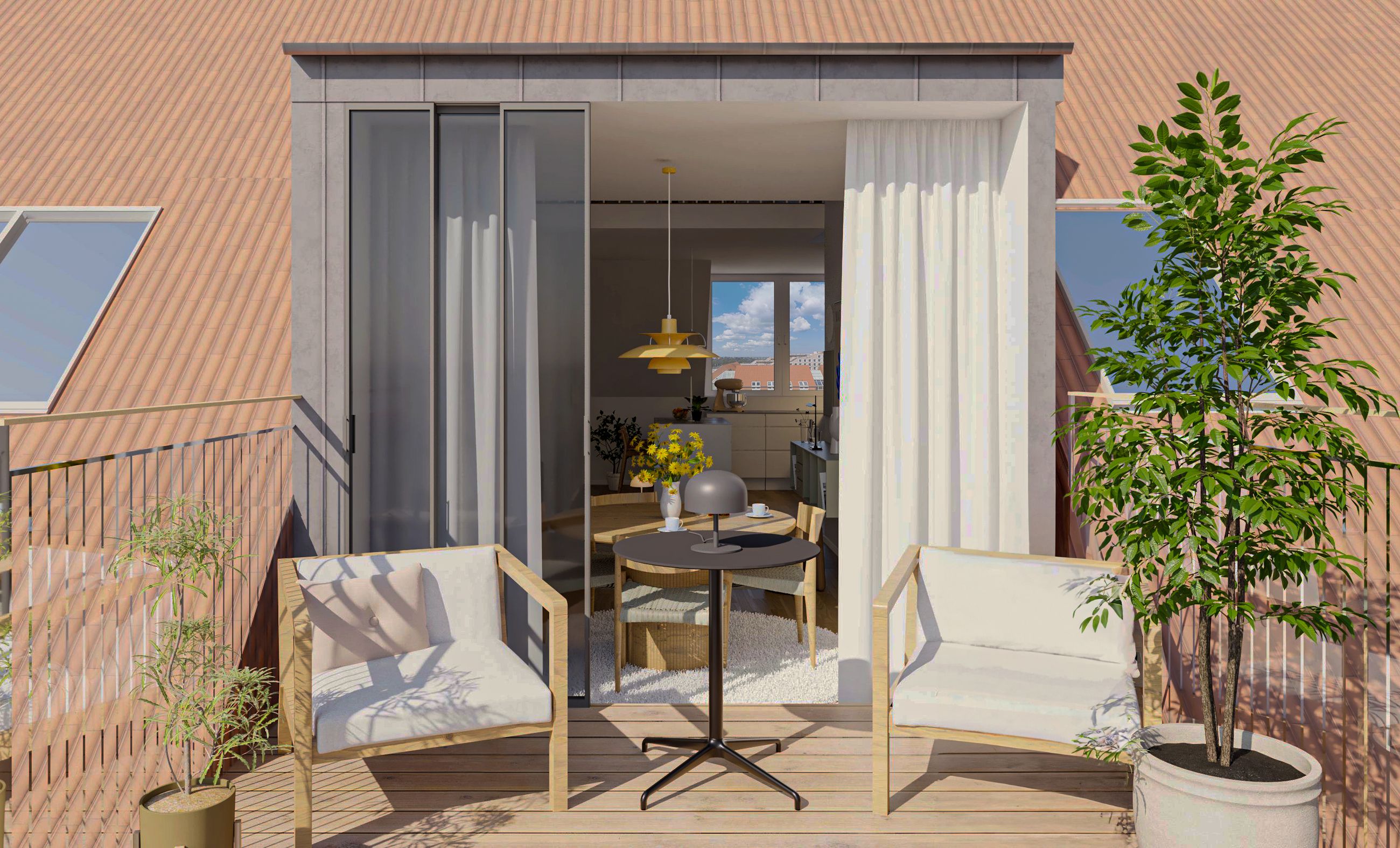 Fra din altan kan du nyde udsigten til den rolige, grønne baggård. Selvom du bor øverst, mærker du stadig en fin forbindelse til omgivelserne. Her får du et fredeligt åndehul – perfekt til kaffe, en god bog eller bare et øjeblik med udsigten.