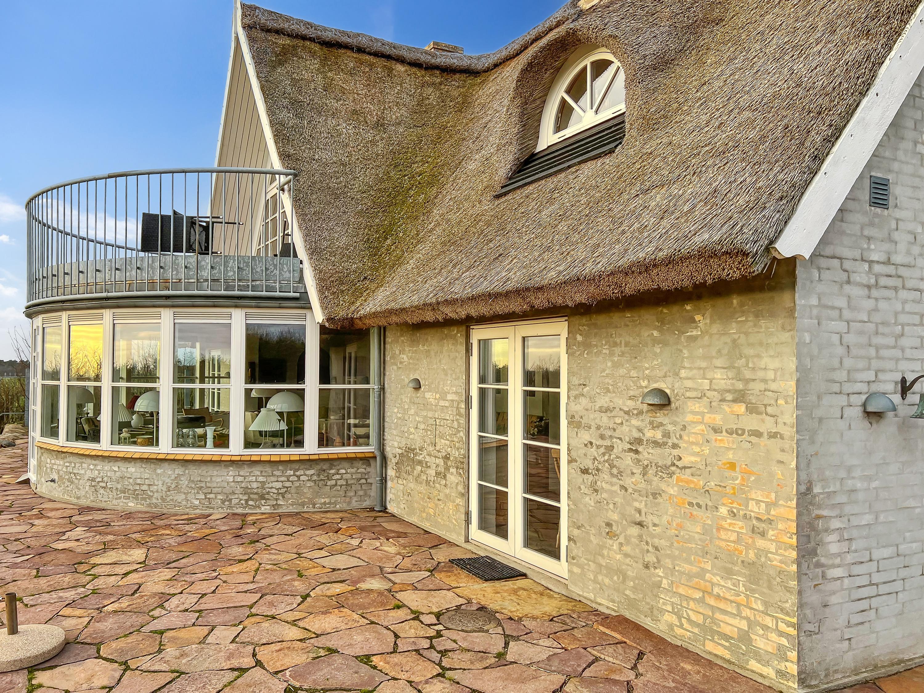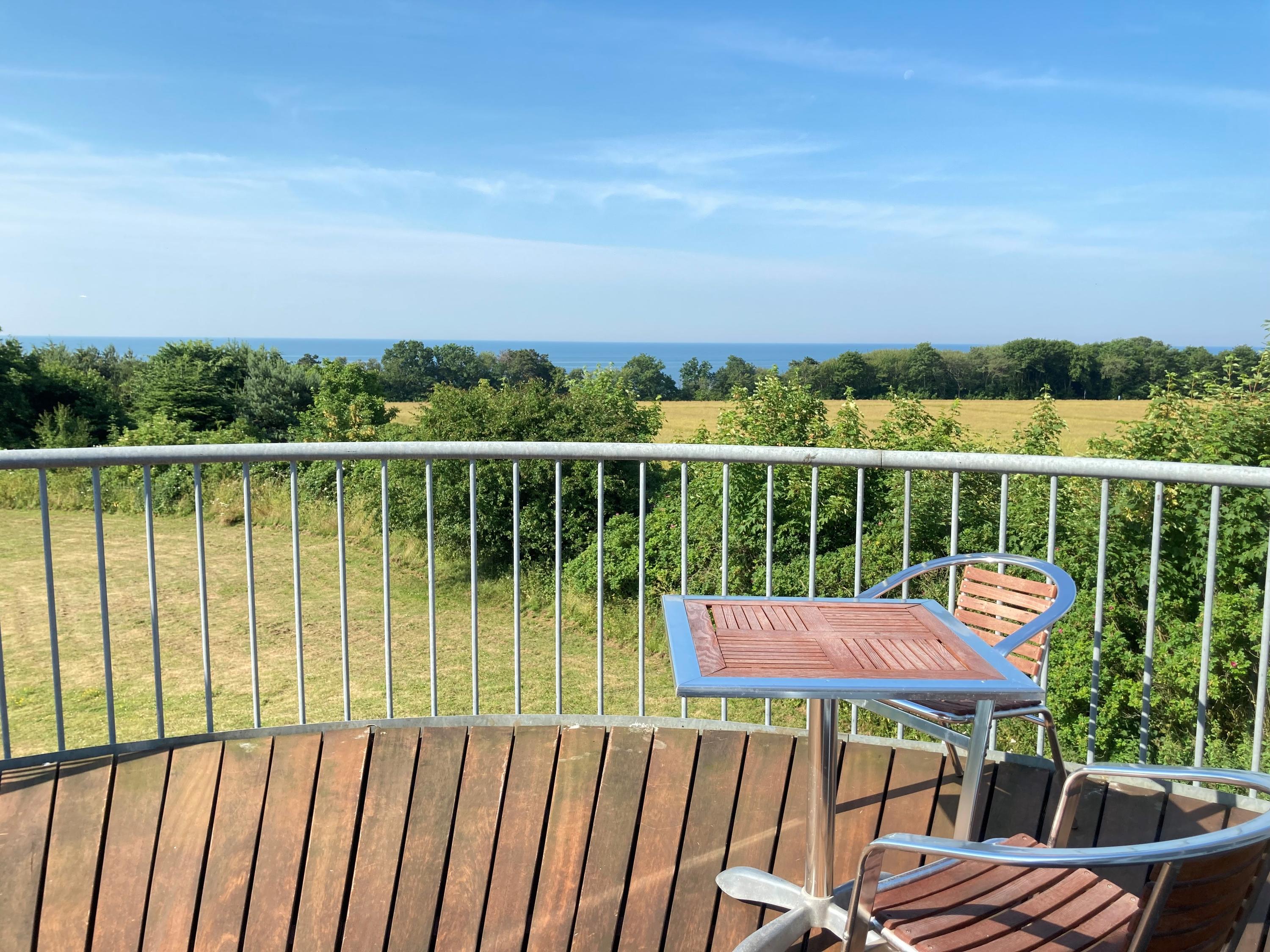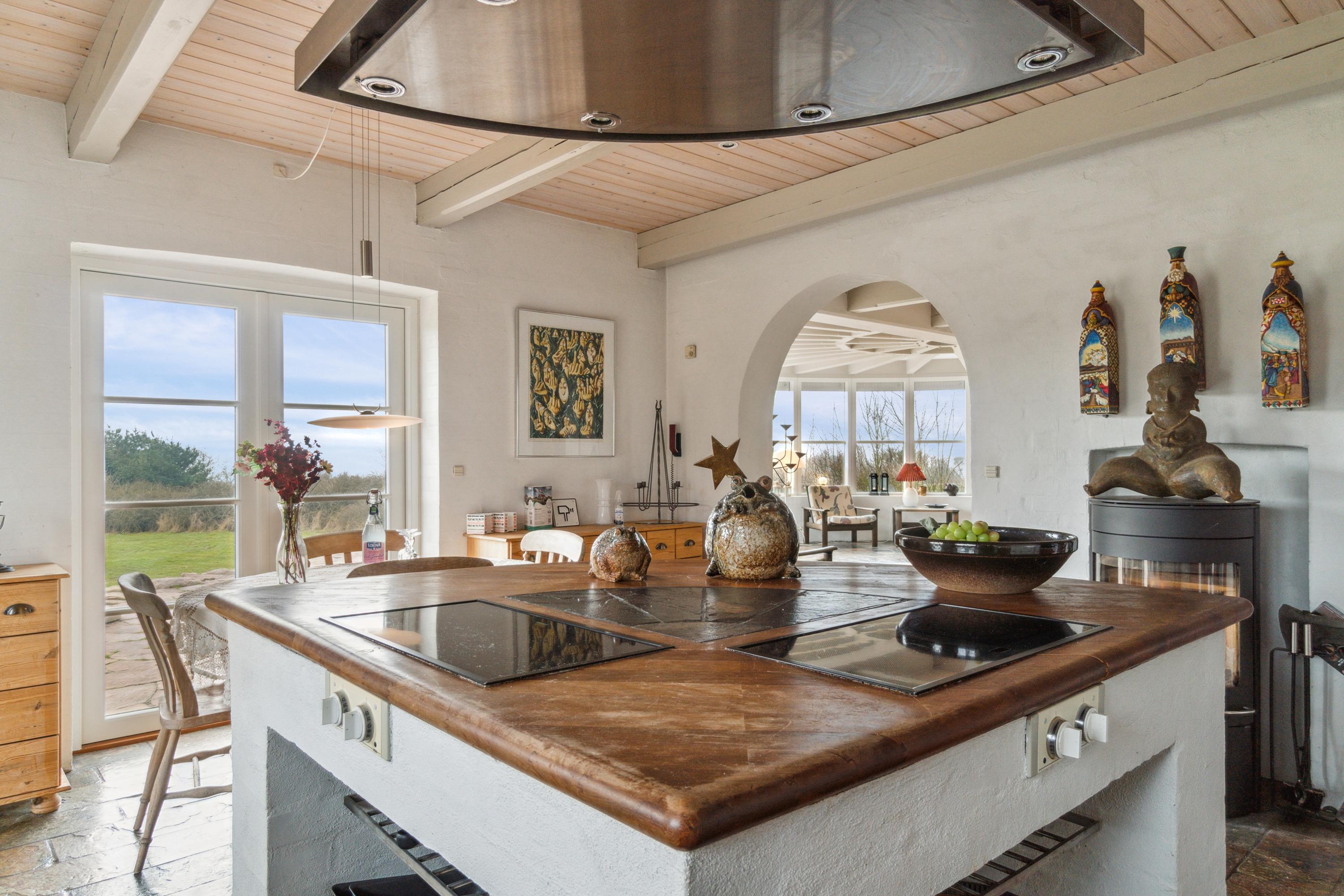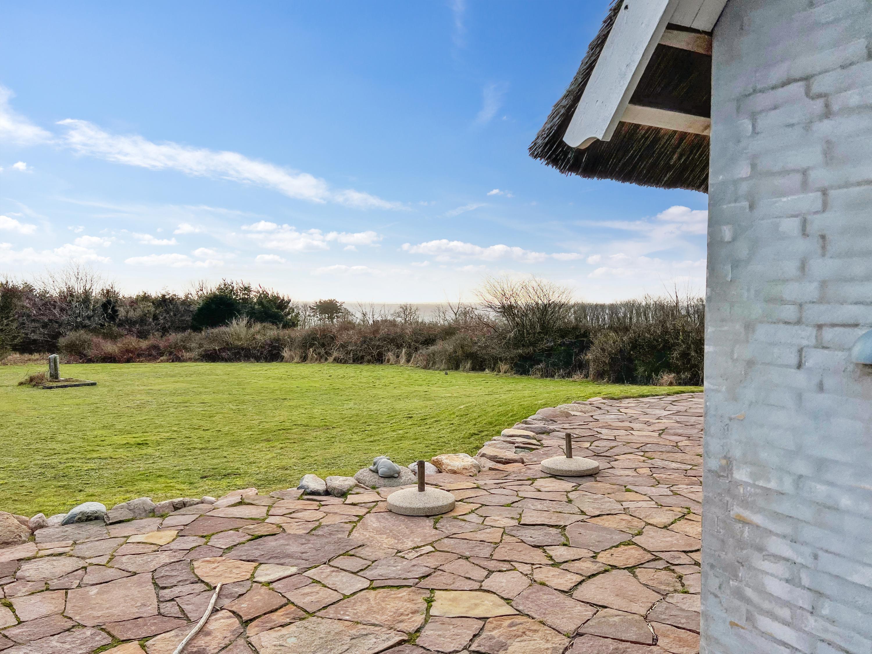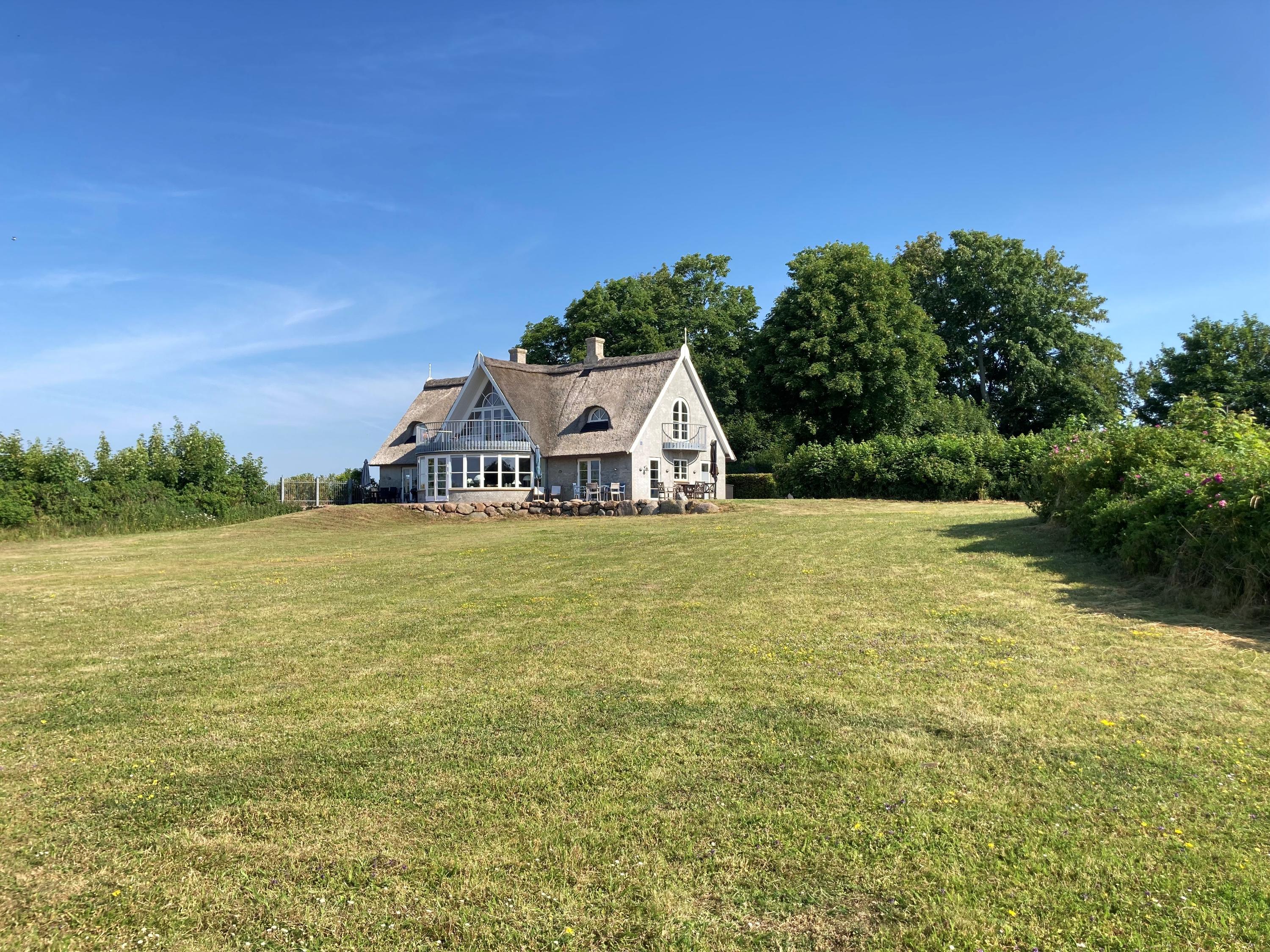 Fritidshus med stråtag, højt beliggende med panoramaudsigt over marker og Østersøen. Tilbagetrukket fra landevejen.