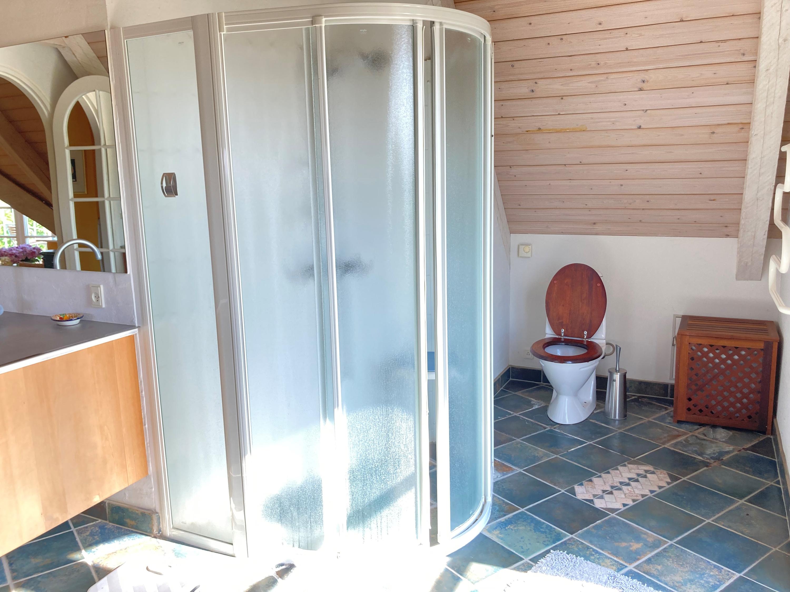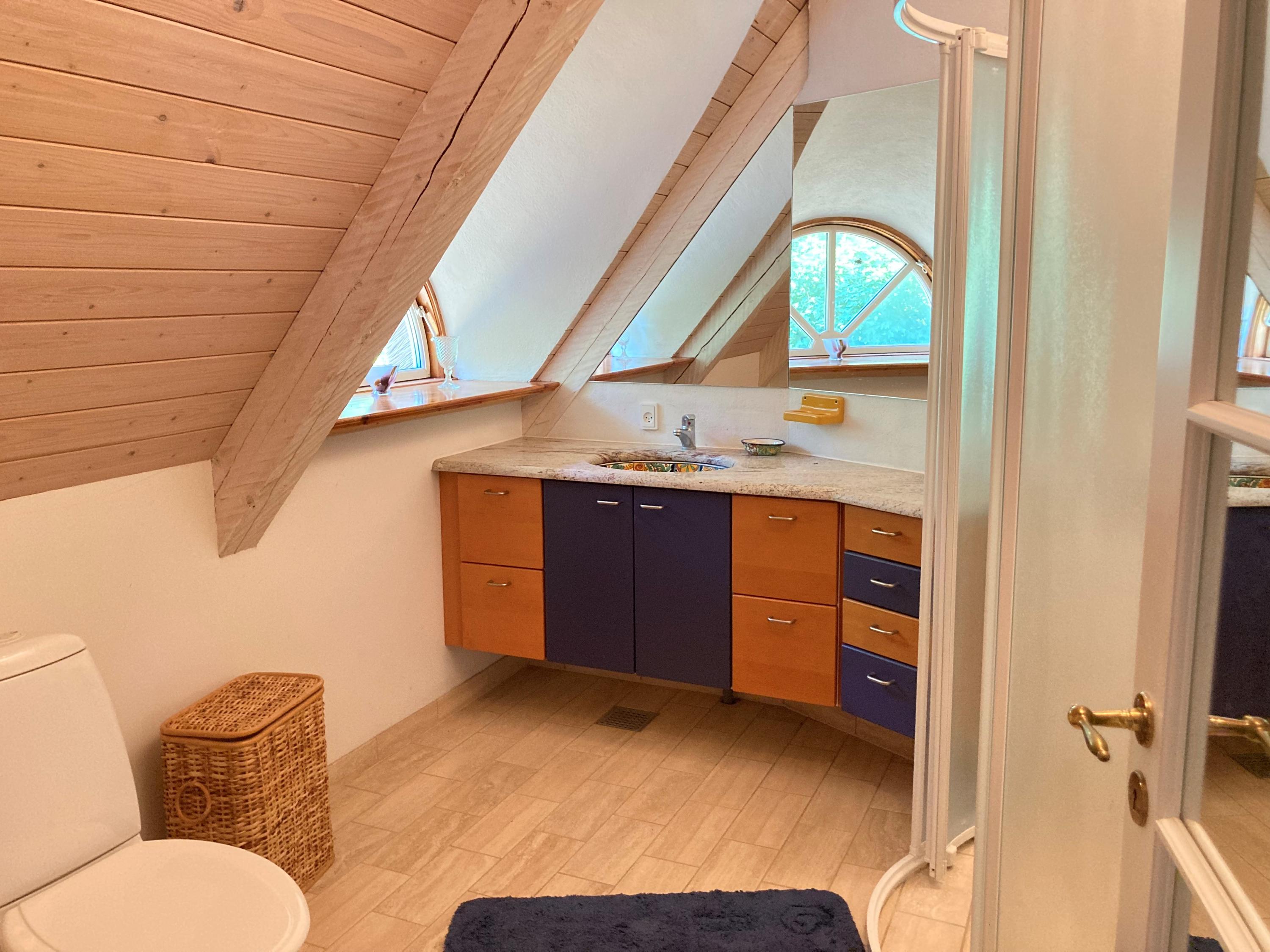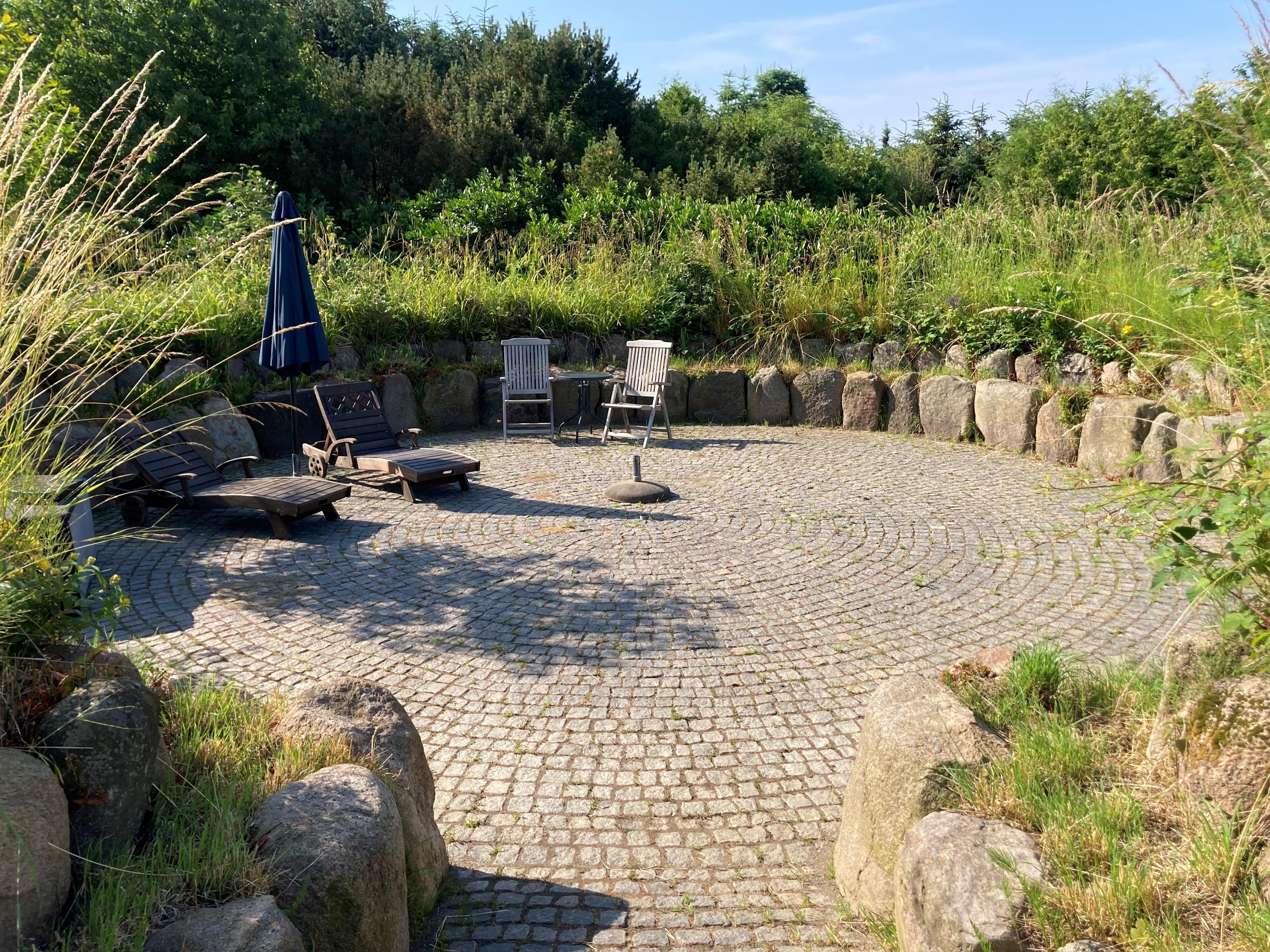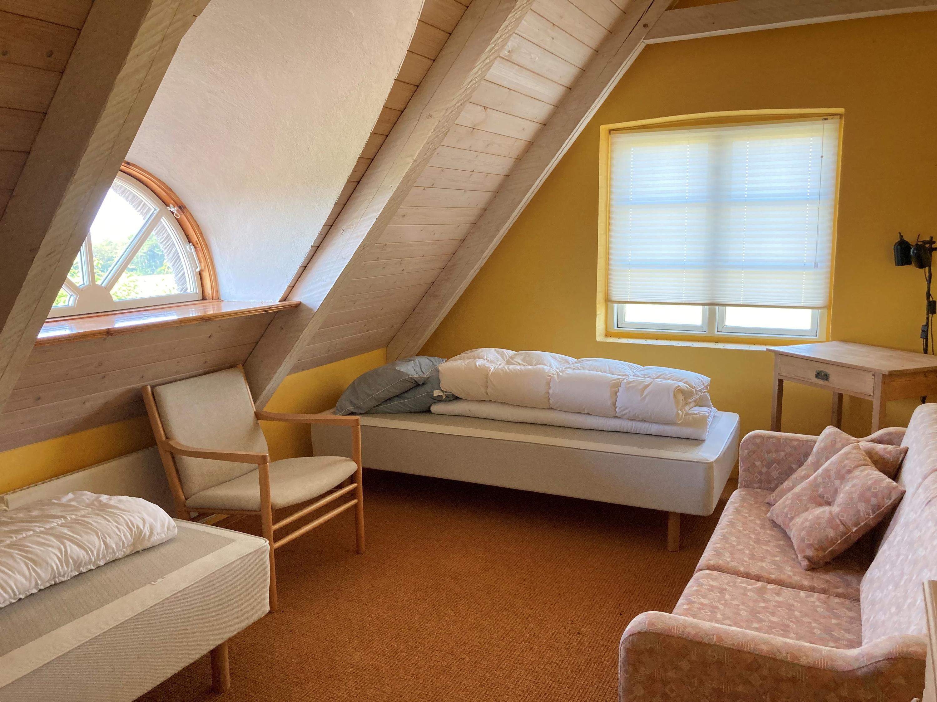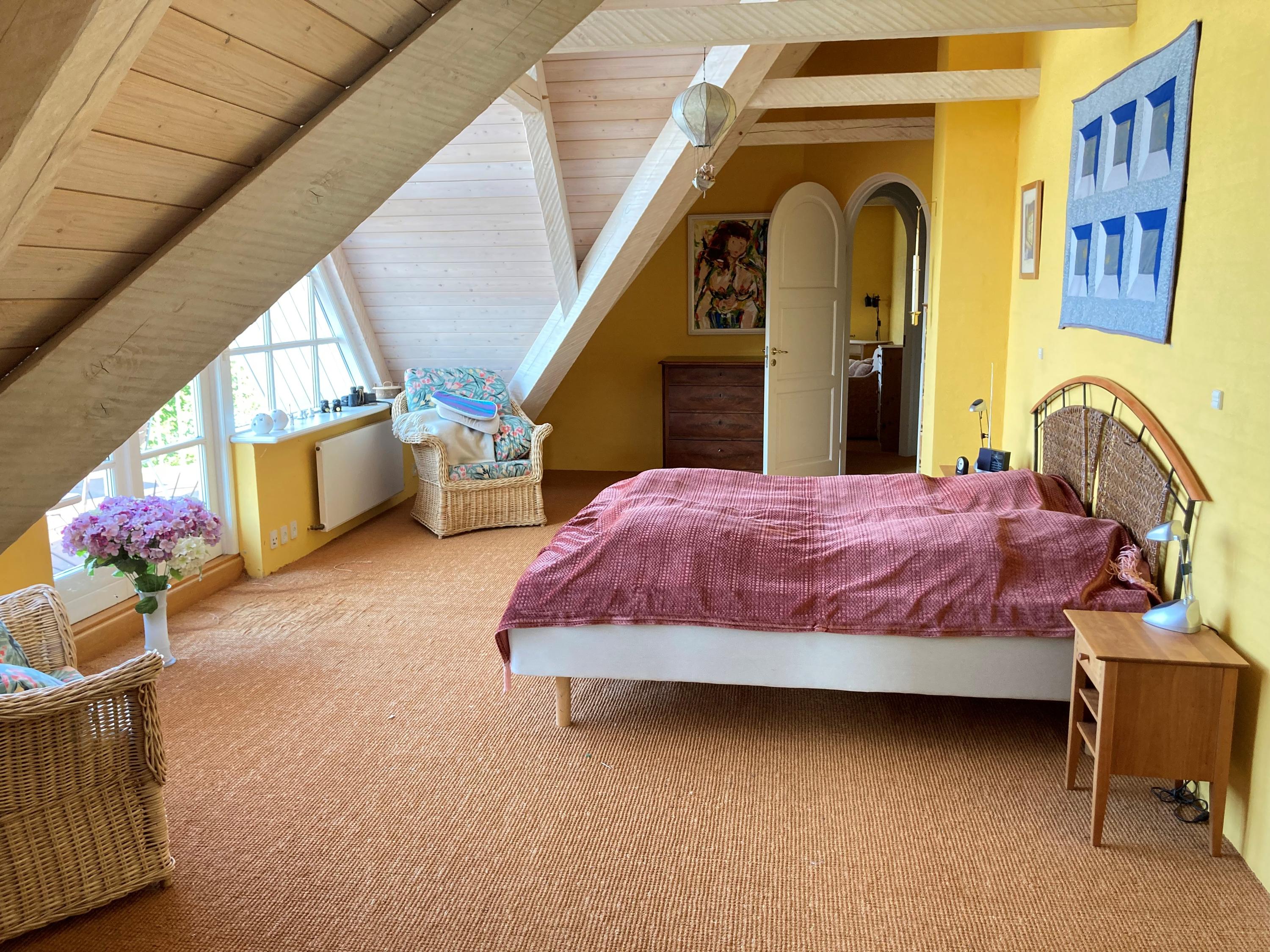 Fritidshus med stråtag, højt beliggende med panoramaudsigt over marker og Østersøen. Tilbagetrukket fra landevejen.