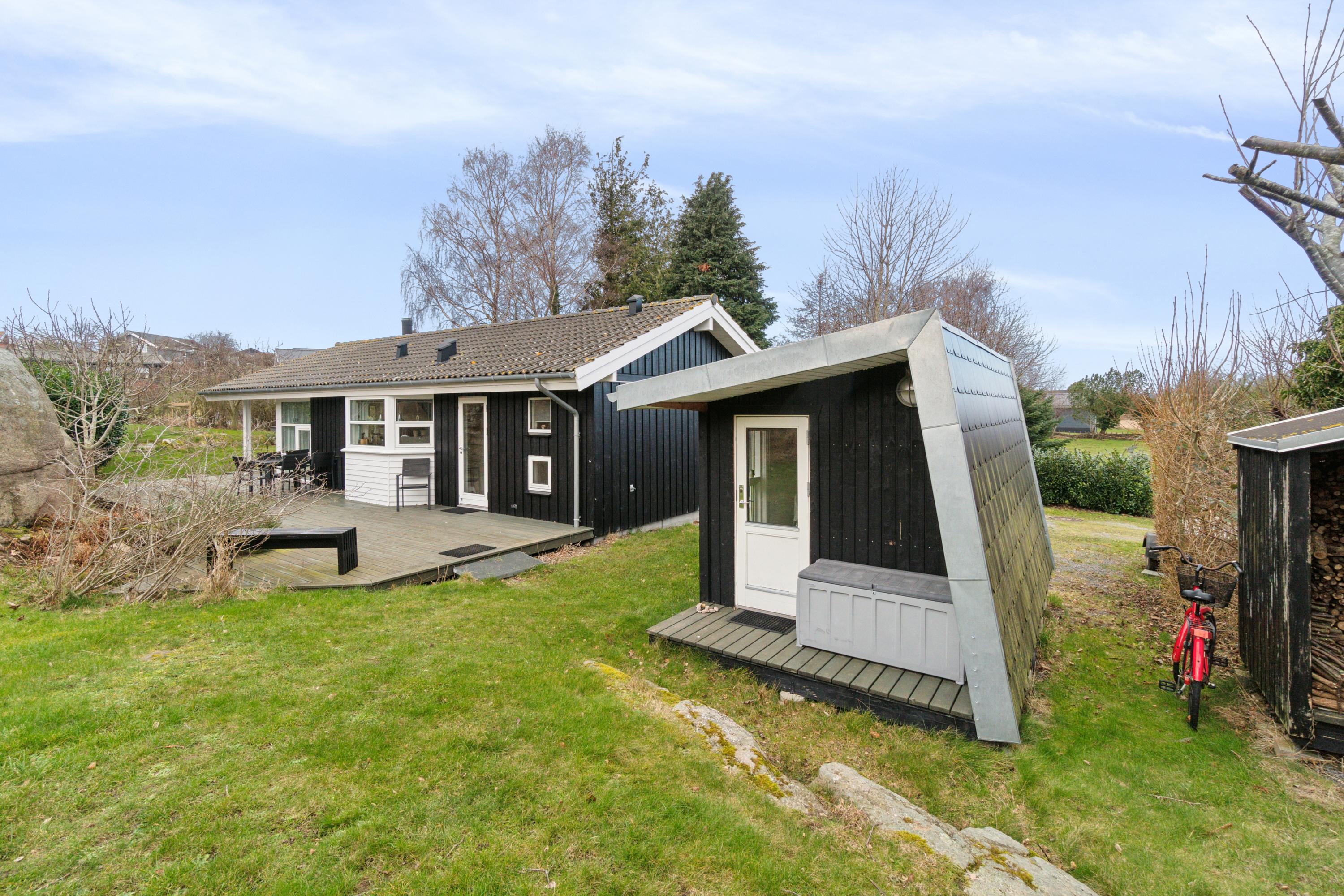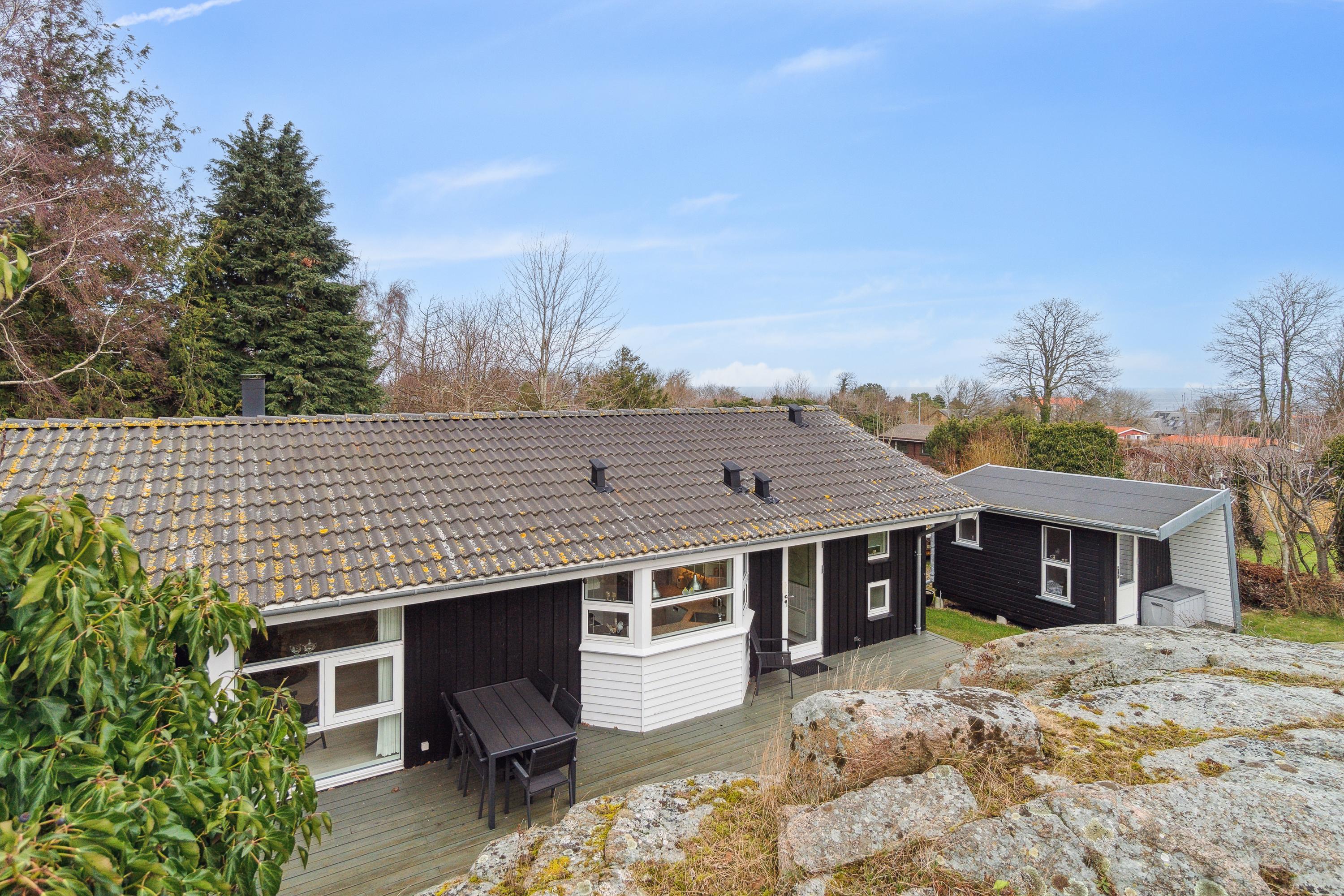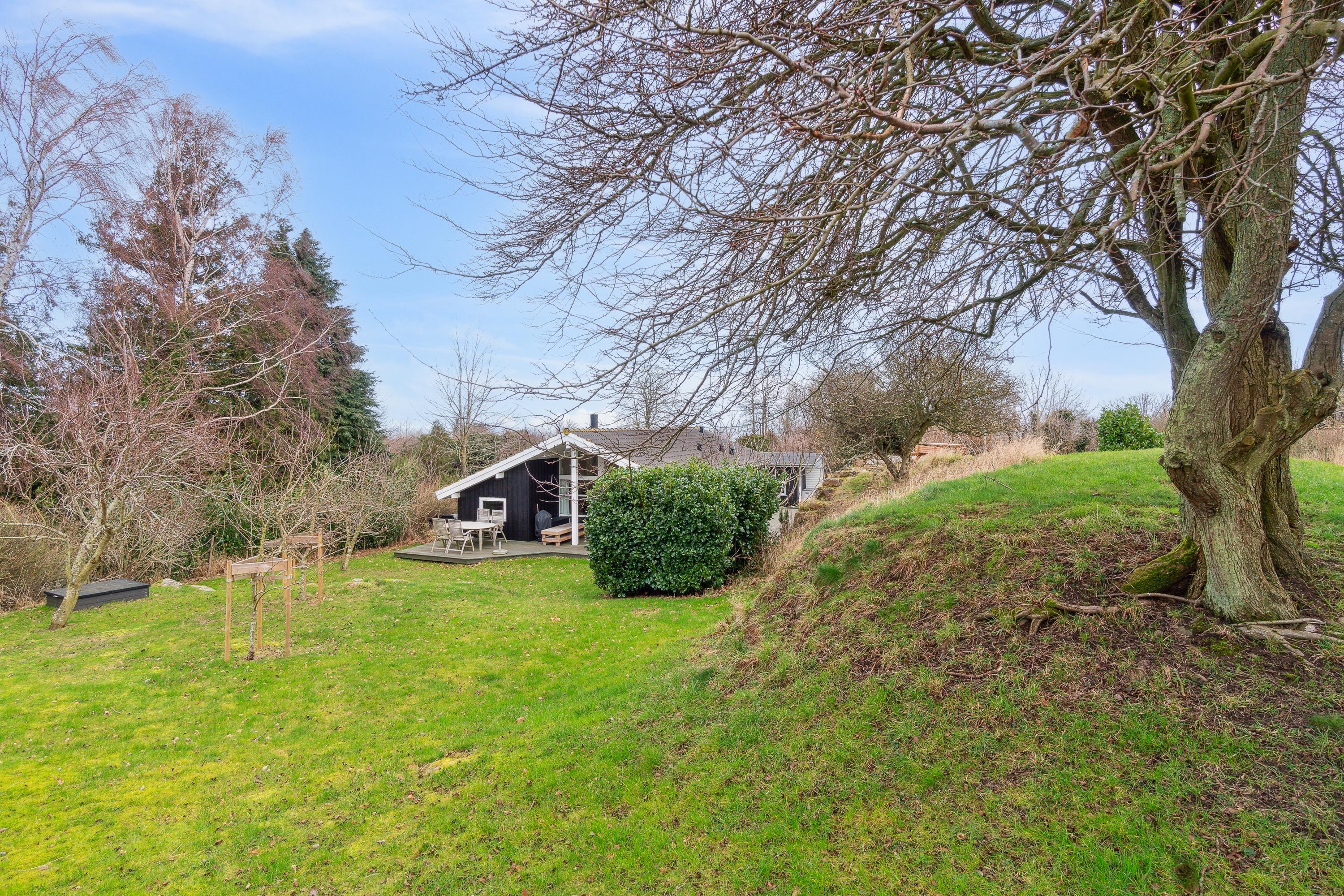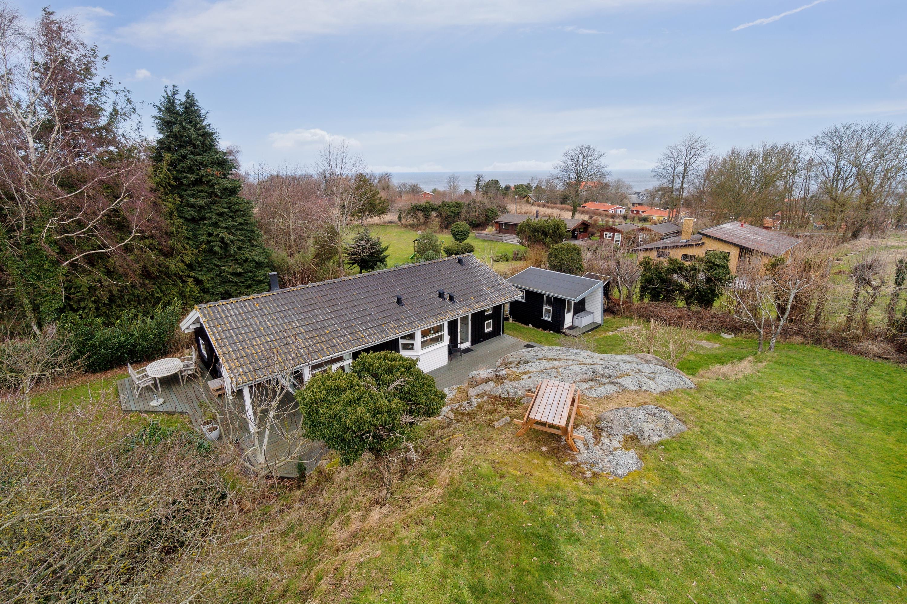 Højt beliggende fritidshus på kuperet grund i naturskønt område, hvor der er havudsigt fra grunden.