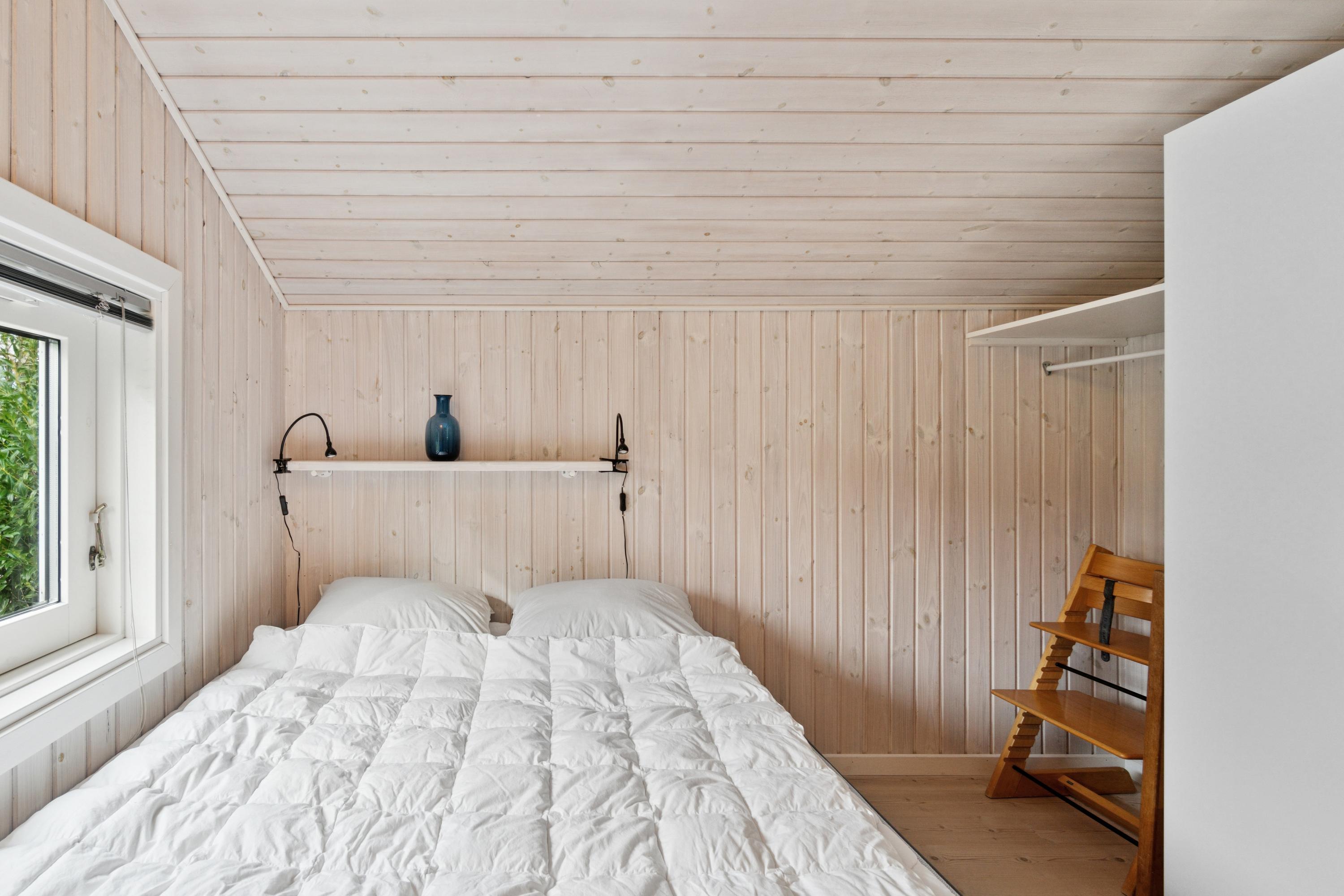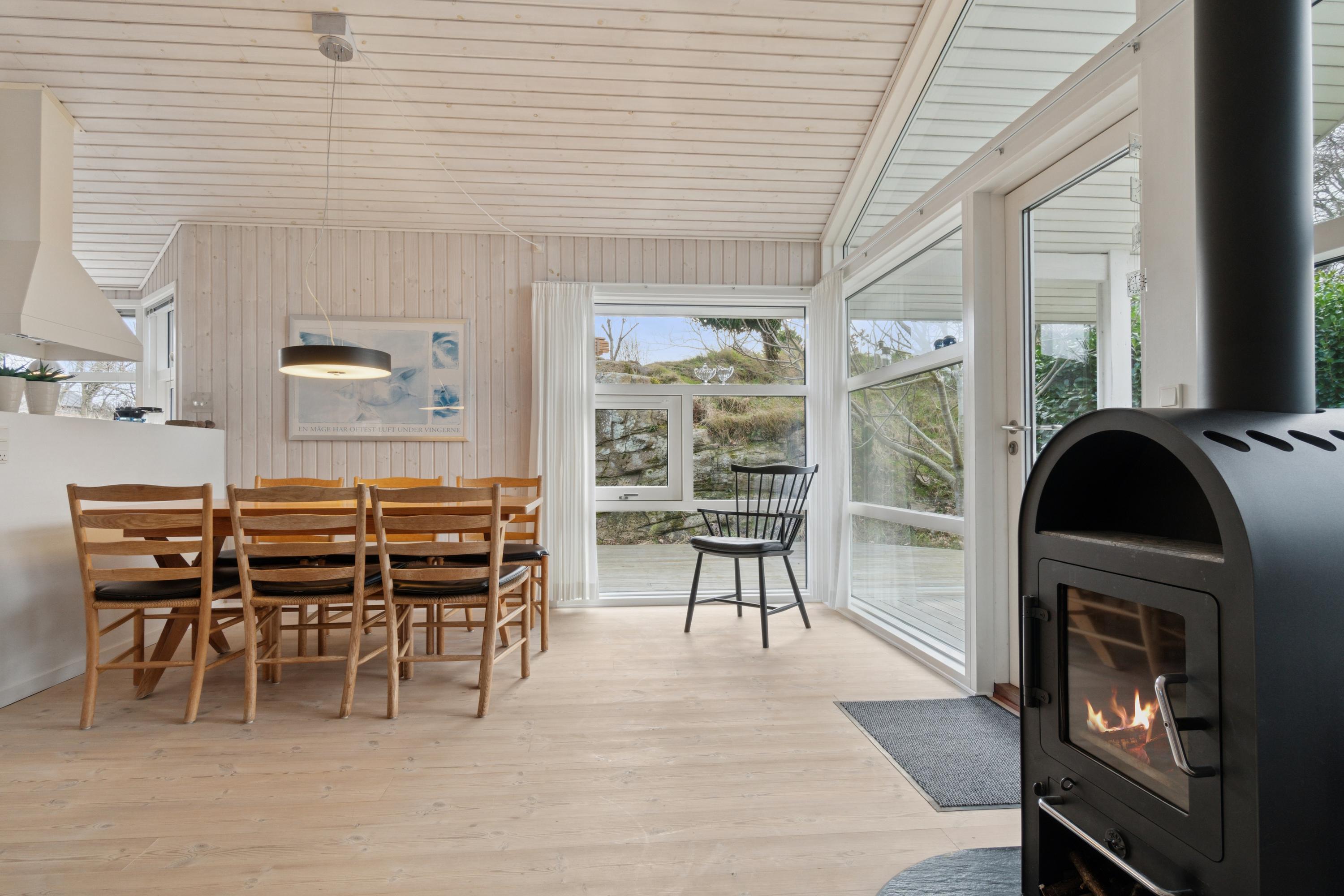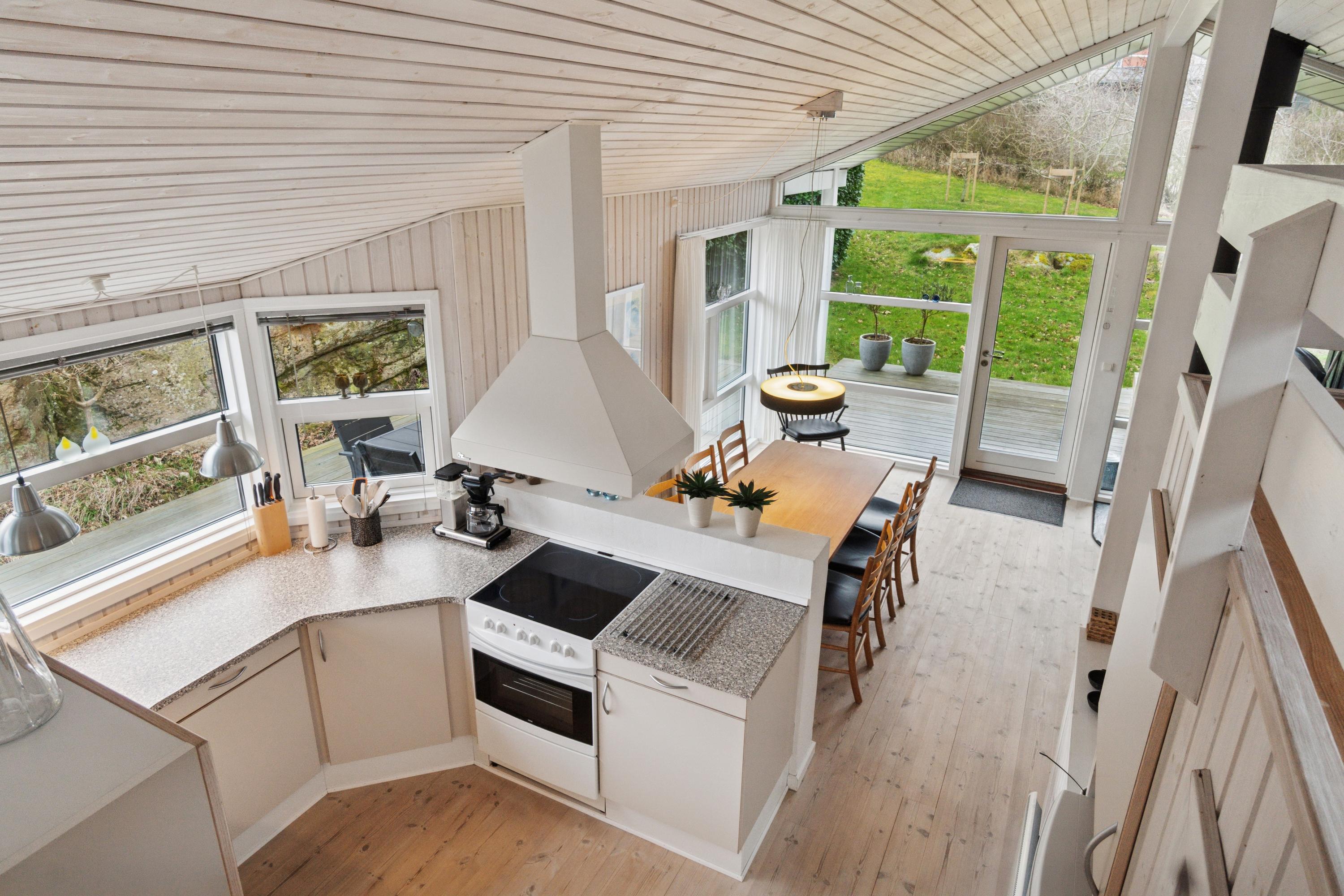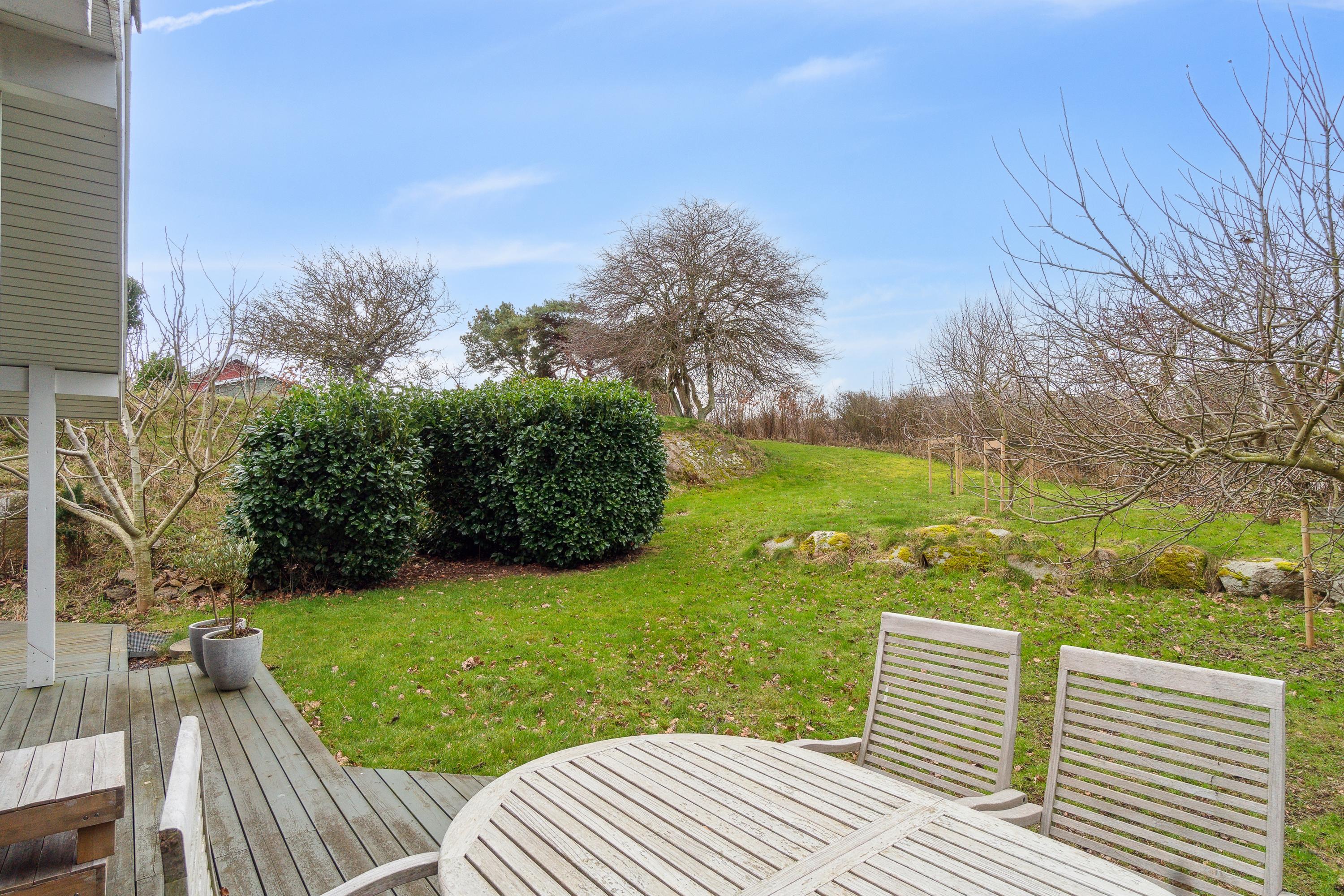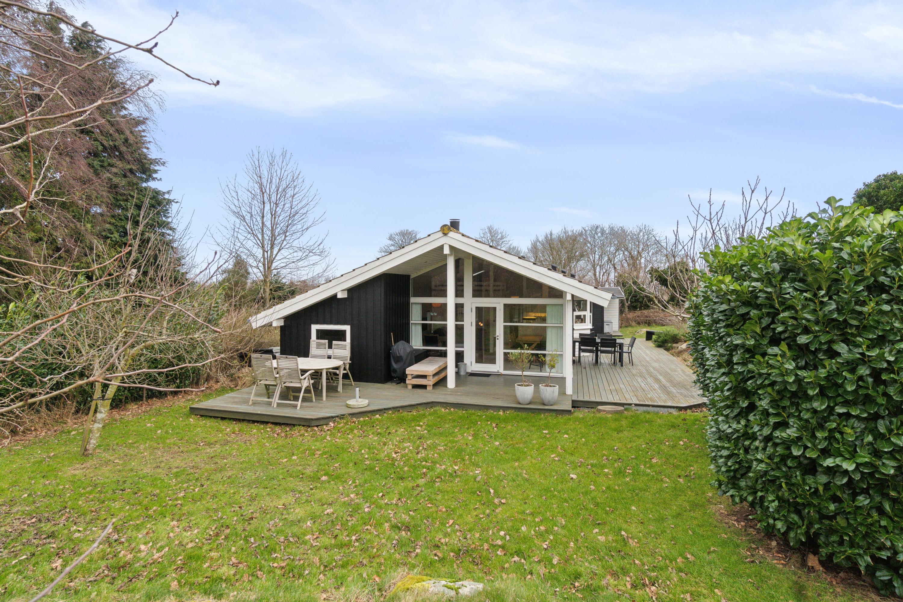 Højt beliggende fritidshus på kuperet grund i naturskønt område, hvor der er havudsigt fra grunden.