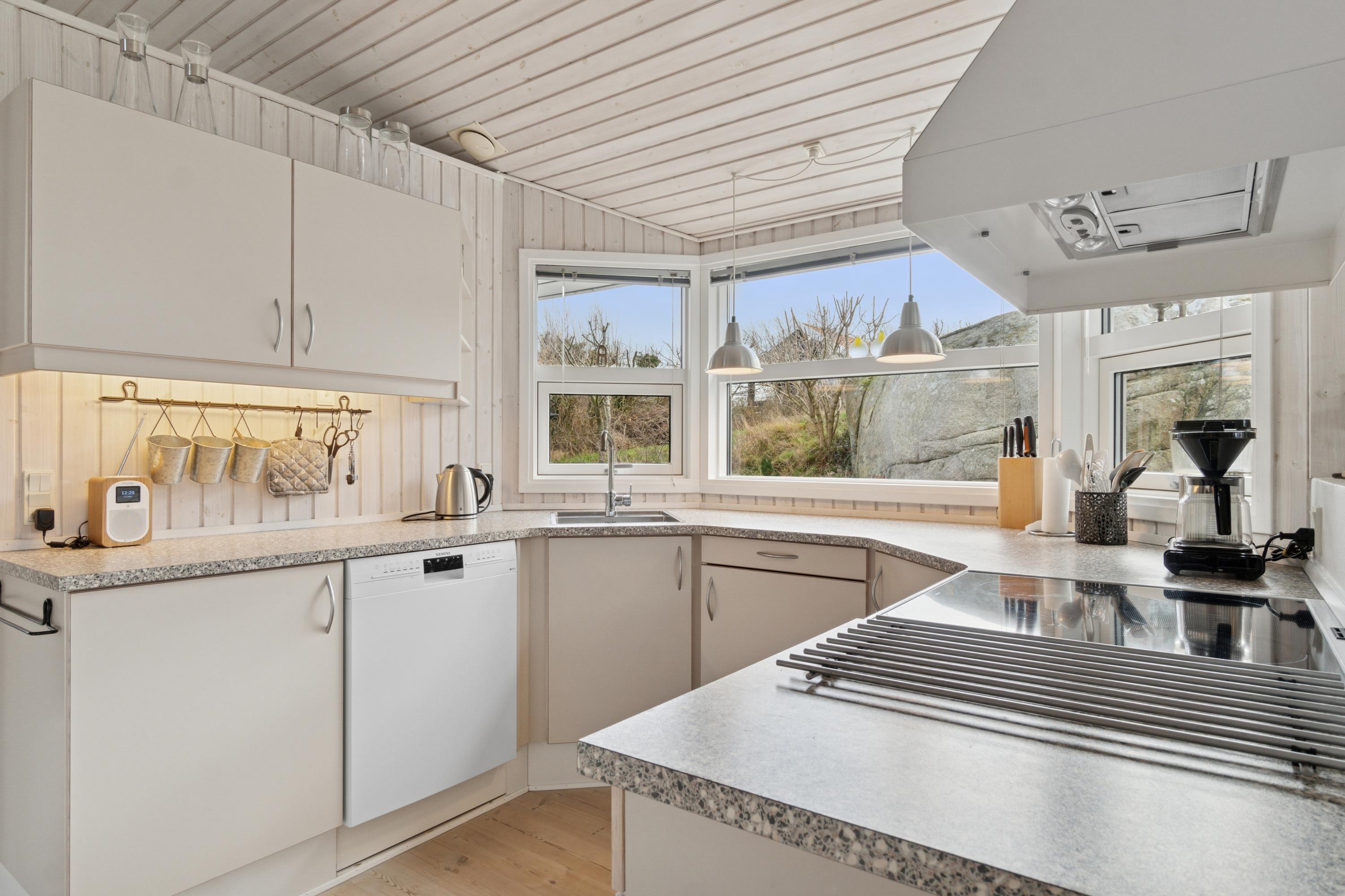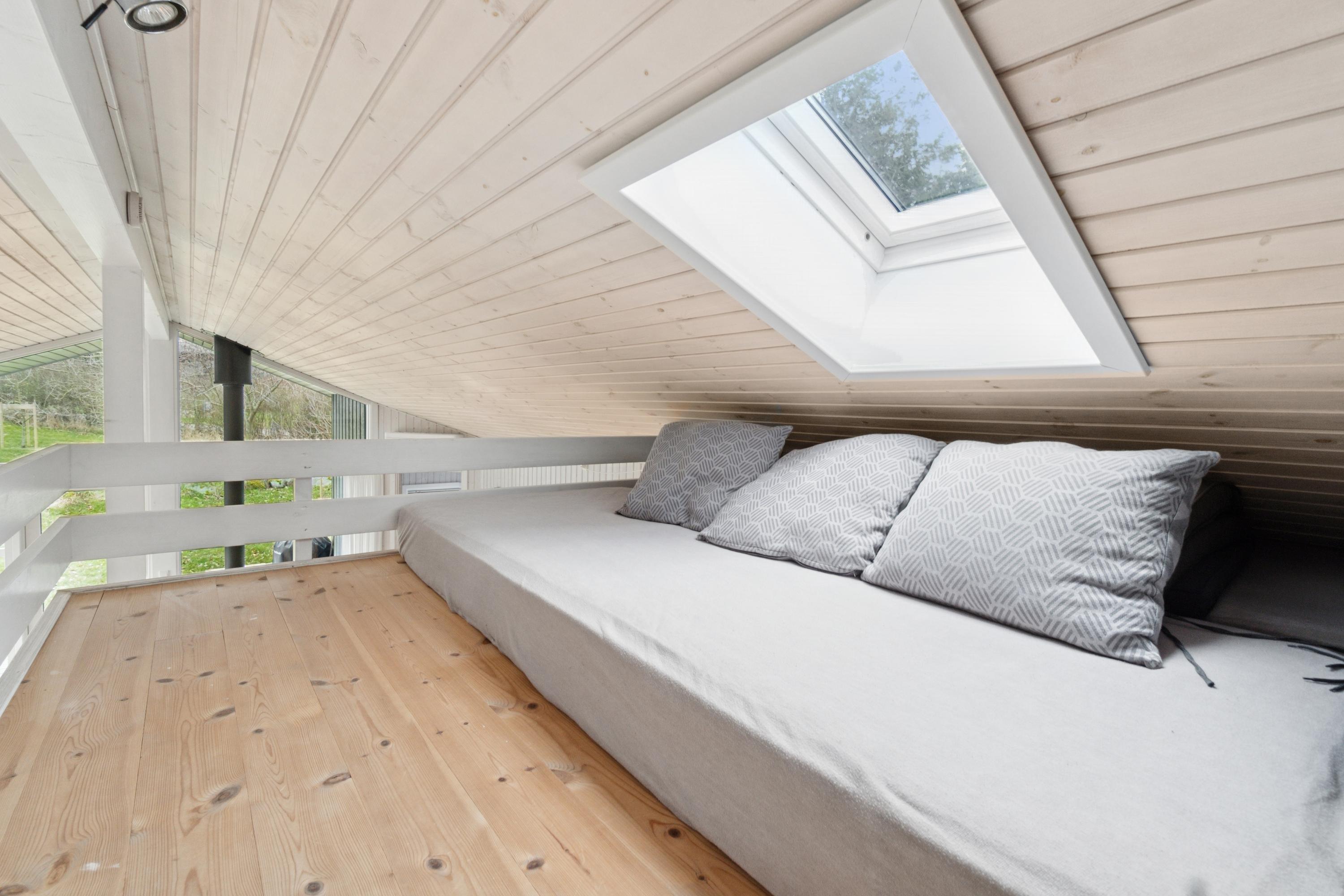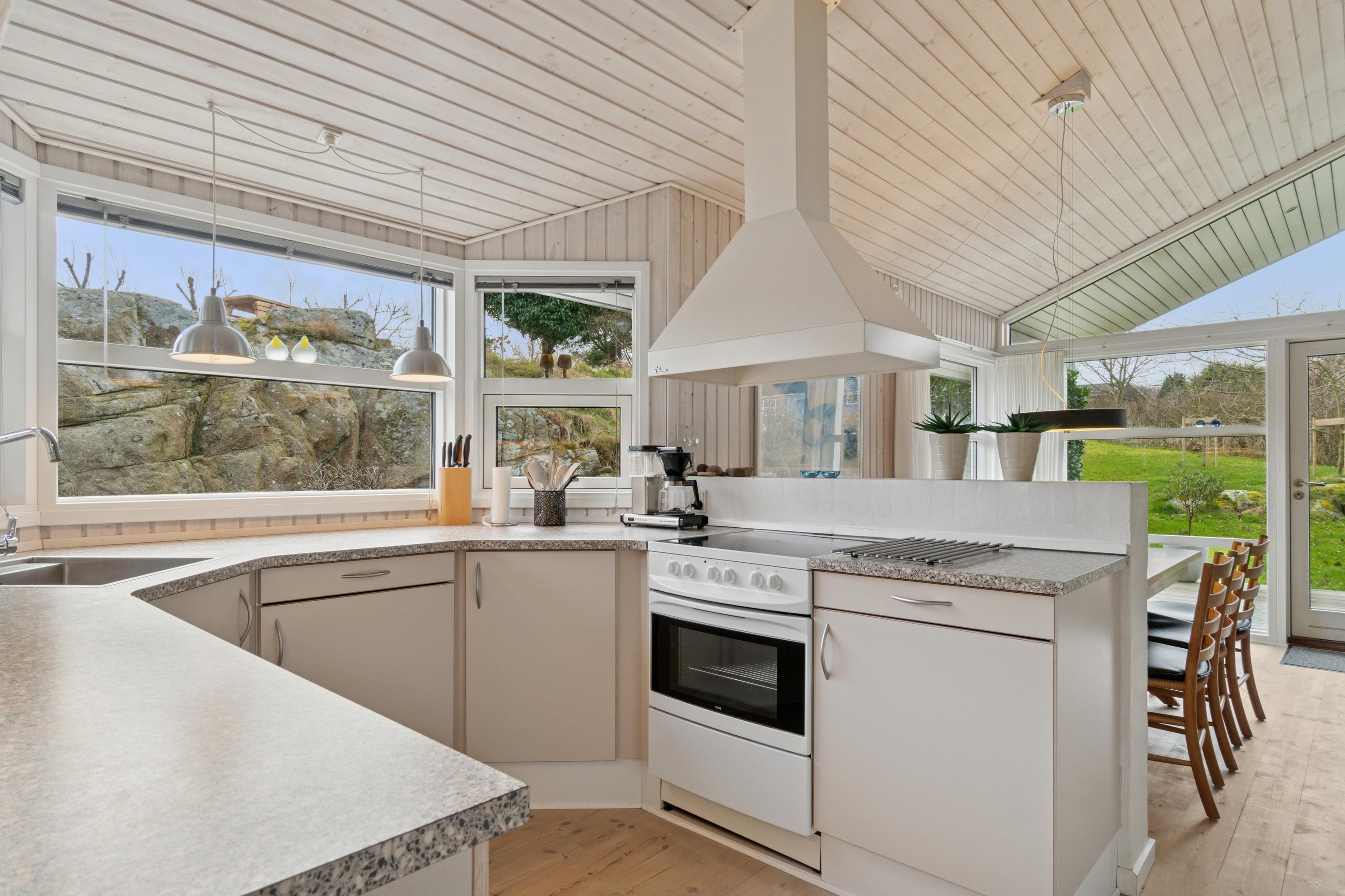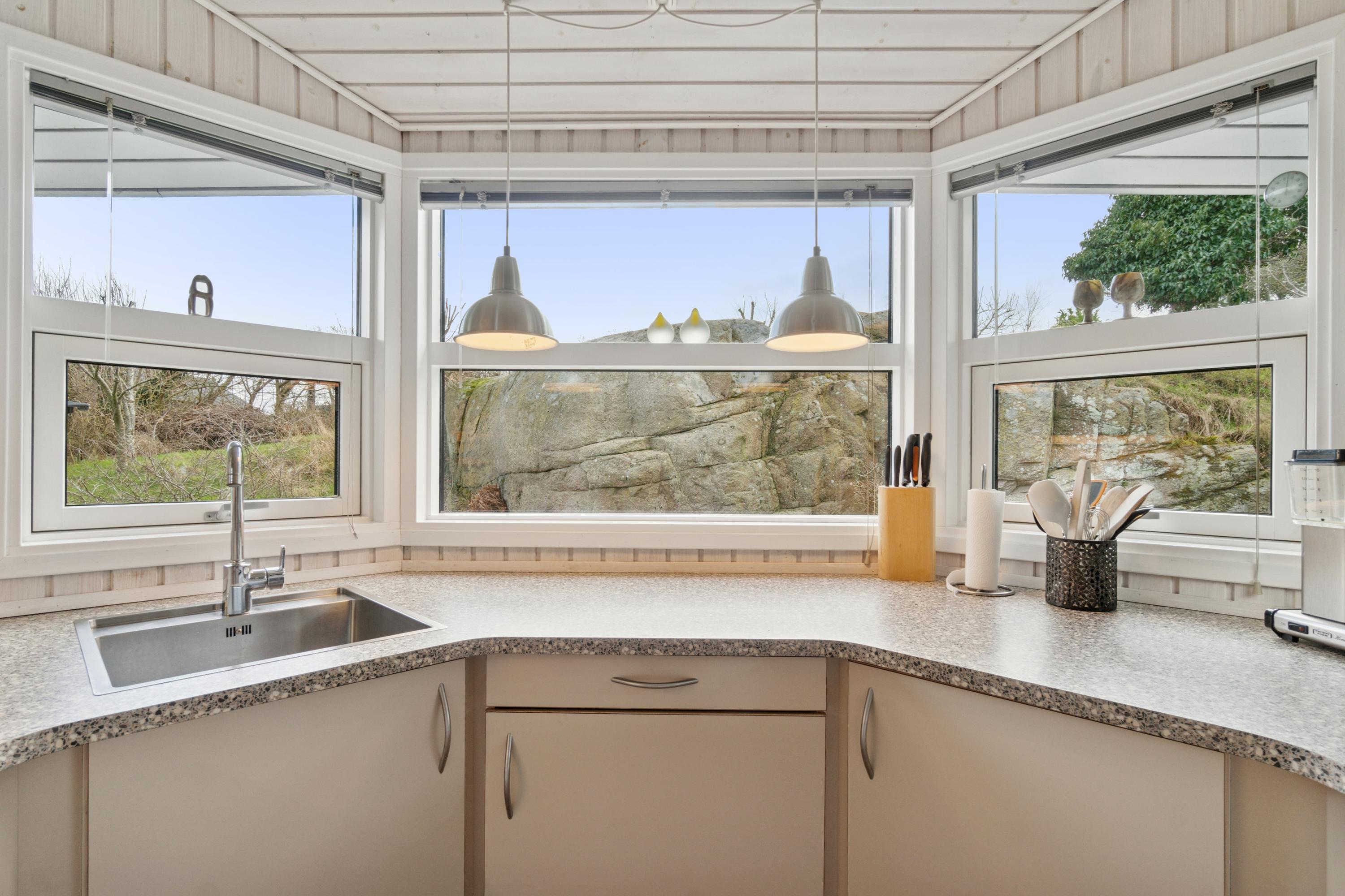 Højt beliggende fritidshus på kuperet grund i naturskønt område, hvor der er havudsigt fra grunden.