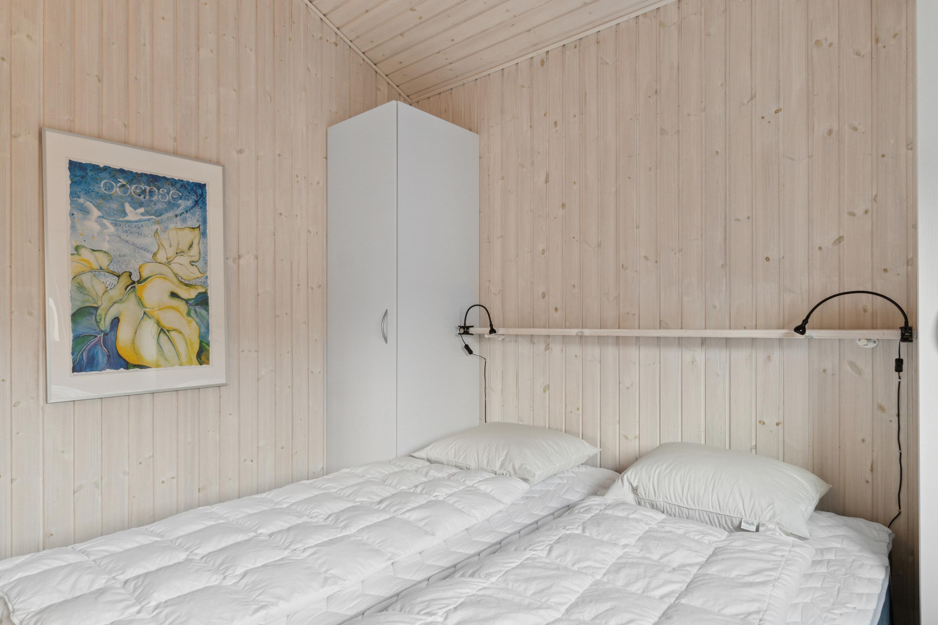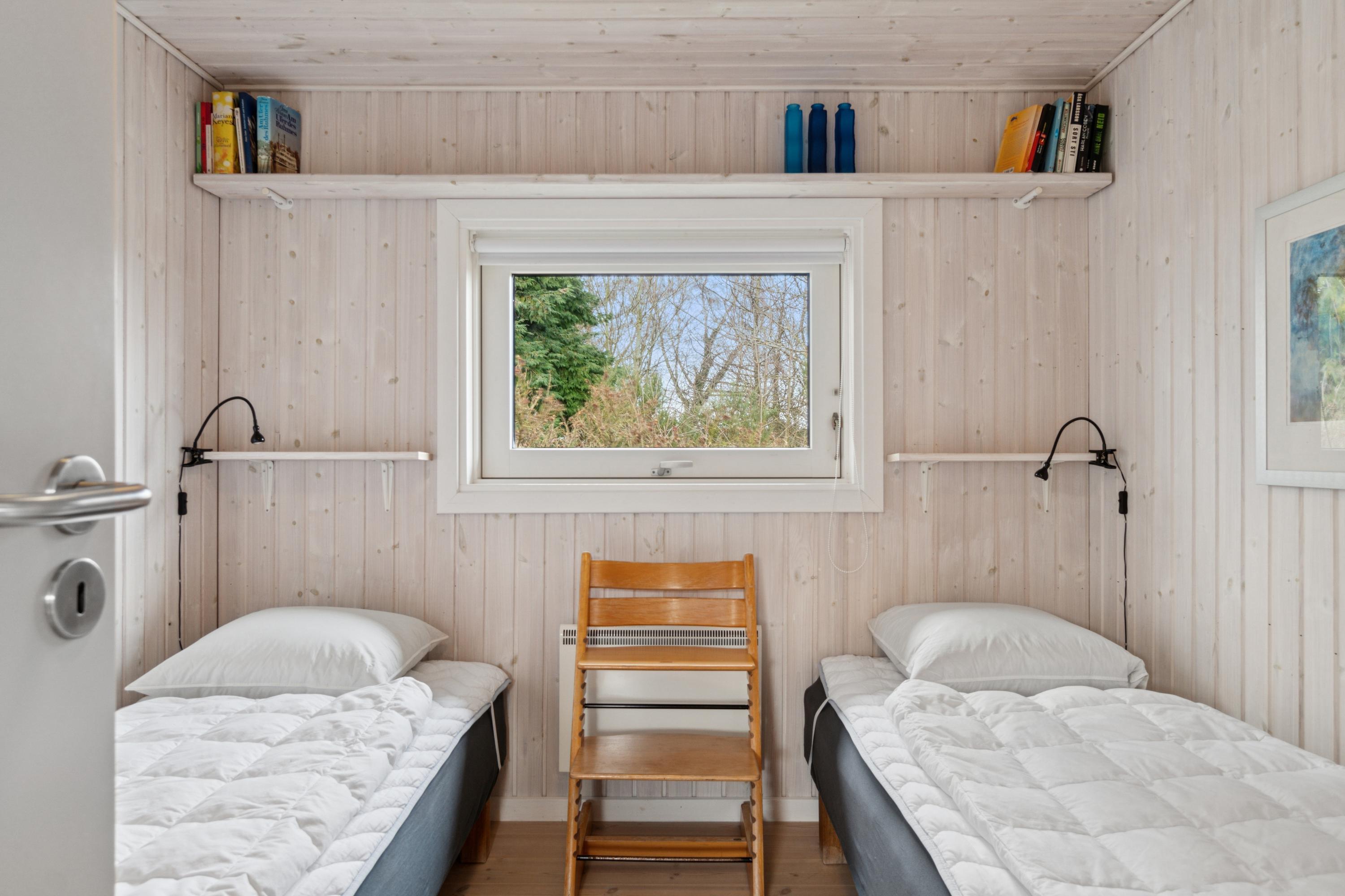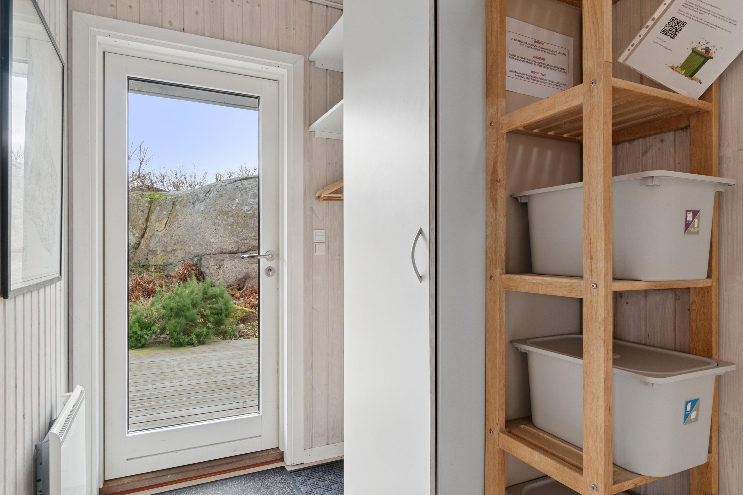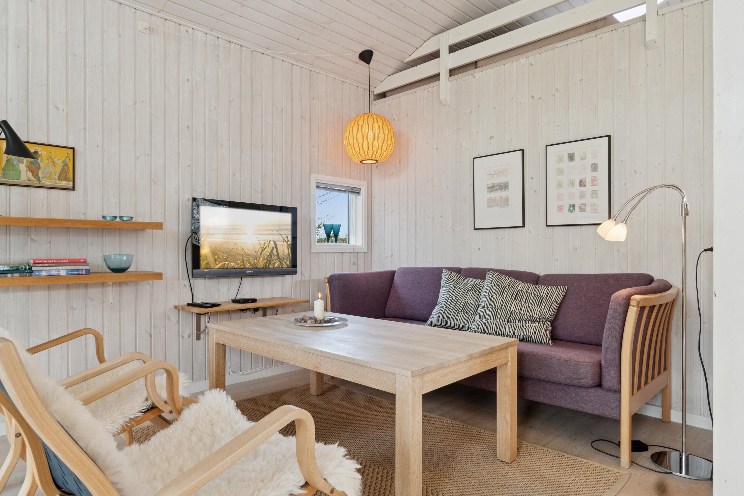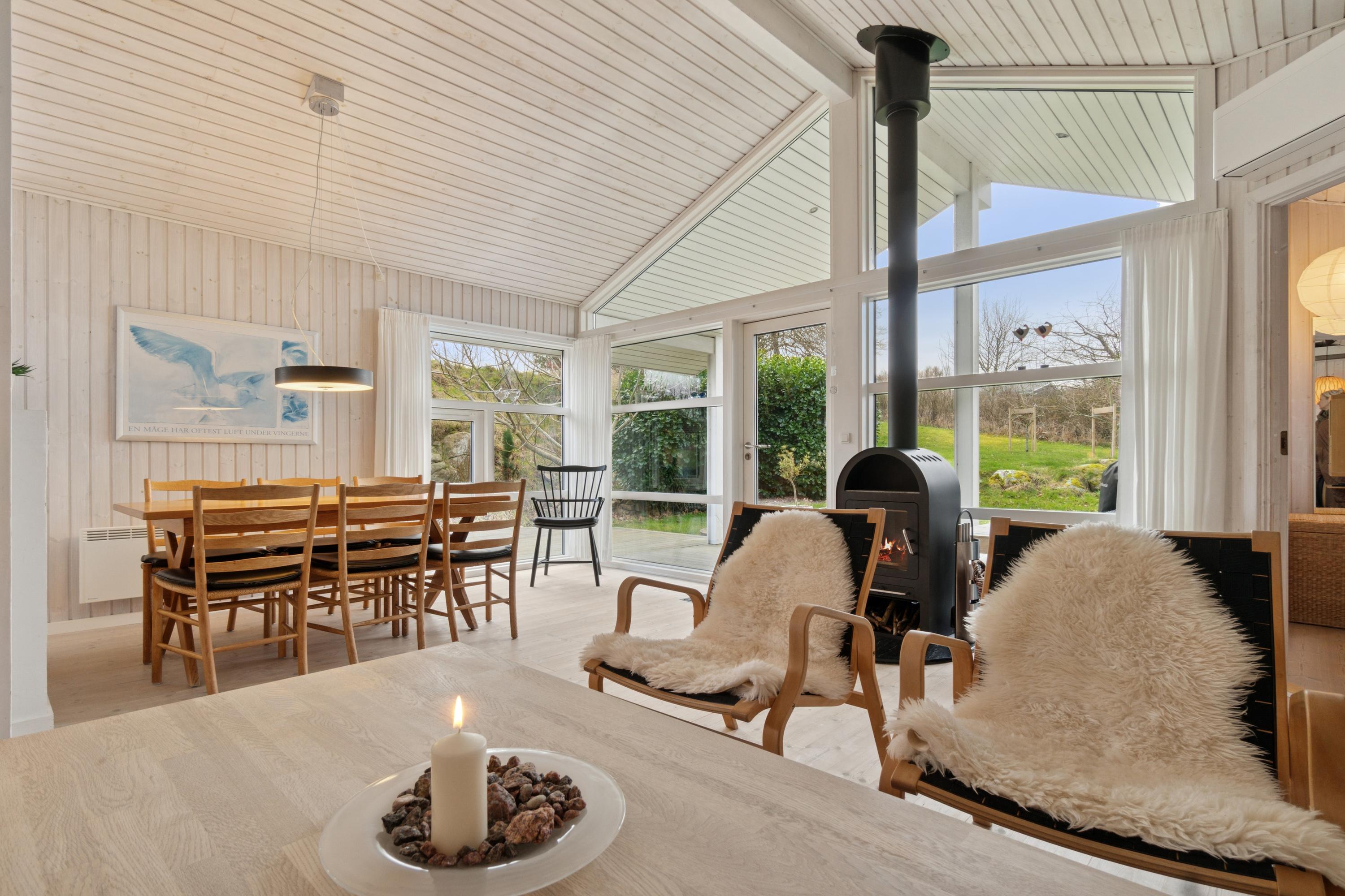 Højt beliggende fritidshus på kuperet grund i naturskønt område, hvor der er havudsigt fra grunden.