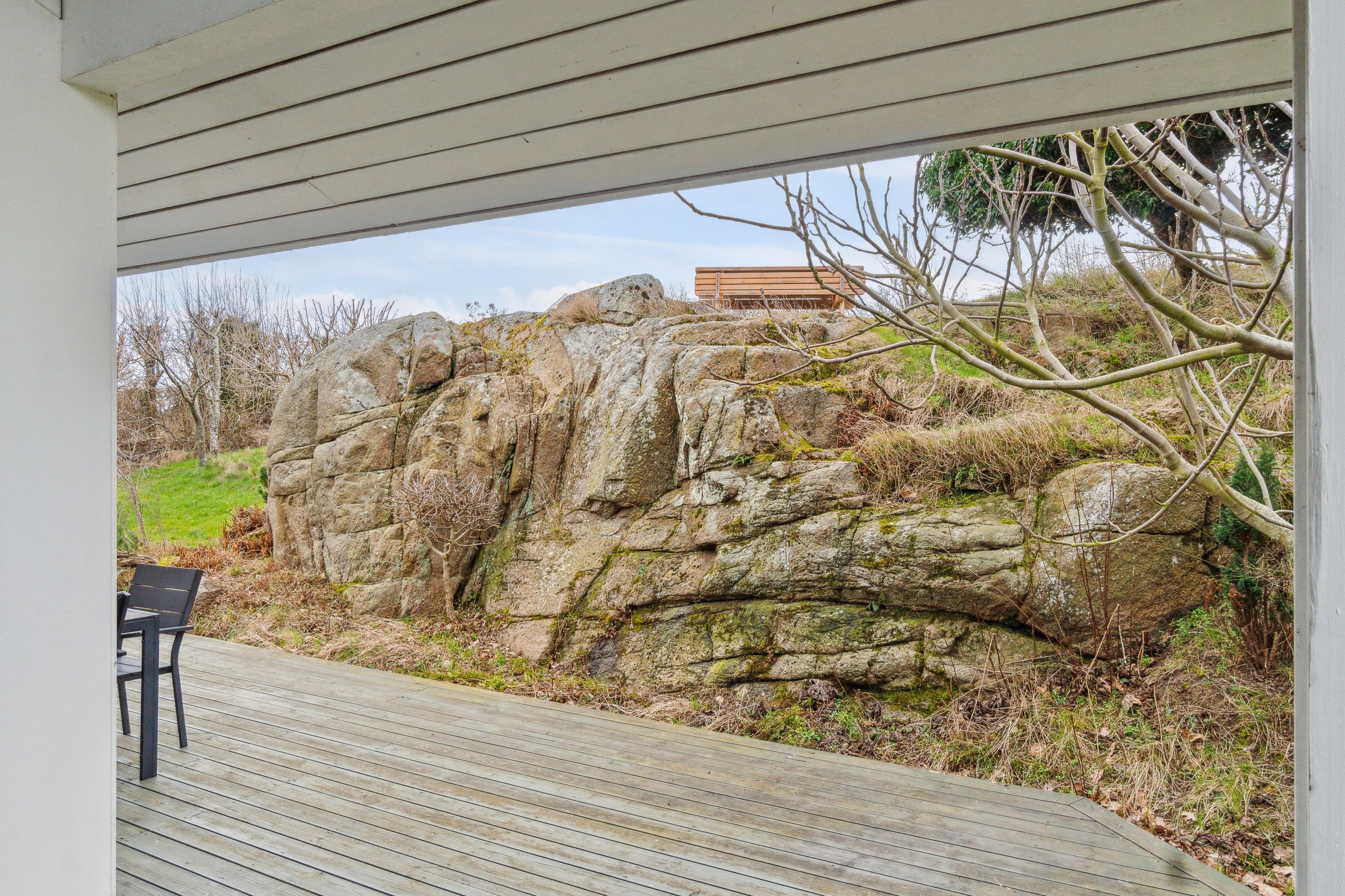 Godt beplantet grund, hvor klipperne er med til at forme landskabet.