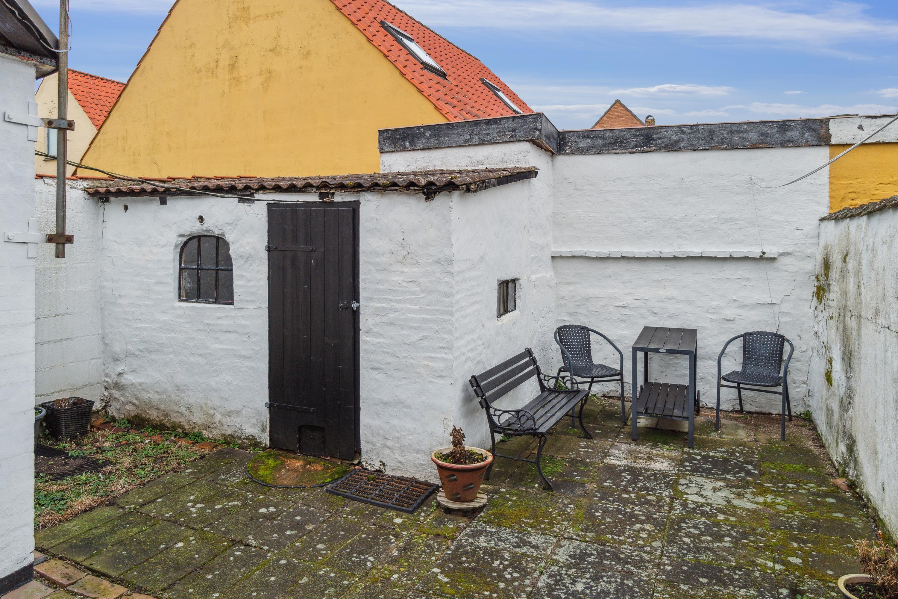 Skøn lukket gårdhave, hvor solen kan nydes og krydderurter dyrkes i krukker eller plantekasse.