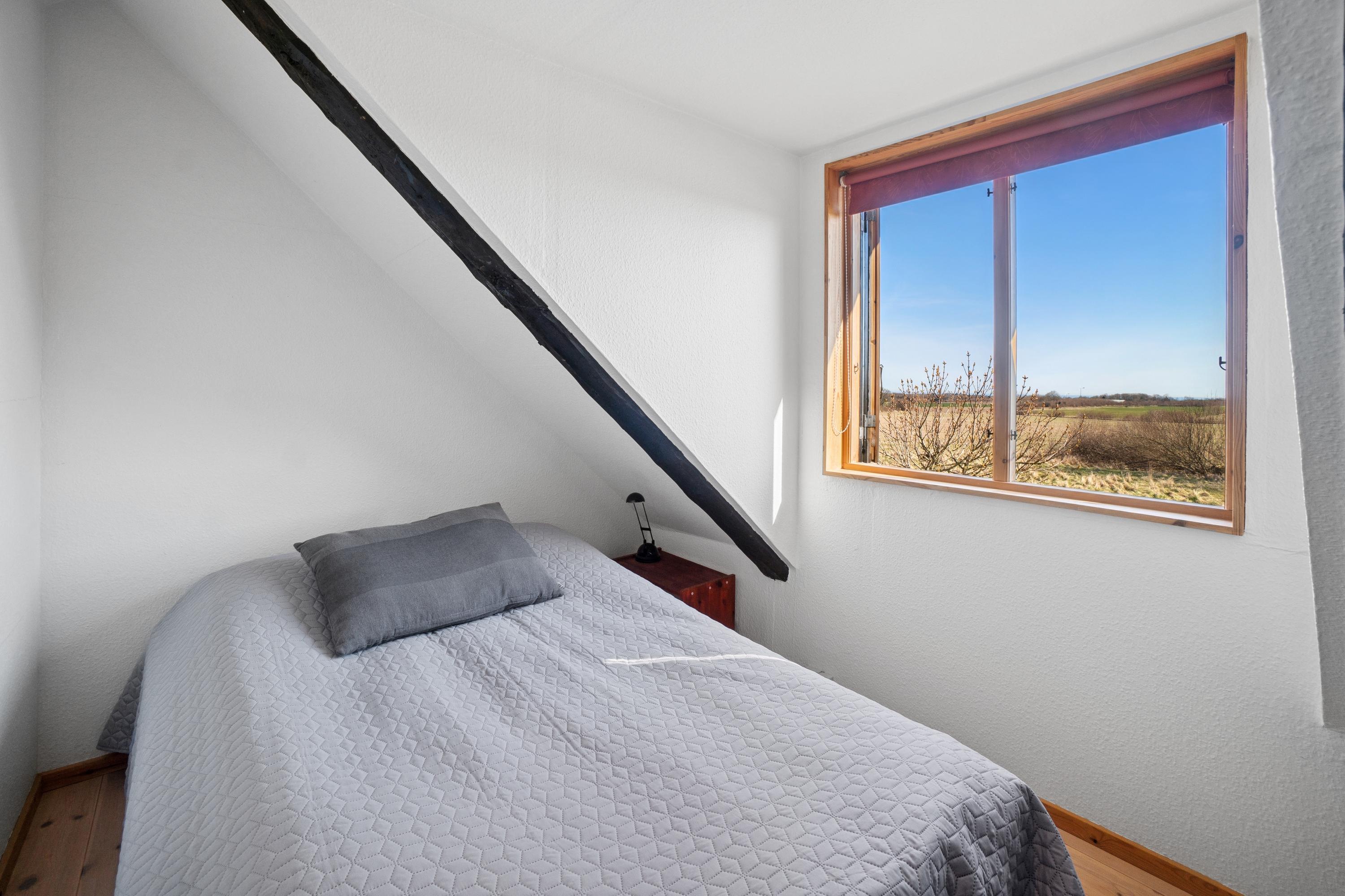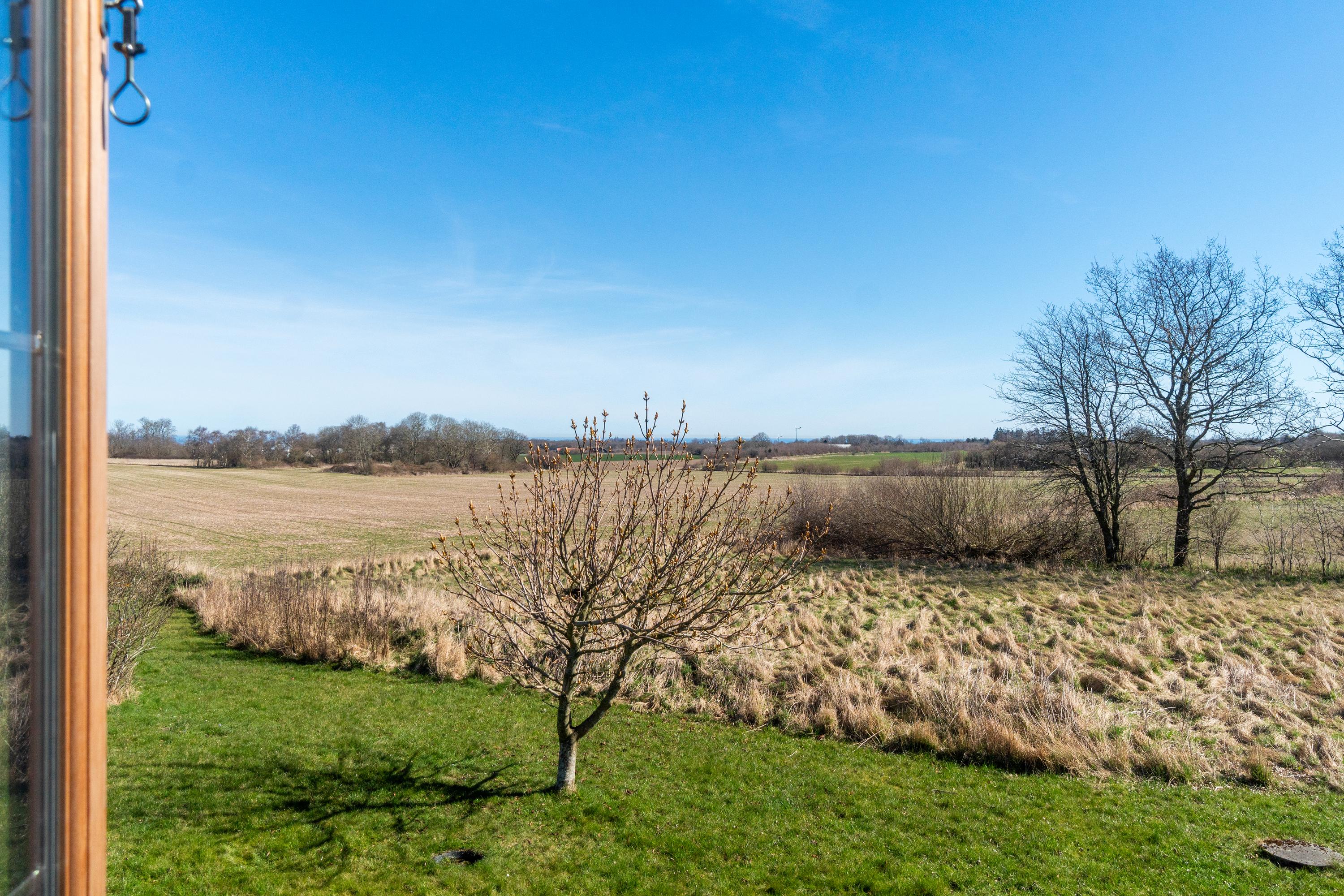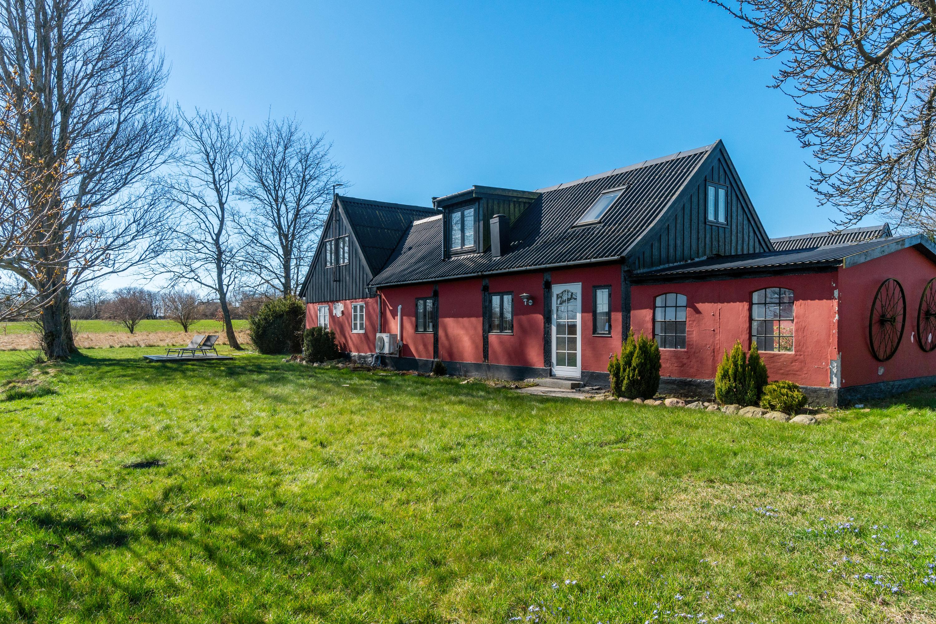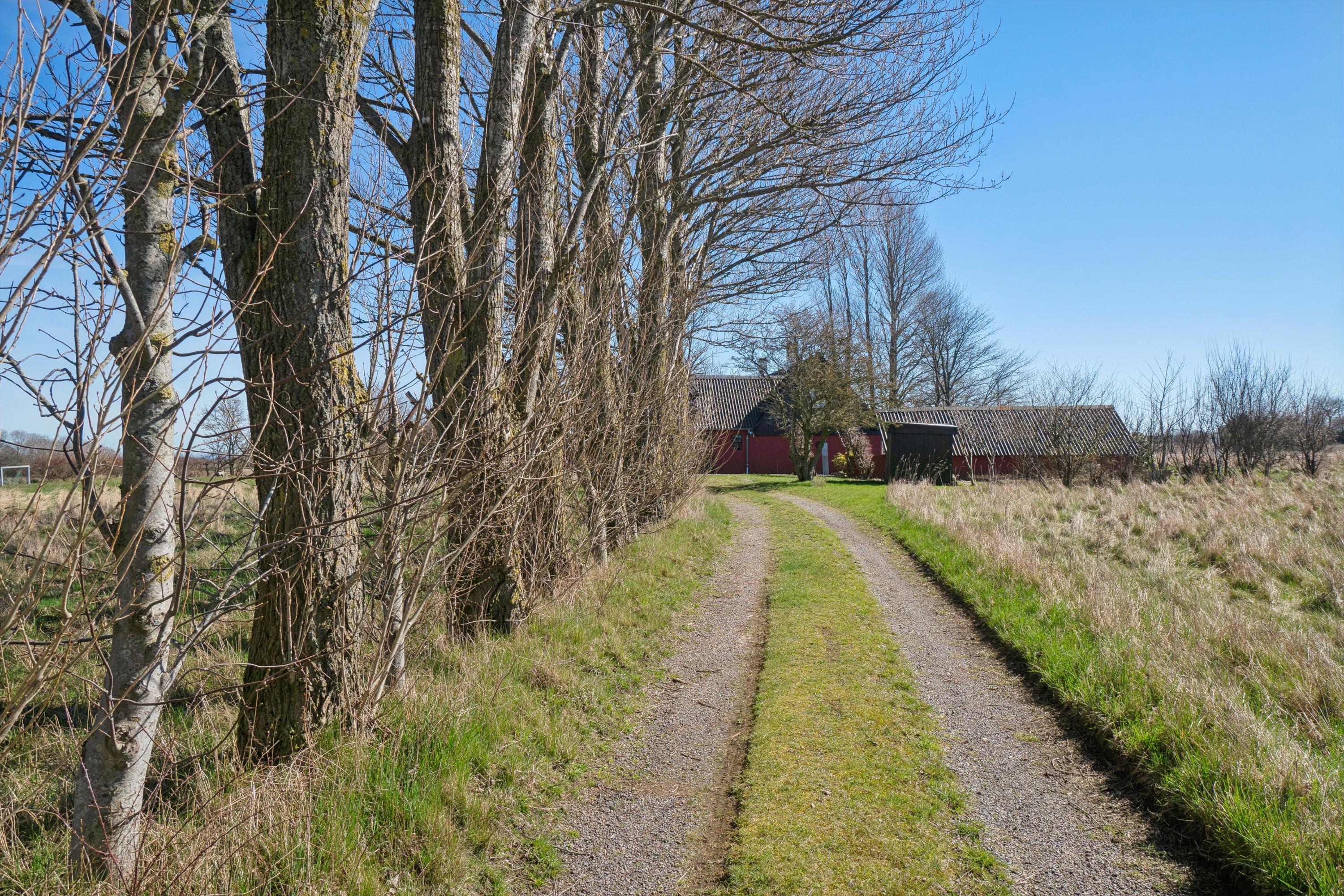 Huset ligger tilbagetrukket fra vejen i naturskønt område.