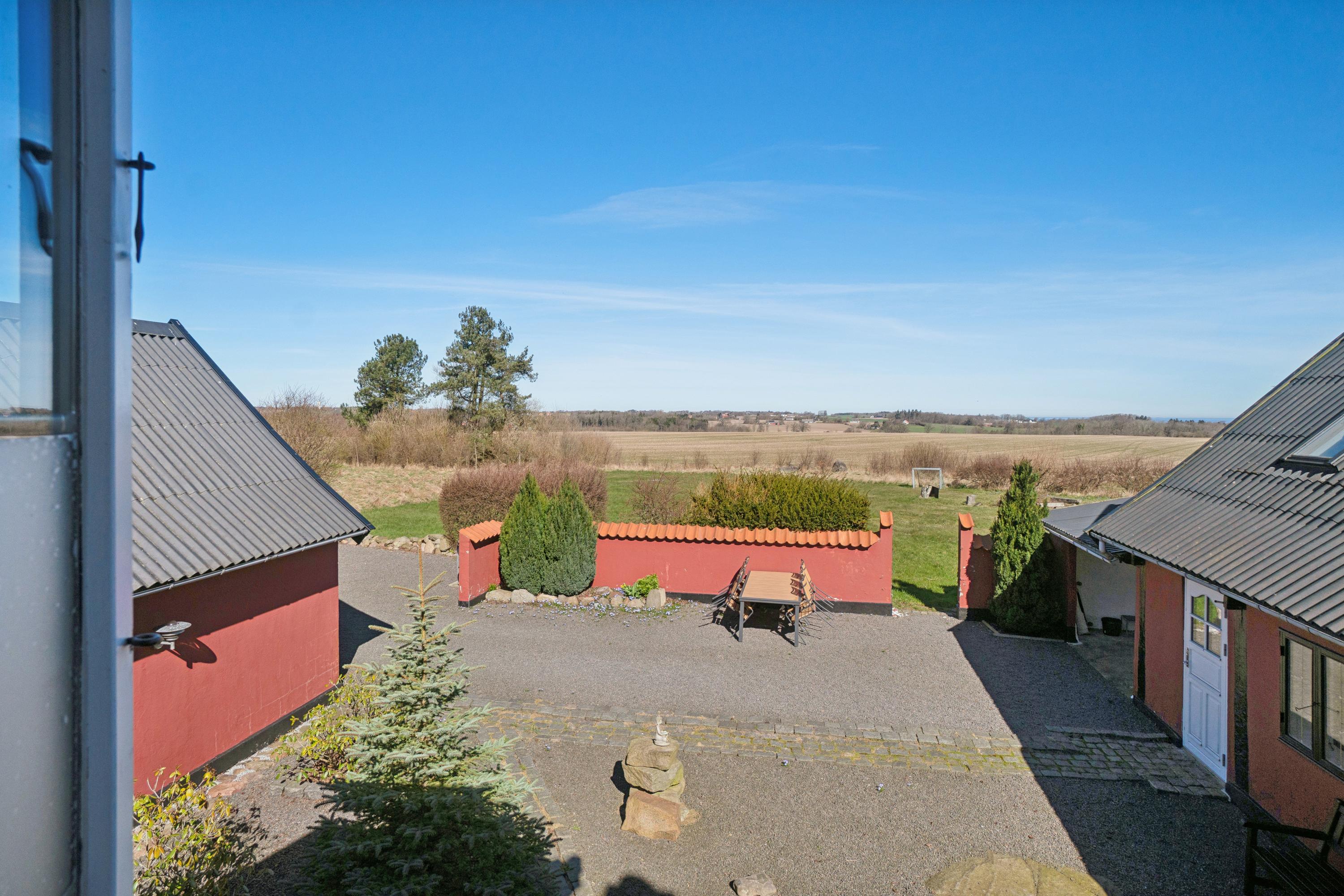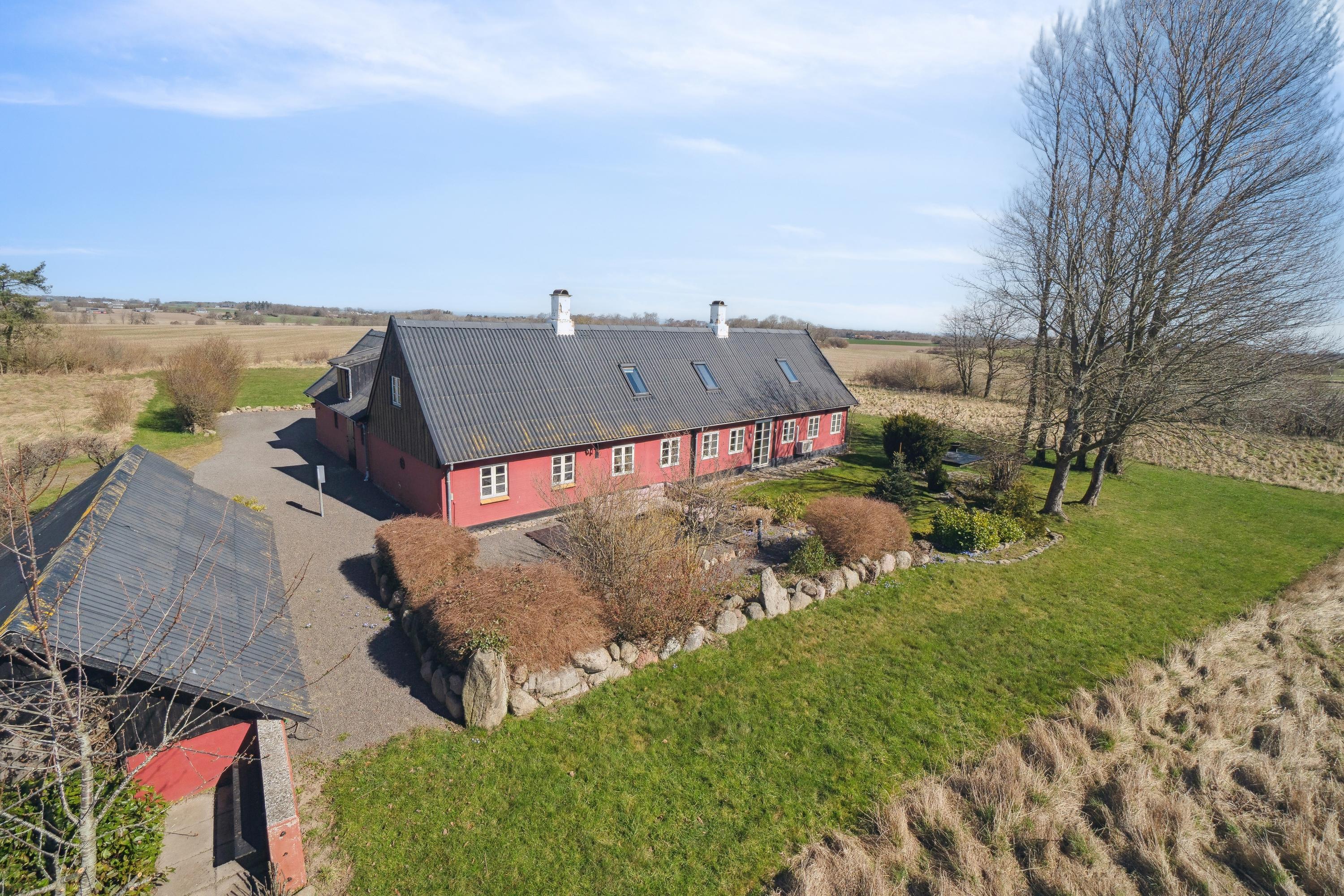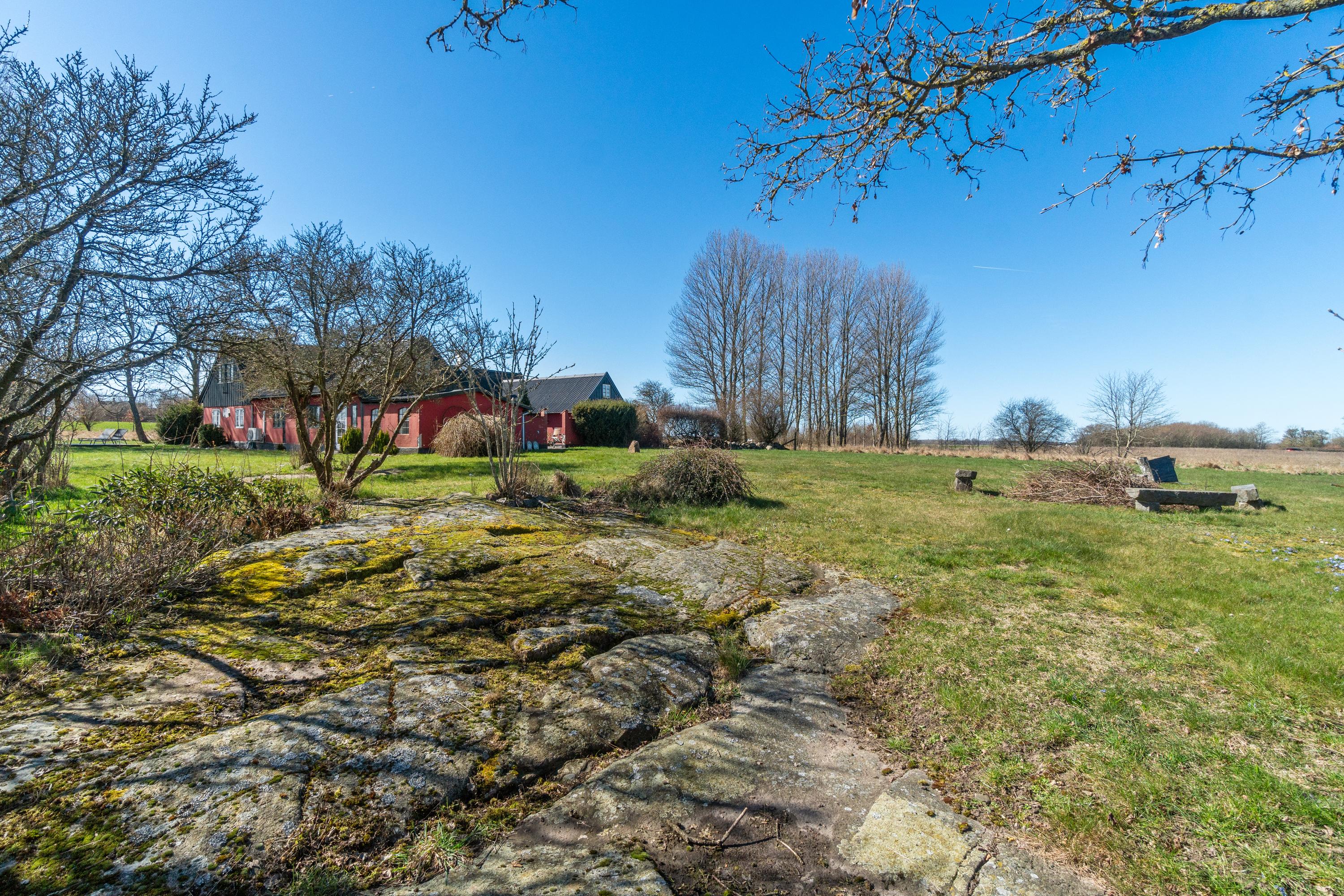 Tre-længet ejendom med læmur ud mod marken, som danner en skøn solrig gårdsplads.