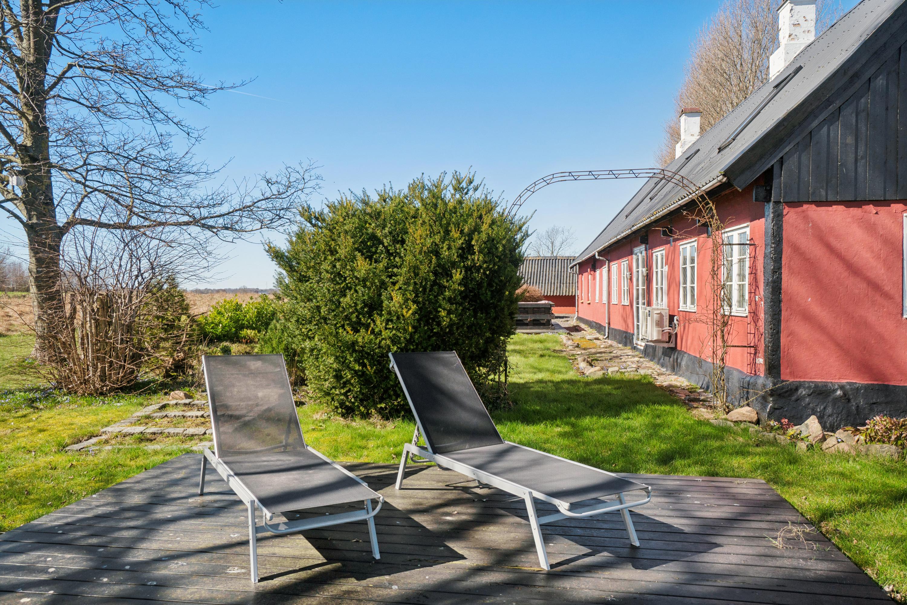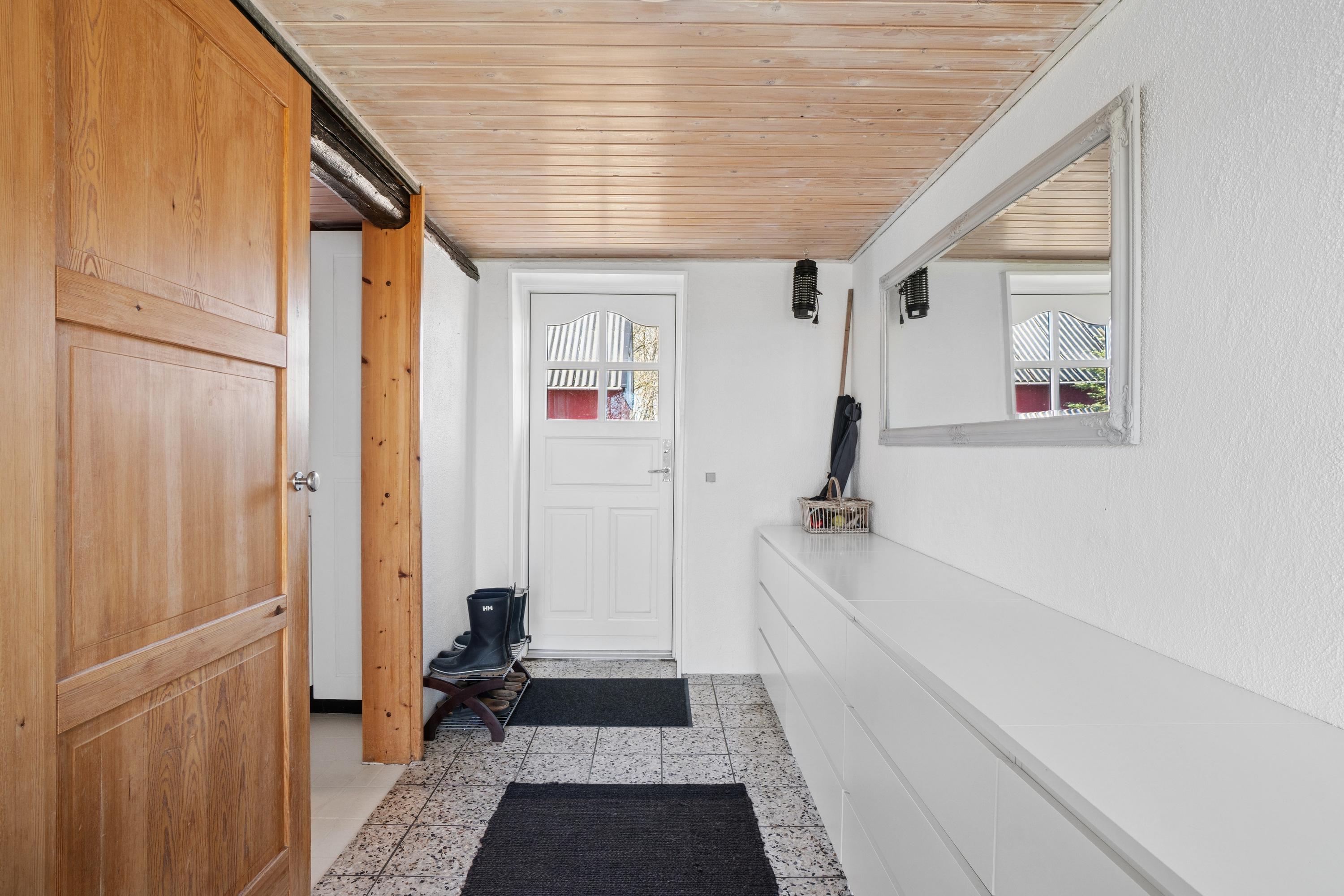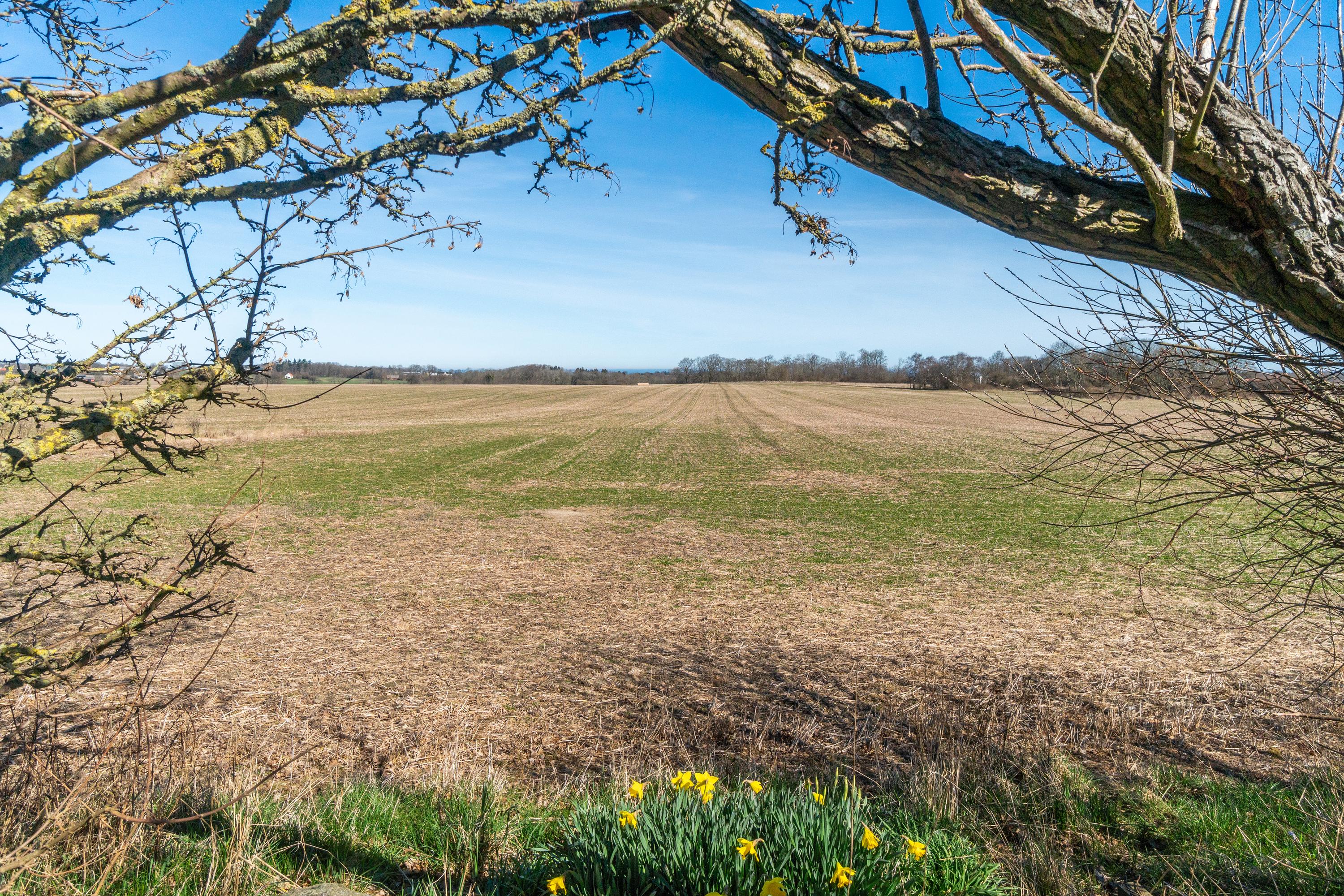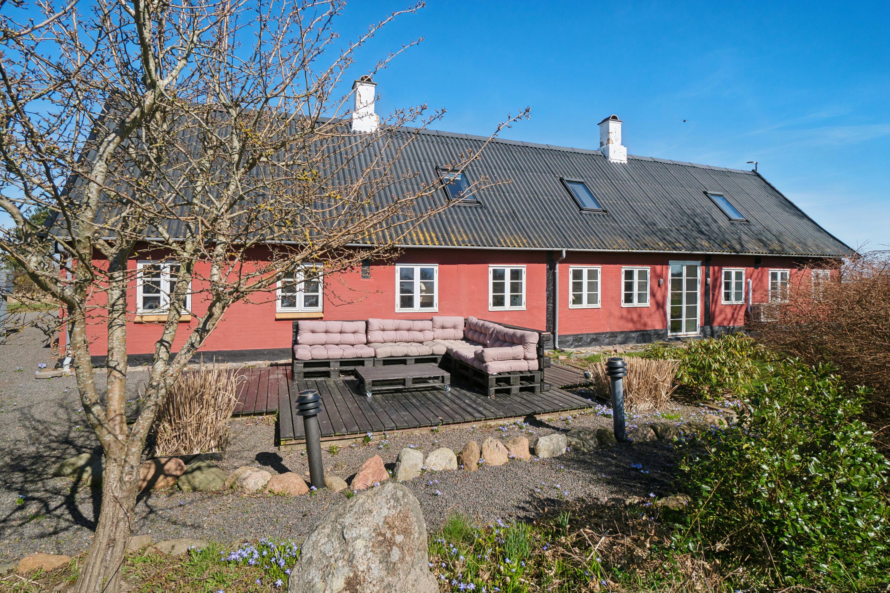 Tre-længet ejendom med læmur ud mod marken, som danner en skøn solrig gårdsplads.