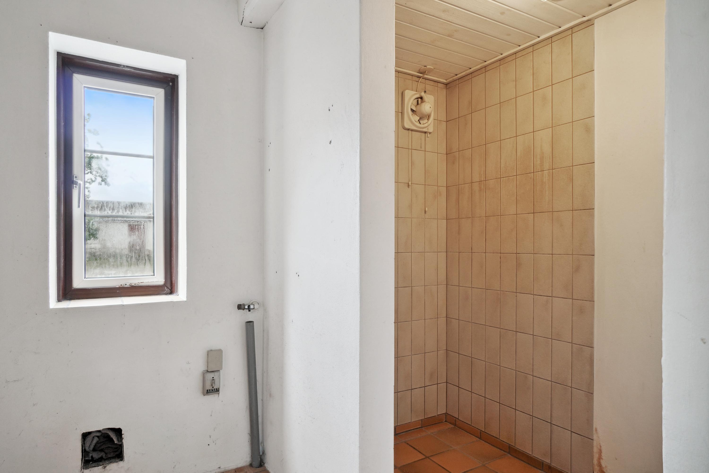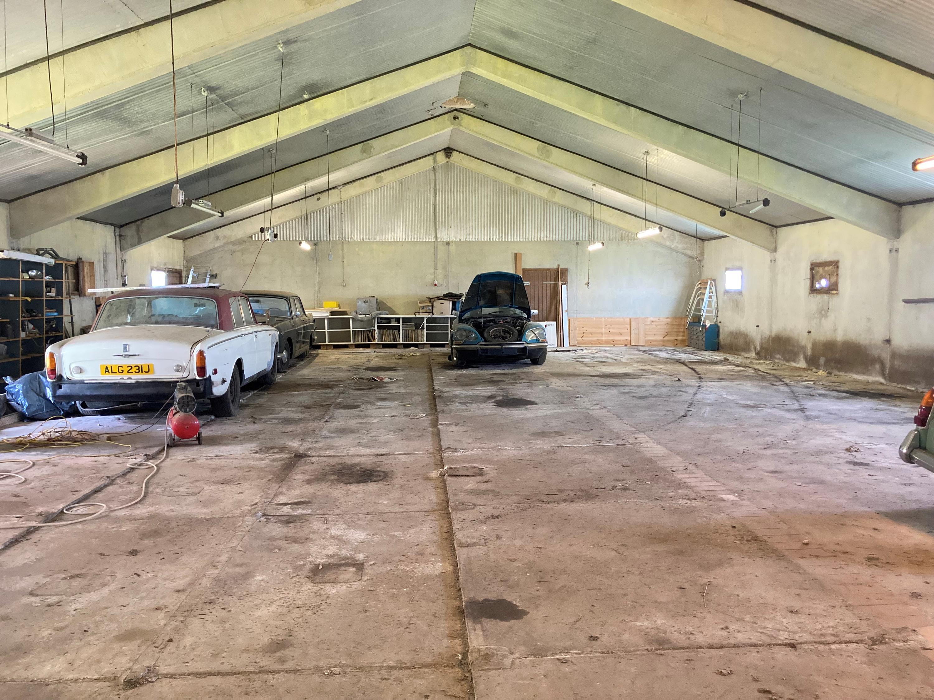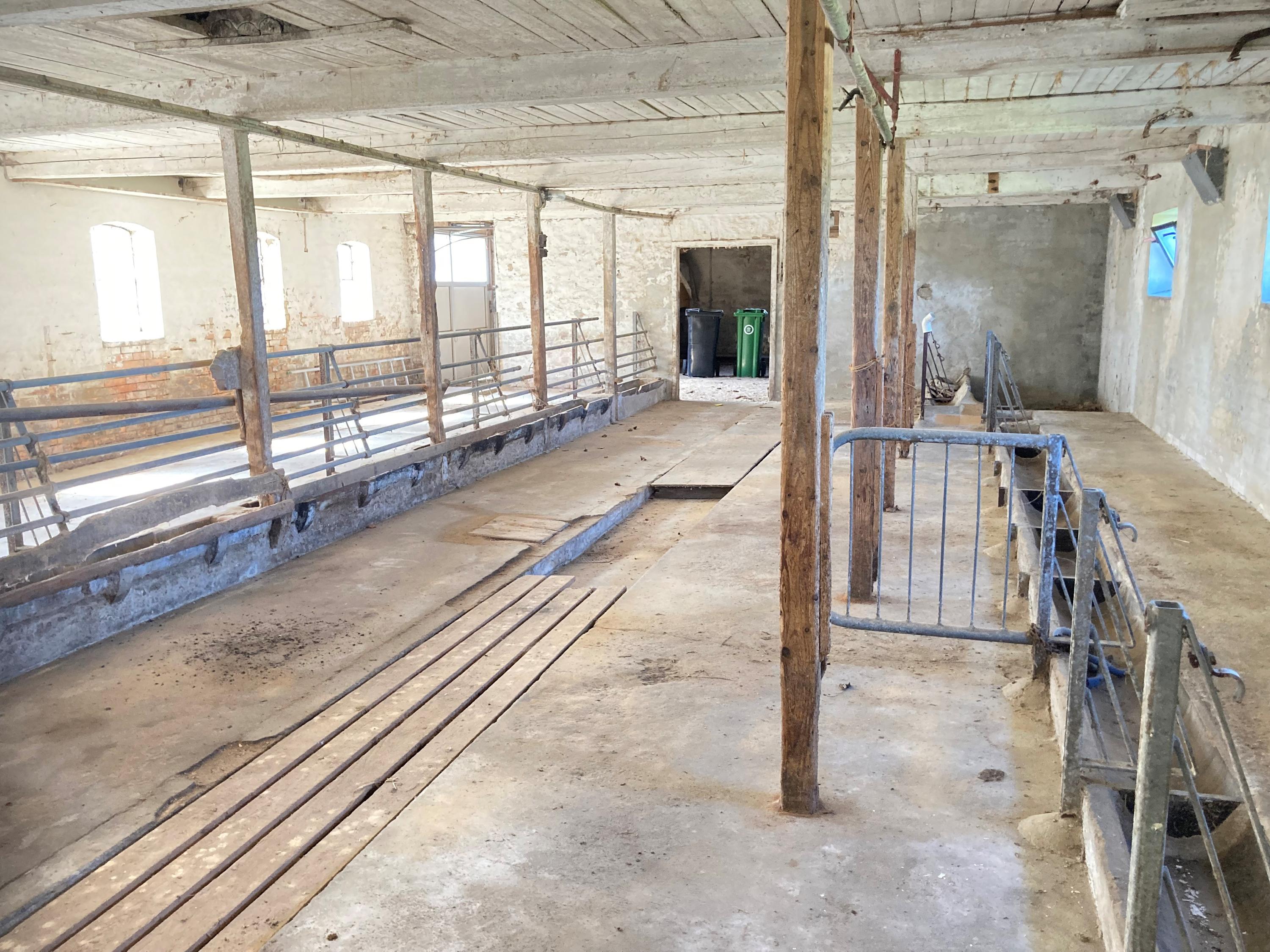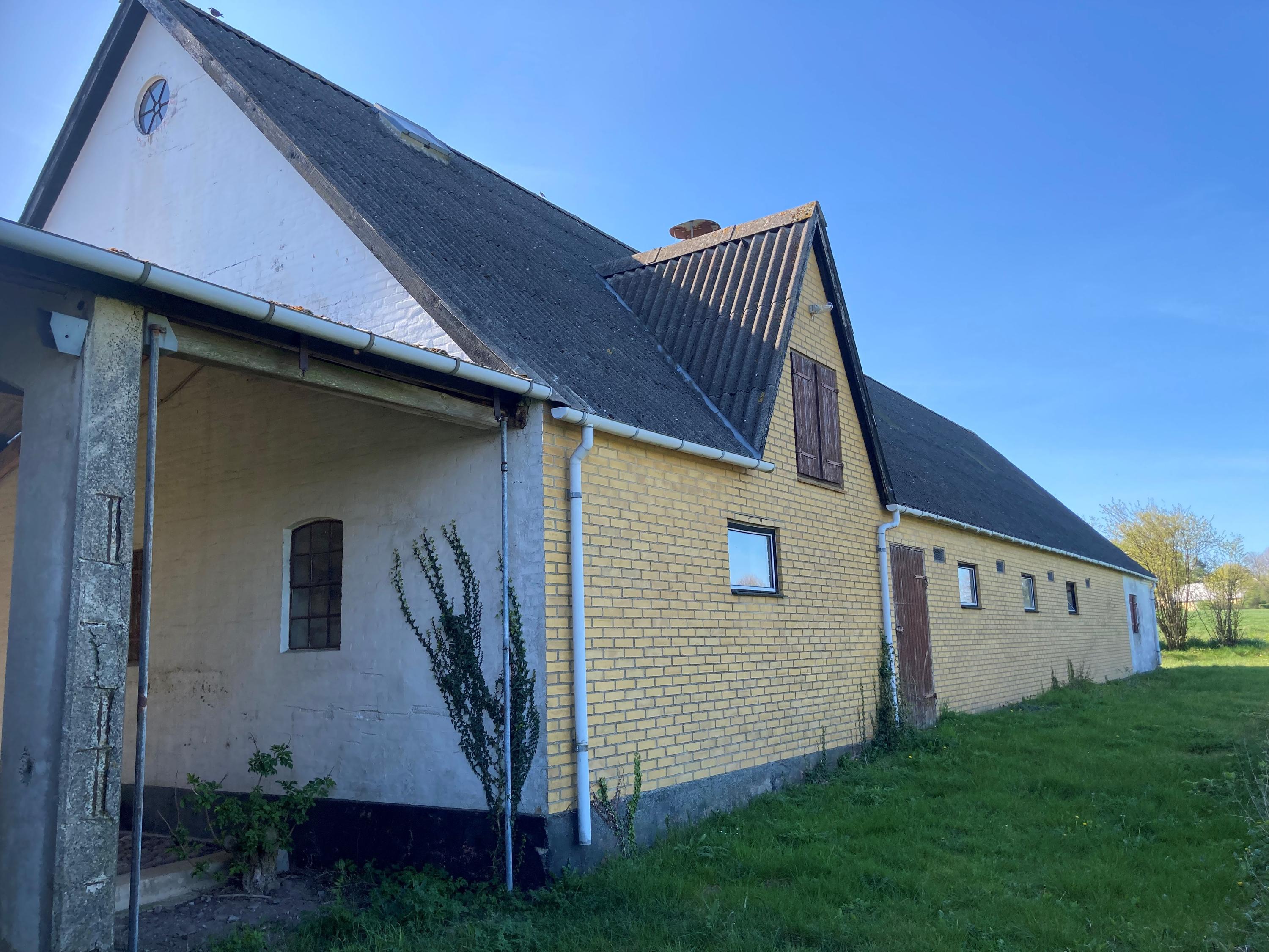 Maskinlænge på 364 kvm med højt til loftet og støbt gulv, samt staldbygning og garage.