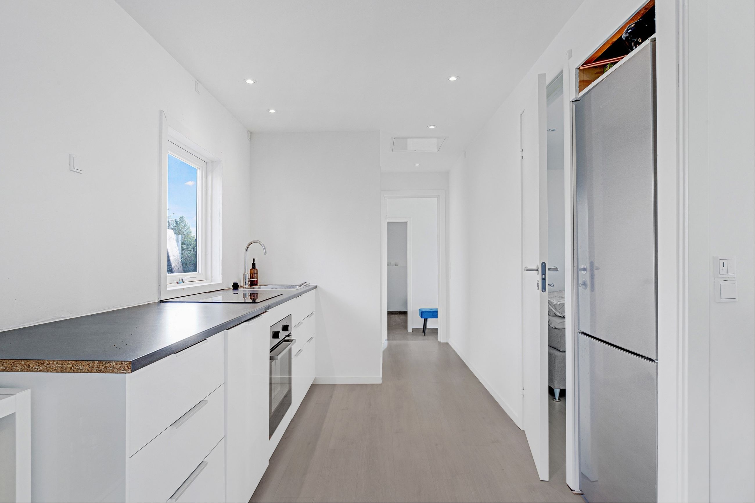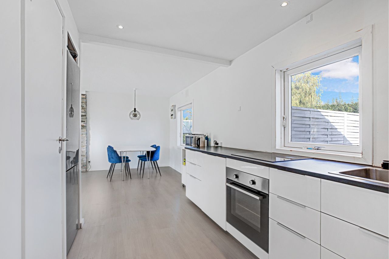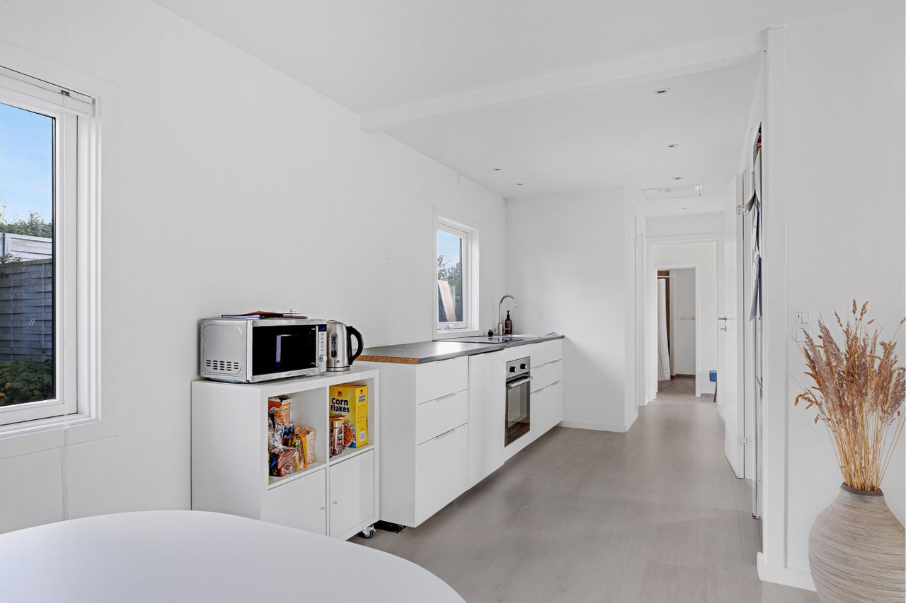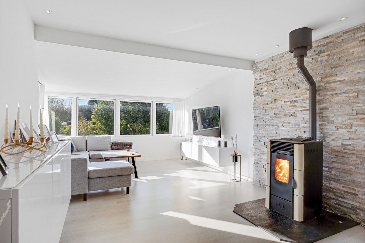 Flot hvidt elementkøkken i åben forbindelse til opholdsstuen med pilleovn, dejligt soveværelse