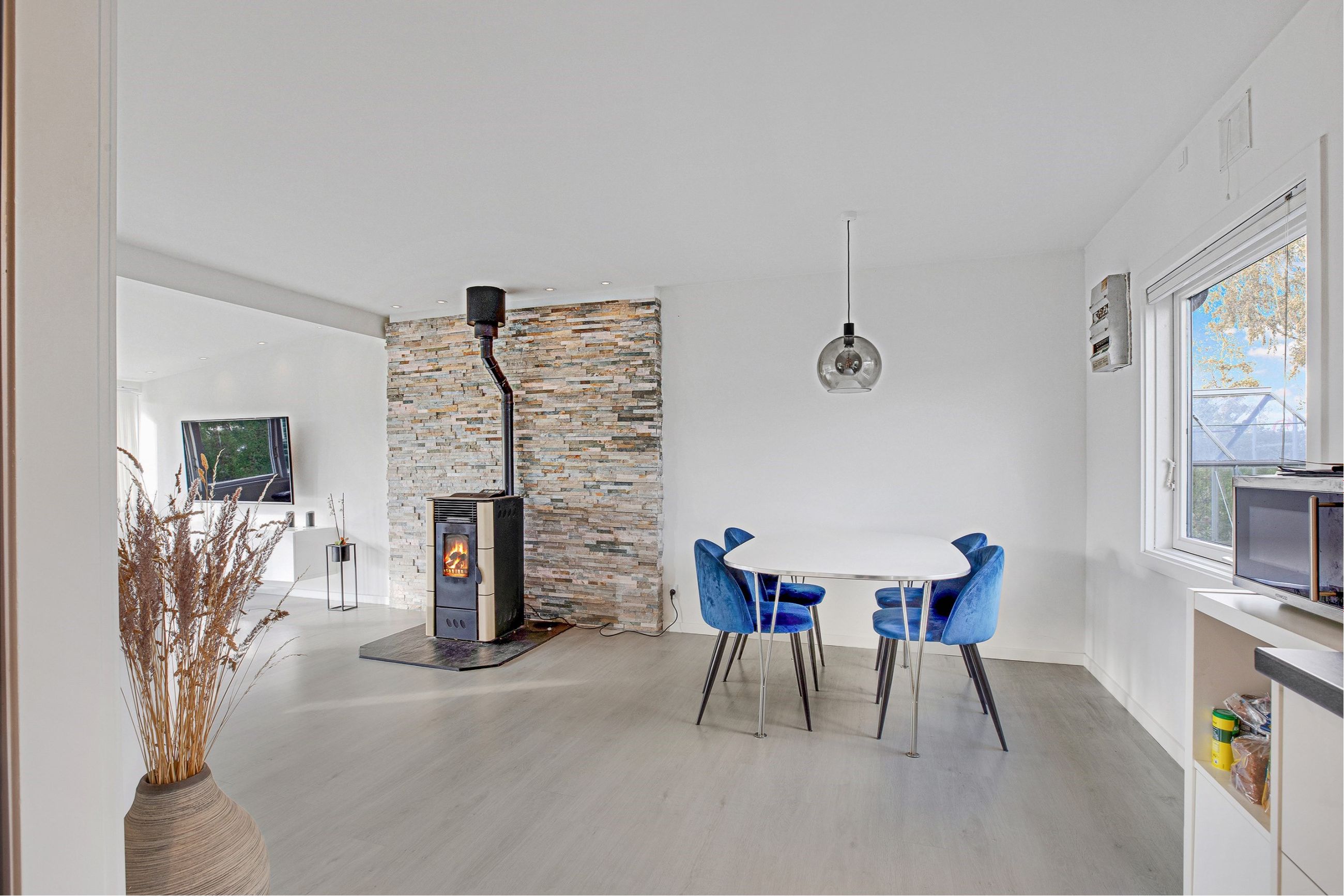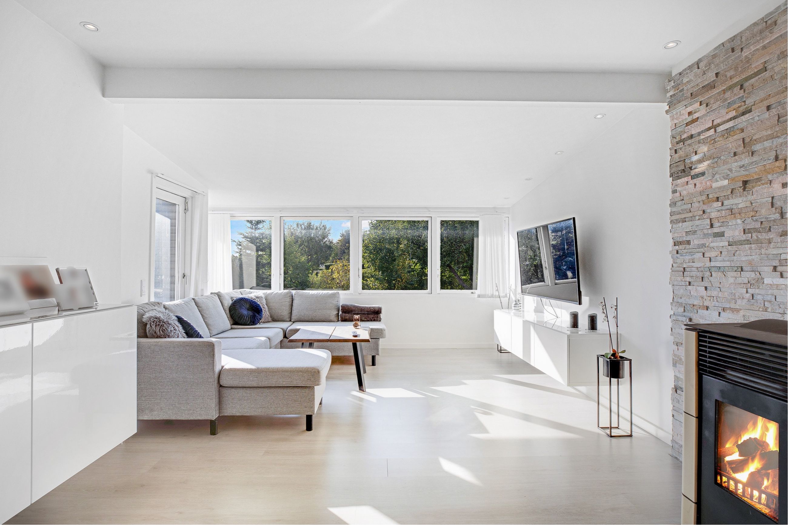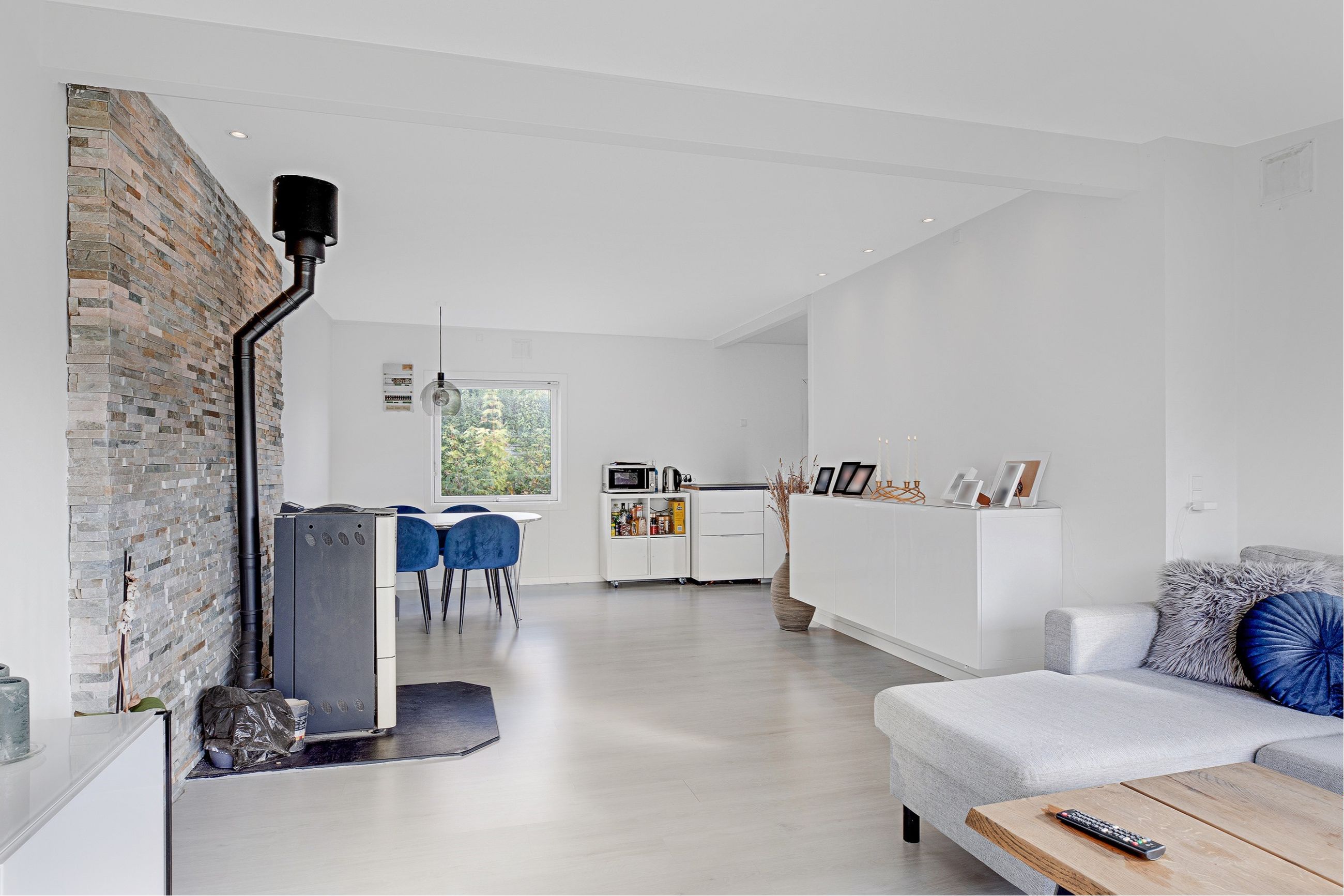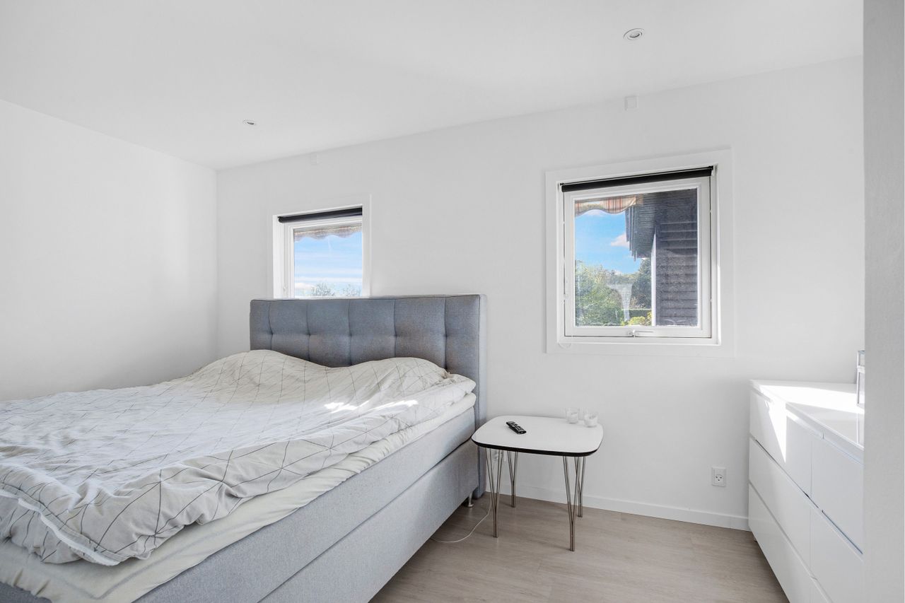 Flot hvidt elementkøkken i åben forbindelse til opholdsstuen med pilleovn, dejligt soveværelse