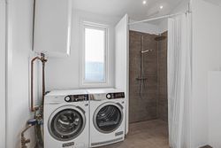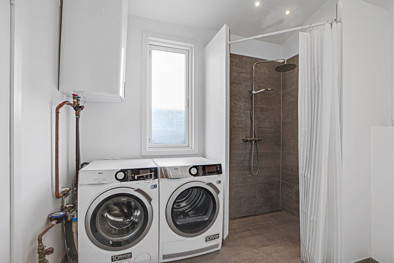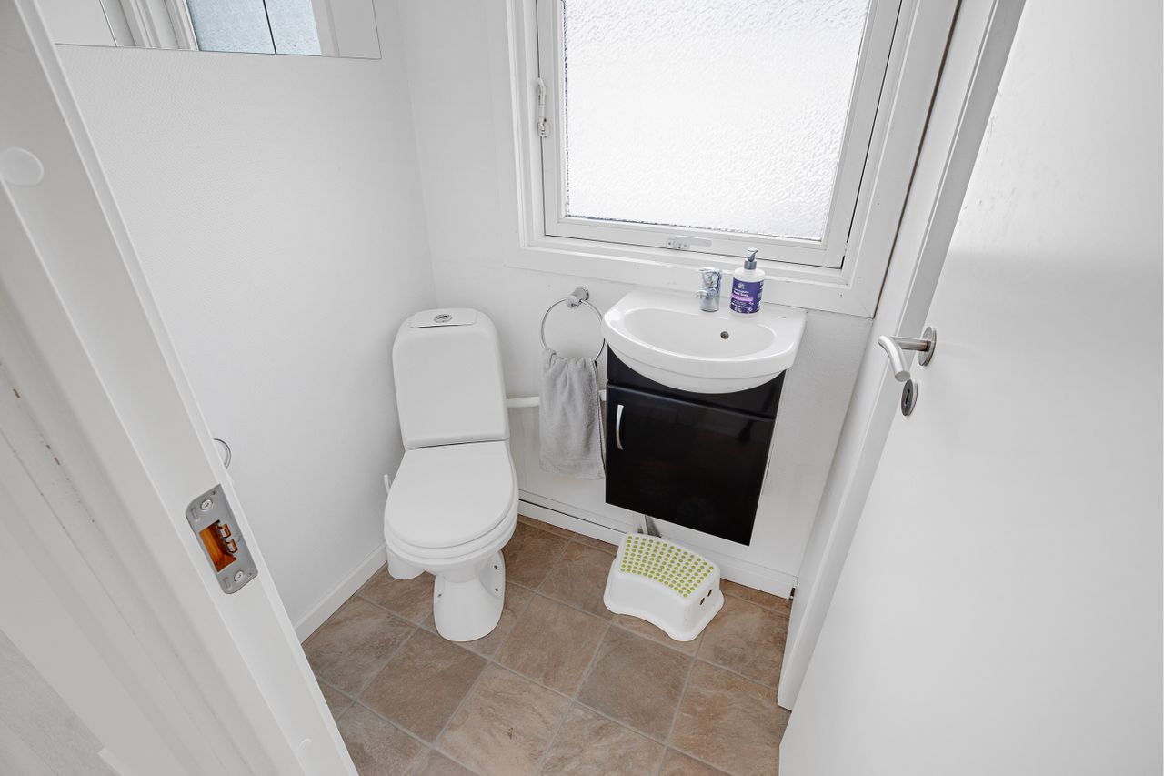 med toilet og bruseniche, gulvvarme, istandsat udhus/opbevaringsrum.