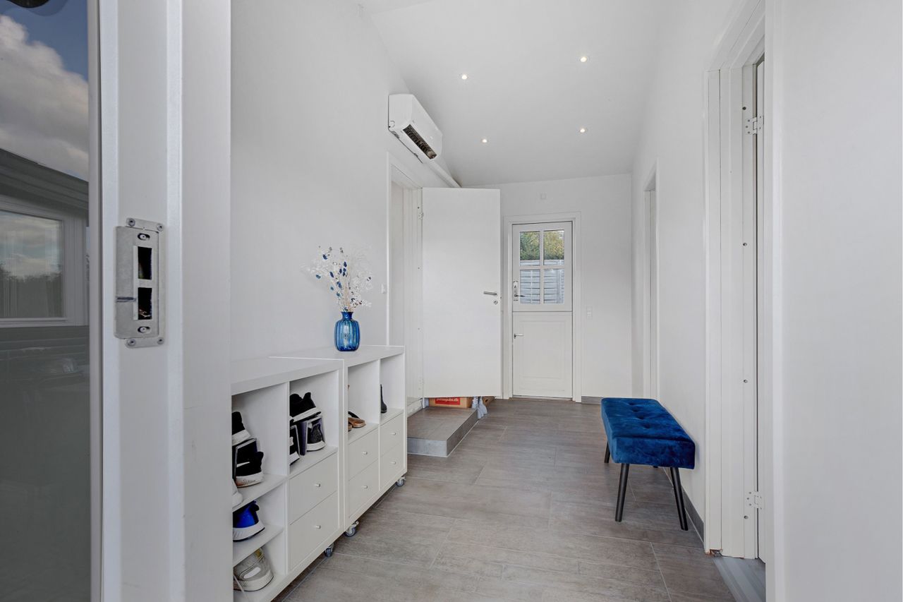 Øvrige bygninger: Stor flot istandsat indgangsparti med klinkegulve, lækkert nyt og moderne bryggers