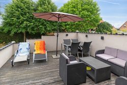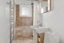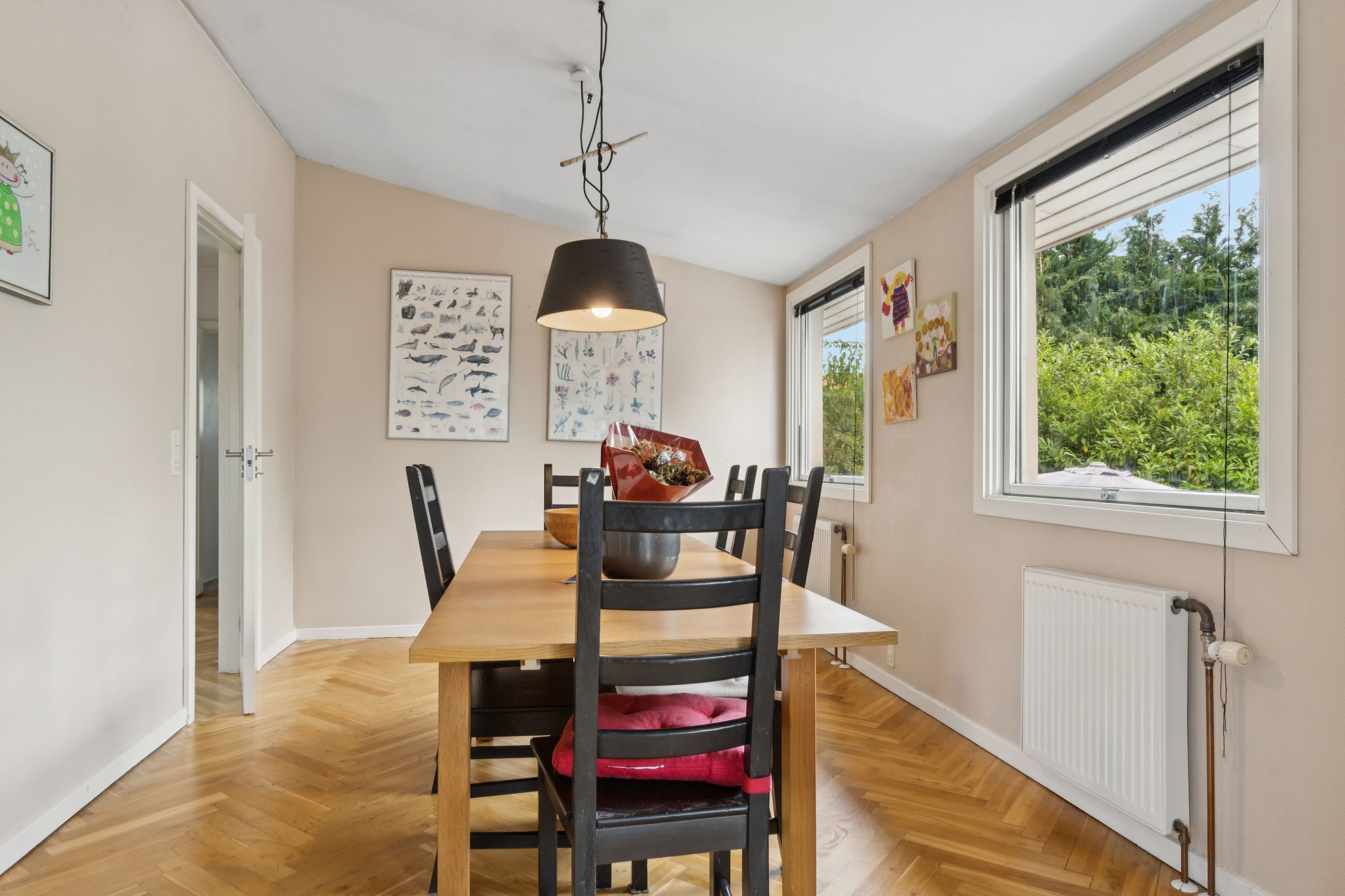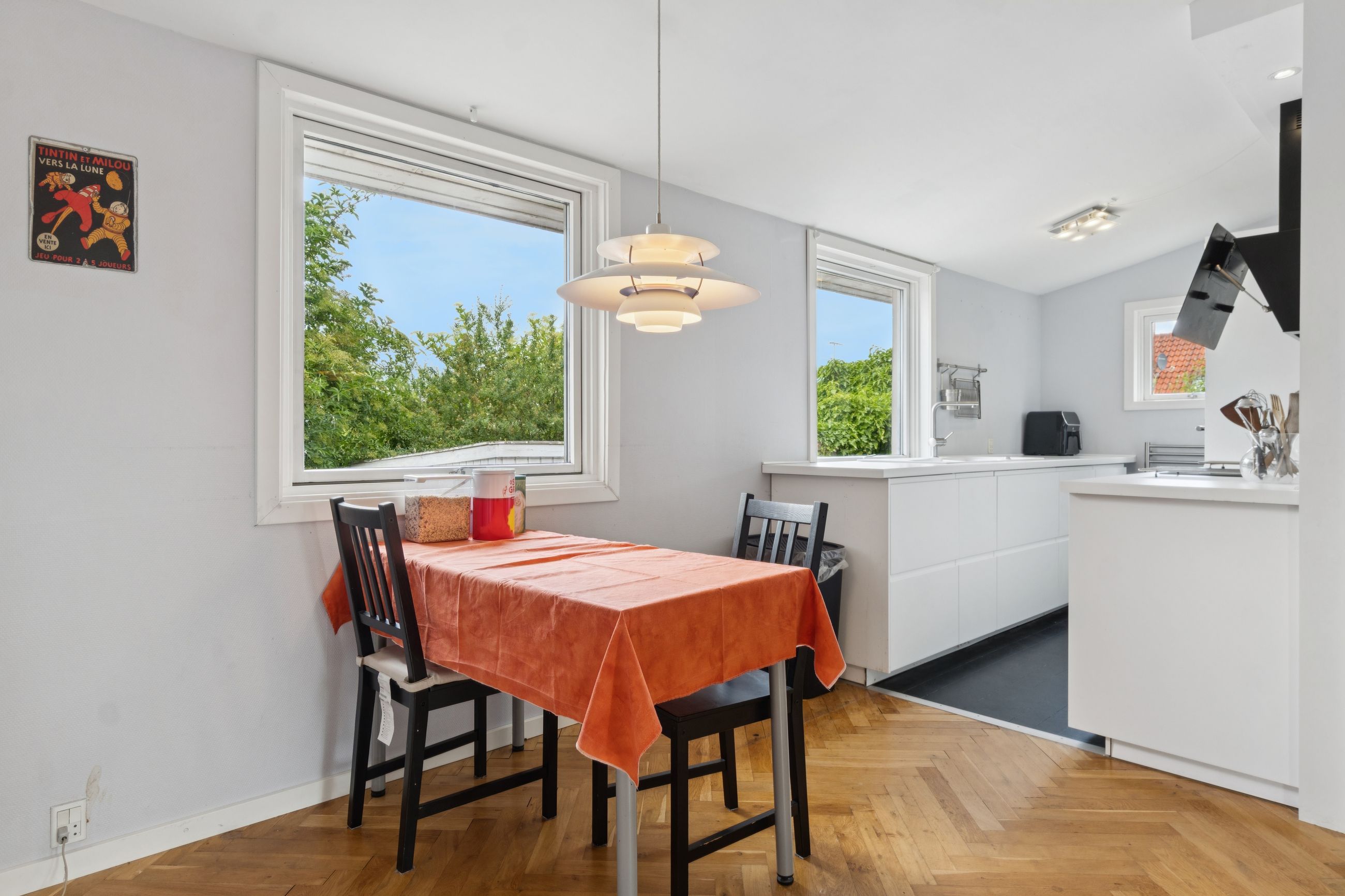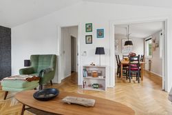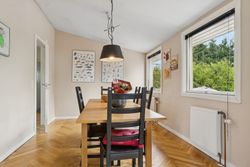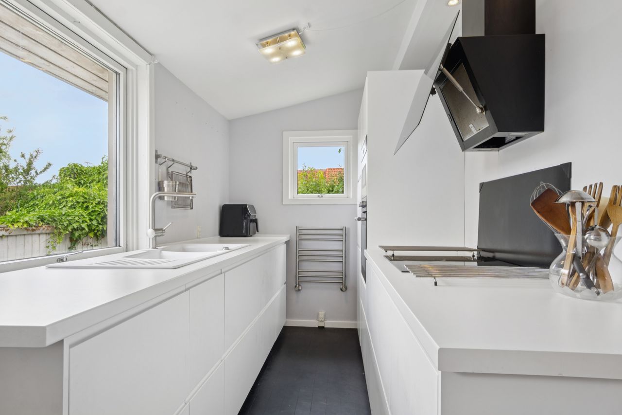 Huset er indrettet med to badeværelser, hvilket gør hverdagen nemmere for både børn og voksne. Køkkenet er funktionelt og ligger i åben forbindelse med stuen, hvor store vinduer lukker masser af dagslys ind og skaber en hyggelig stemning. På førstesalen finder I rummelige værelser med god plads til privatliv og ro.