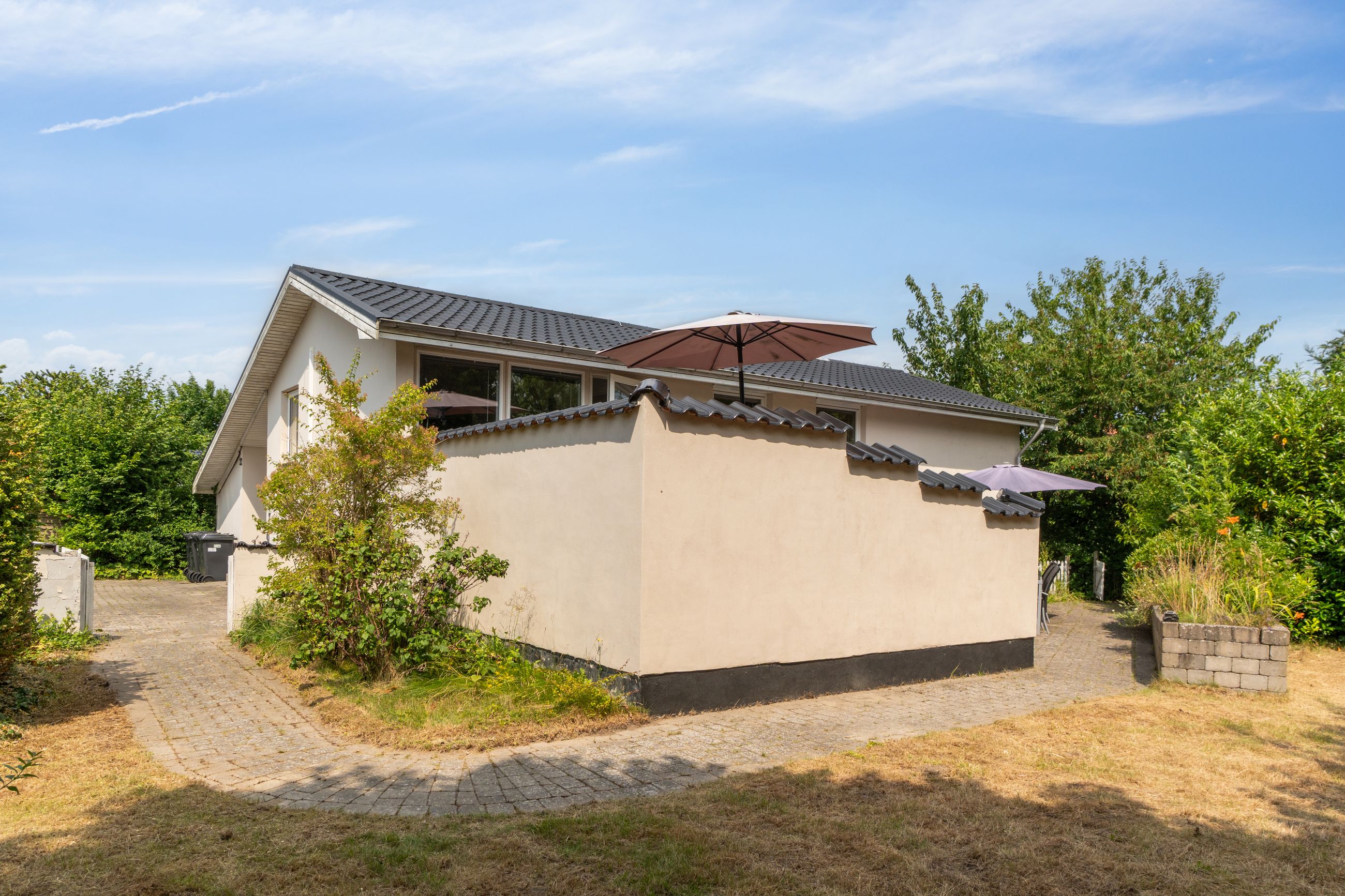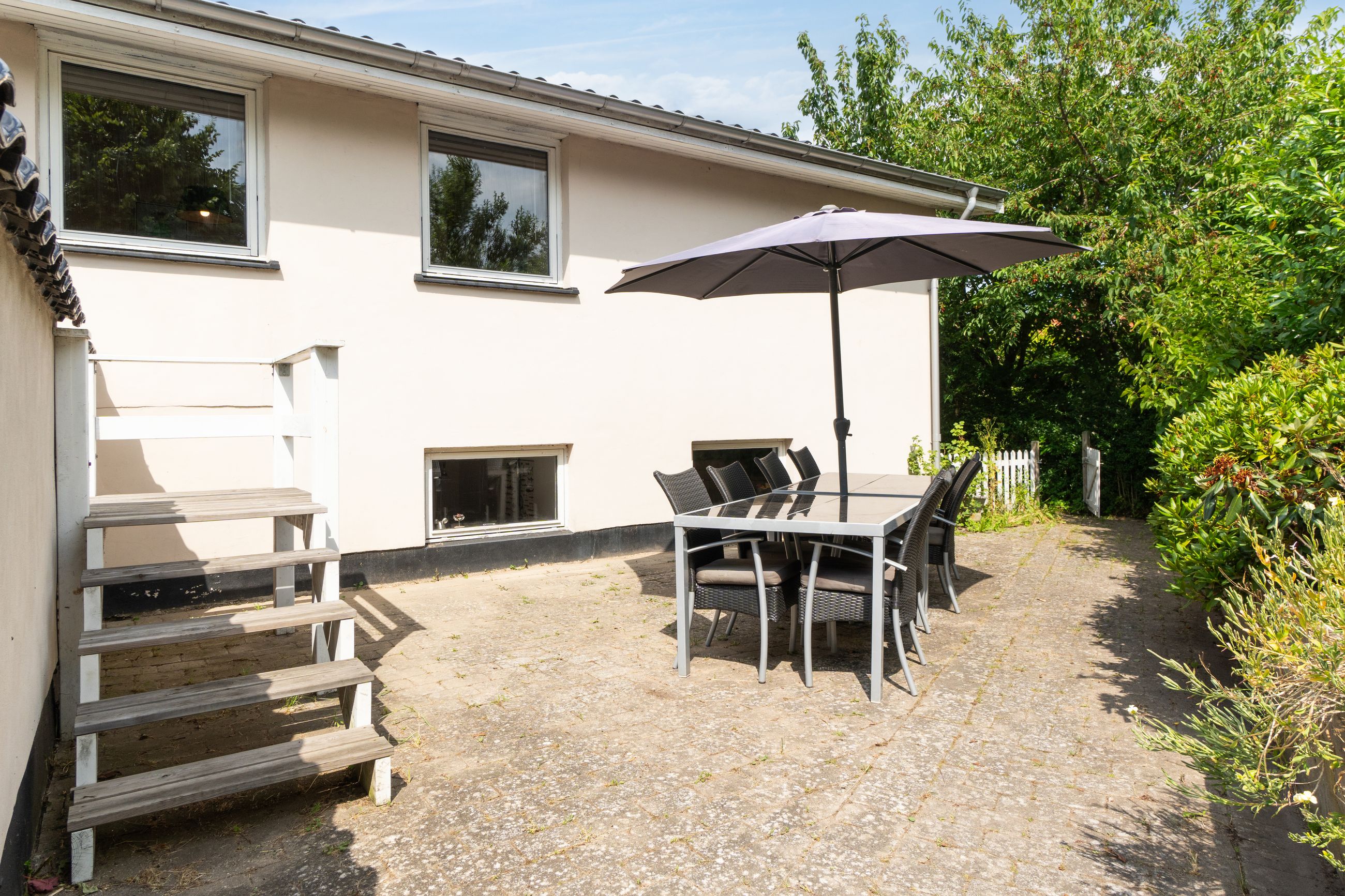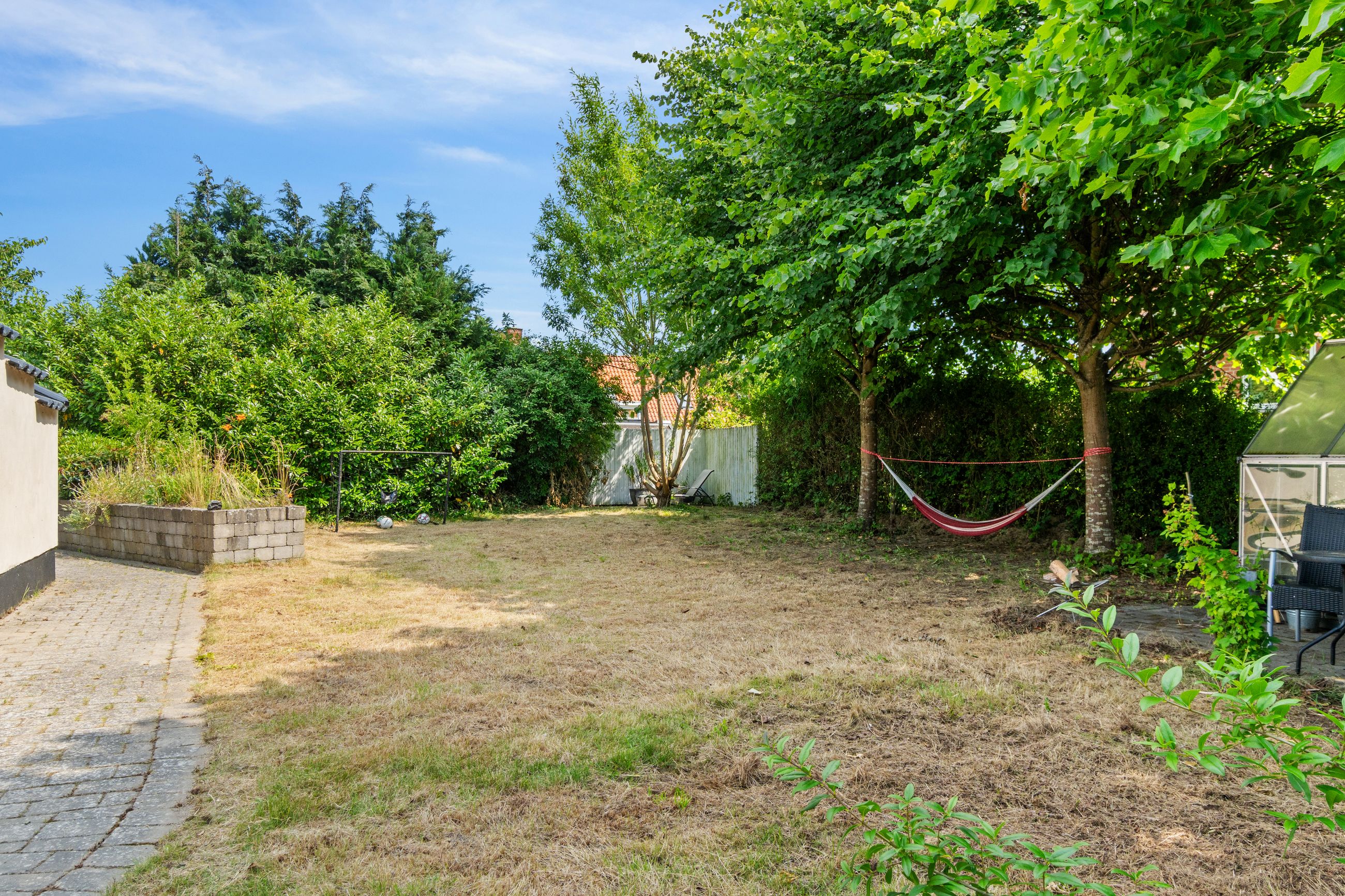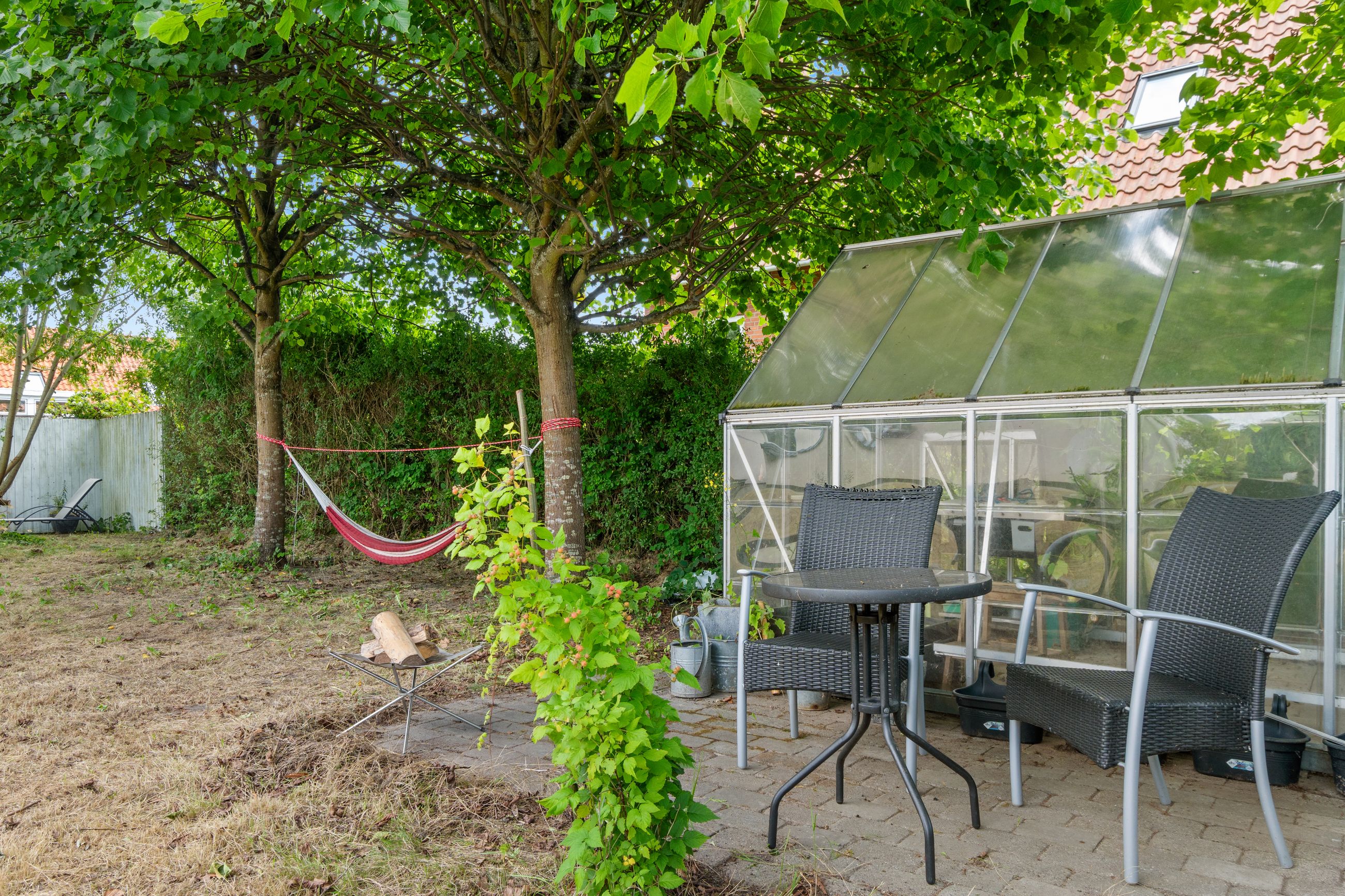 Udenfor venter en dejlig, ugeneret have med plads til leg, grill og afslapning. Grunden er stor og lukket, hvilket giver optimale rammer for udendørs aktiviteter i trygge omgivelser.