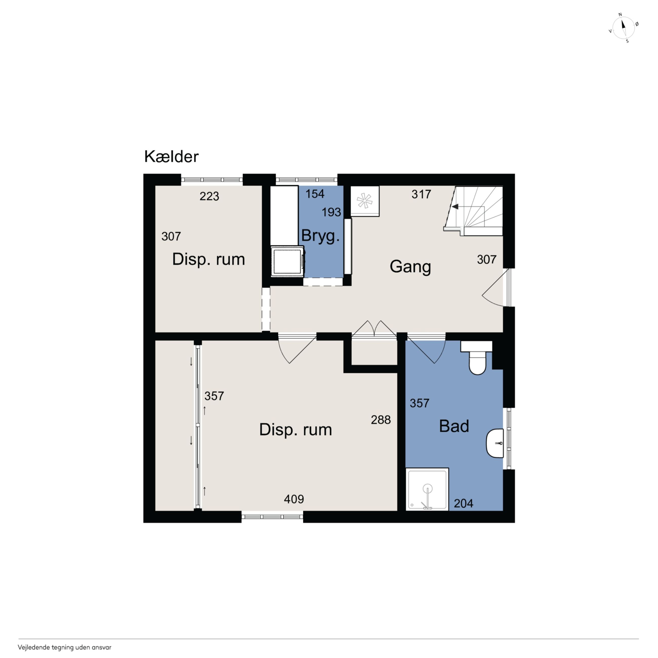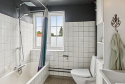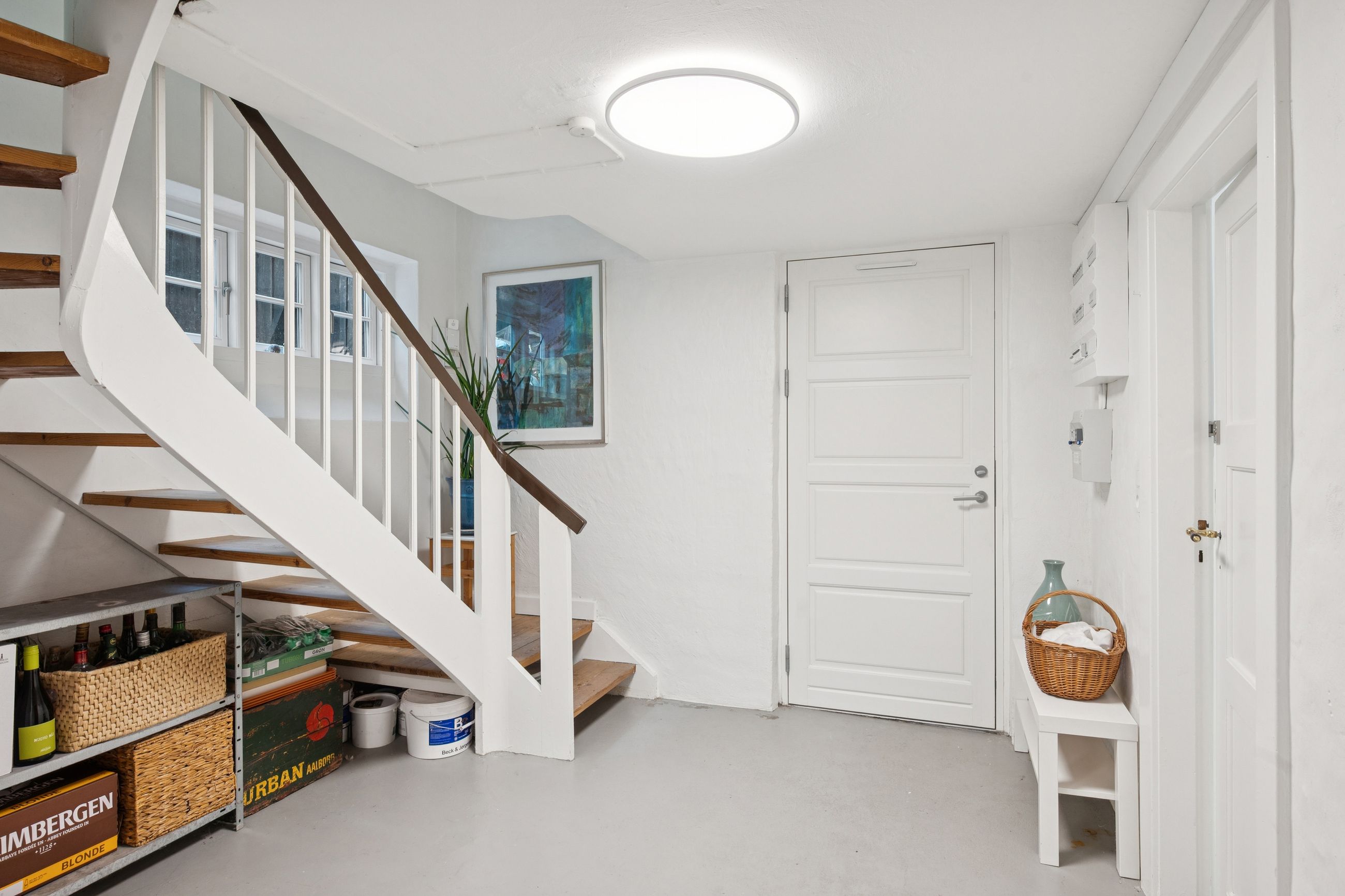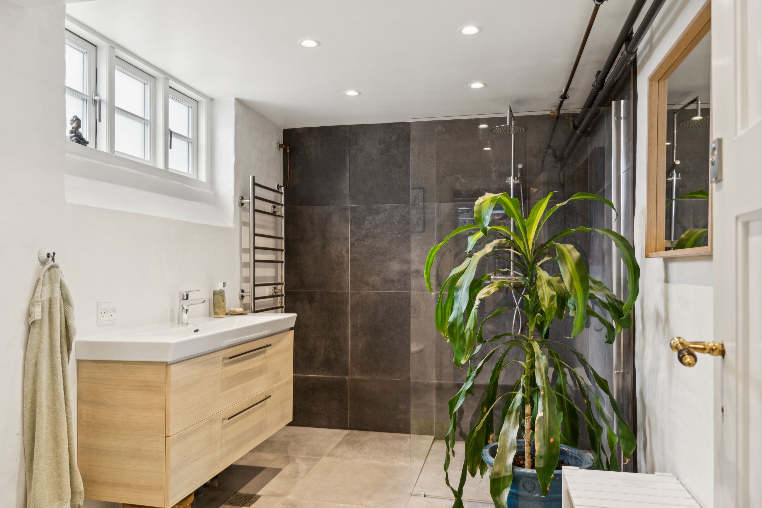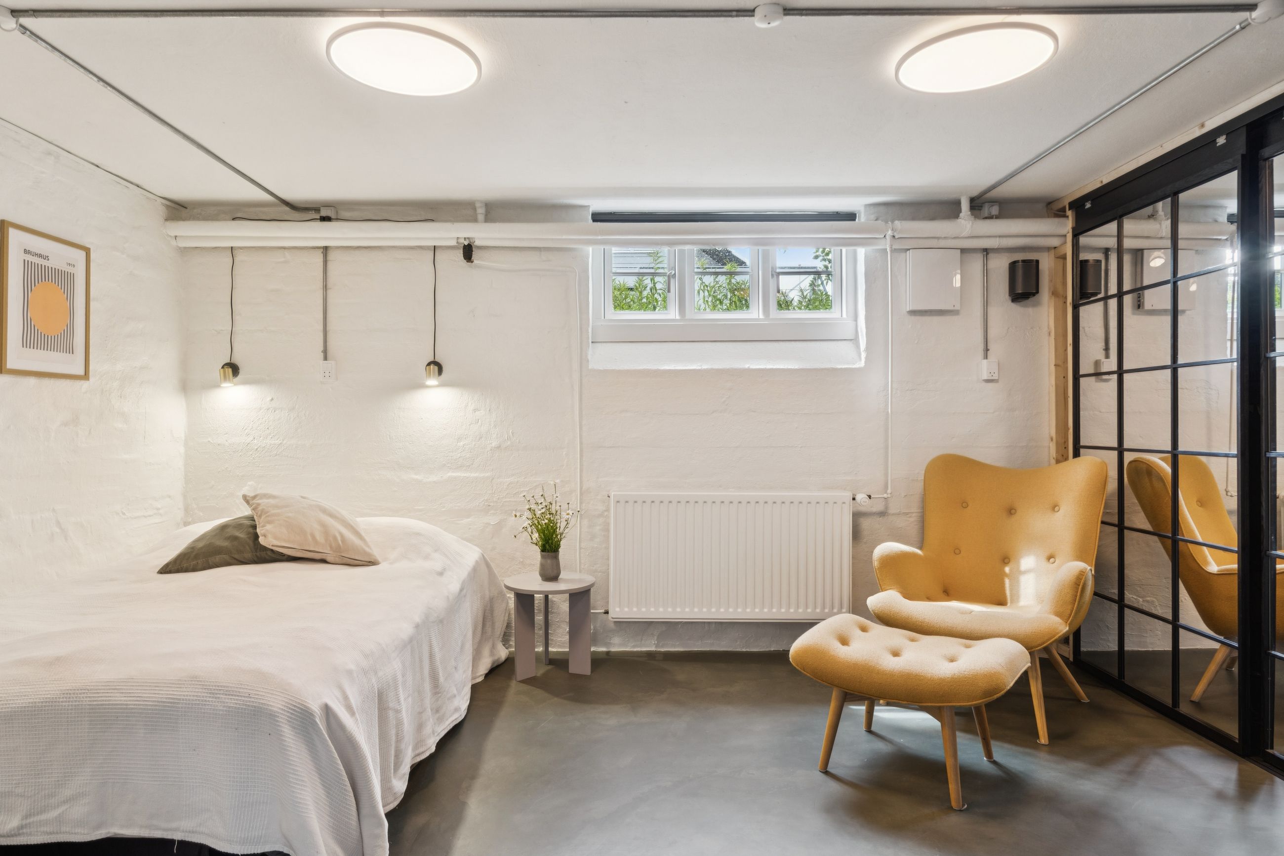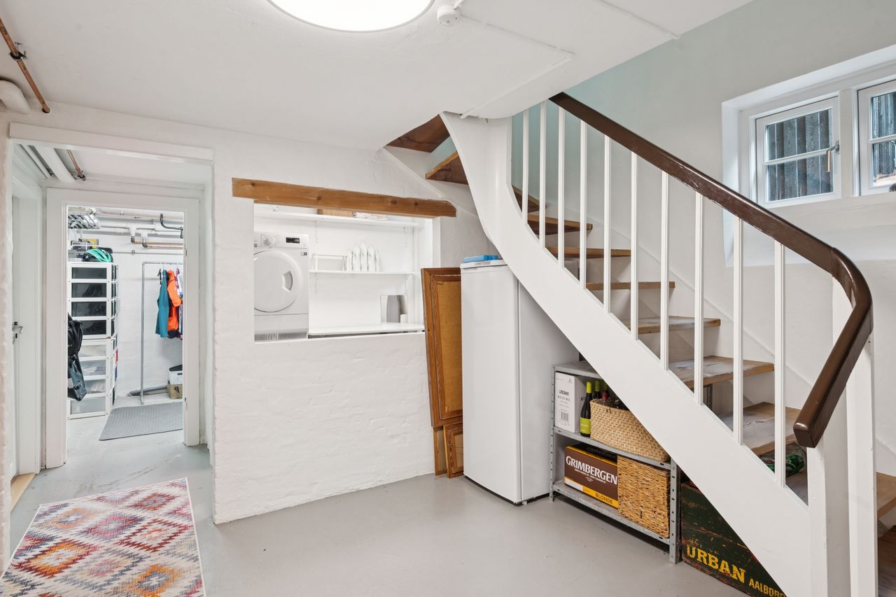 I kælderen: Trapperum med adgang til et elegant og nyere badeværelse med glasbruseniche og gulvvarme, et stort disponibelt rum / "gæsteværelse" med garderobe, fyrrum / værksted samt vaskerum.