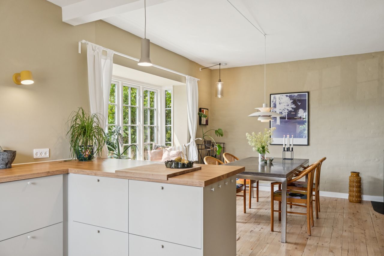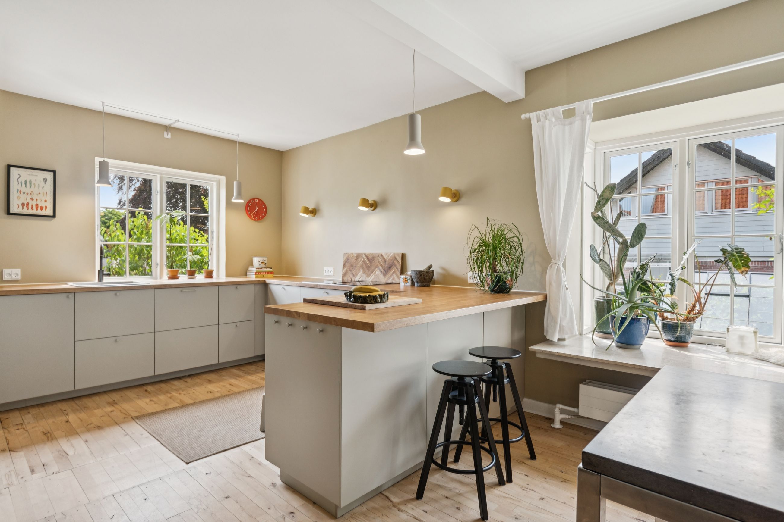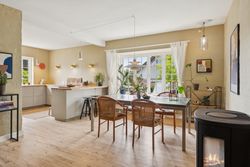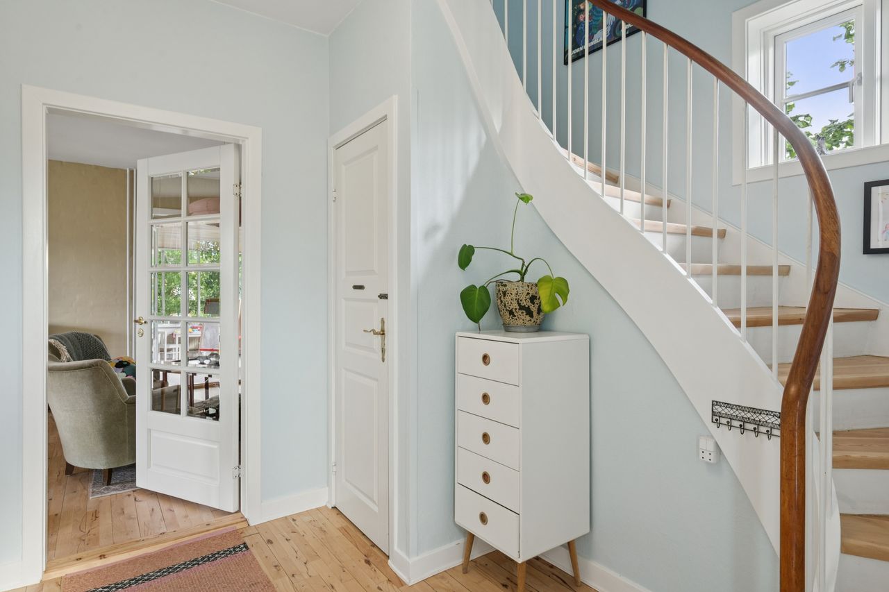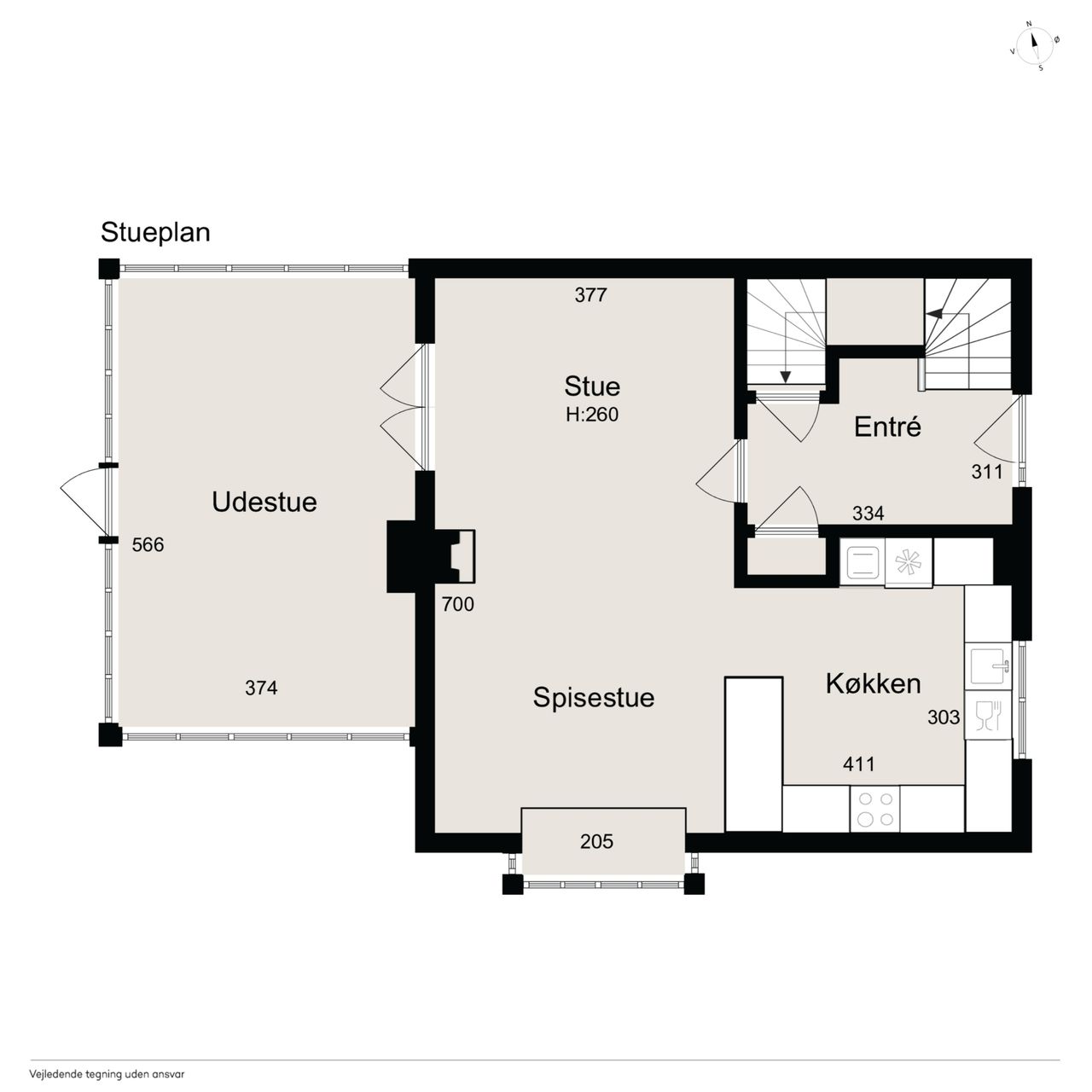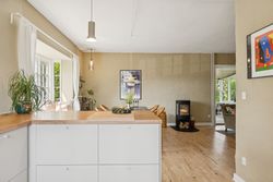 Stueplan: Det første der møder dig når du åbner hoveden er entreen med en flot svunget trappe til 1. sal og kælderen. Fra entreen er der adgang til opholdsstuen som er i åben forbindelse med det helt nye og meget flotte køkken. Stuen, som har en godkendt brændeovn, er nærmest forlænget med en stor havestue med en skøn udsigt til haven som er let kuperet og med flotte høje træer.