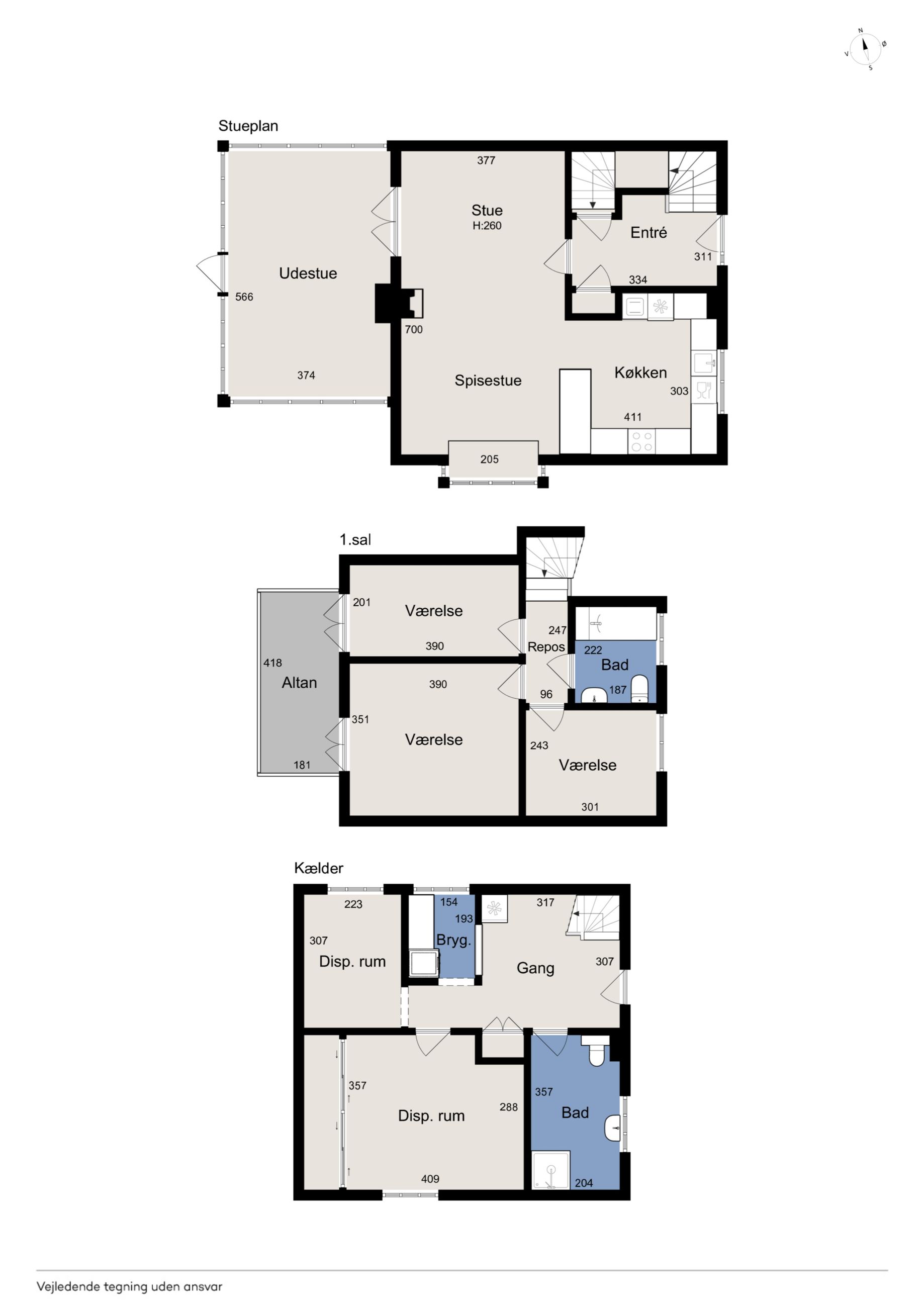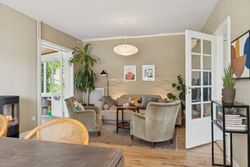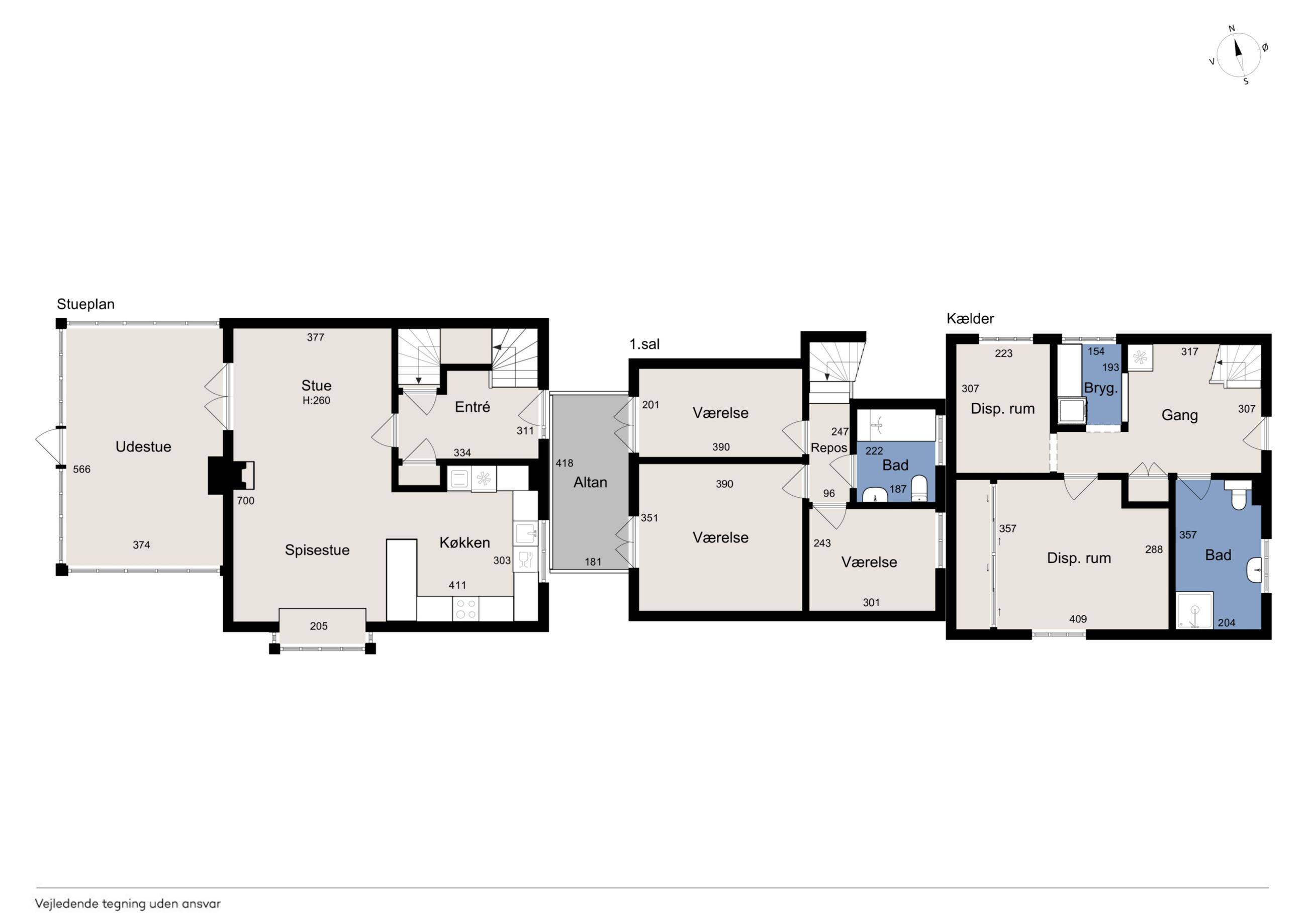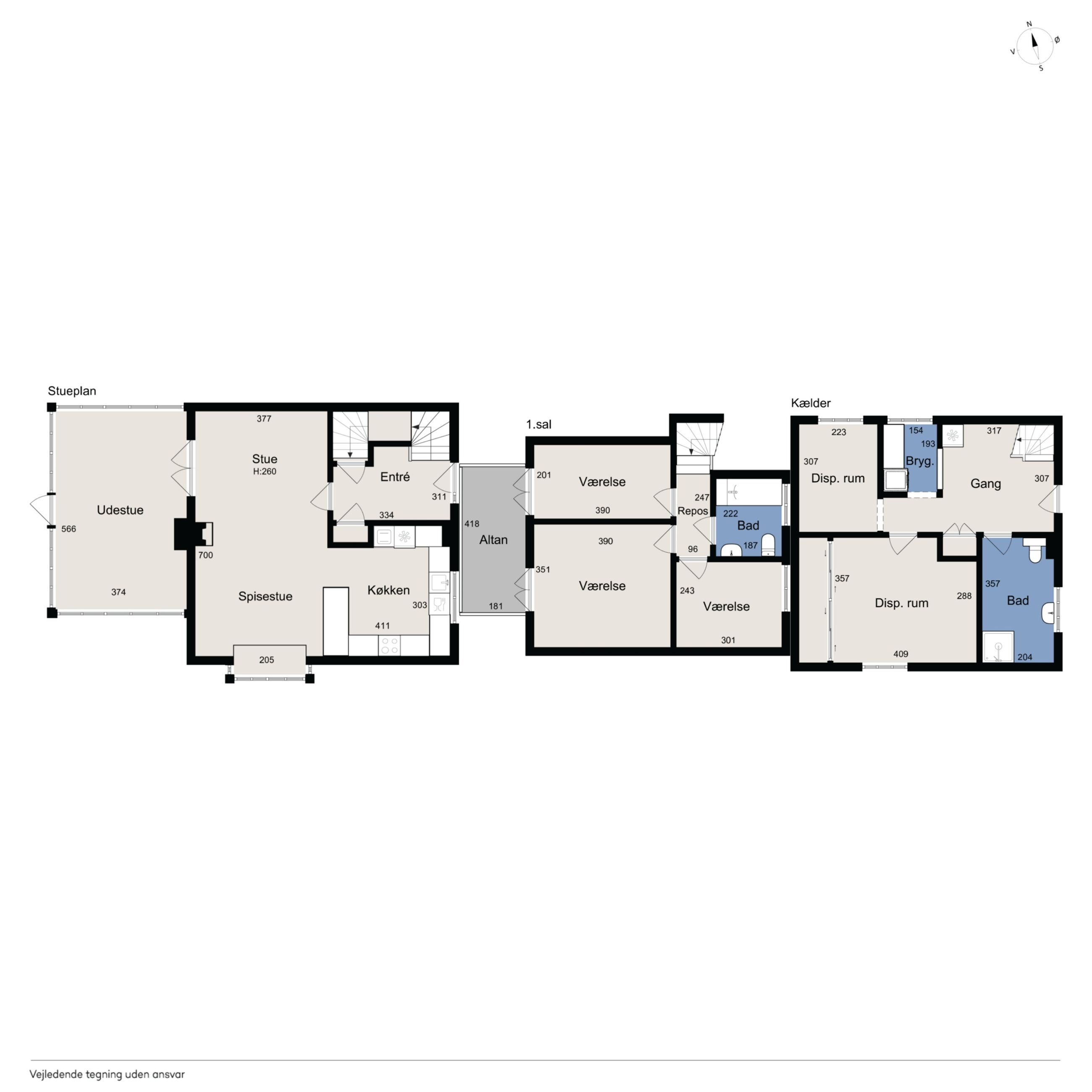 Stueplan: Det første der møder dig når du åbner hoveden er entreen med en flot svunget trappe til 1. sal og kælderen. Fra entreen er der adgang til opholdsstuen som er i åben forbindelse med det helt nye og meget flotte køkken. Stuen, som har en godkendt brændeovn, er nærmest forlænget med en stor havestue med en skøn udsigt til haven som er let kuperet og med flotte høje træer.